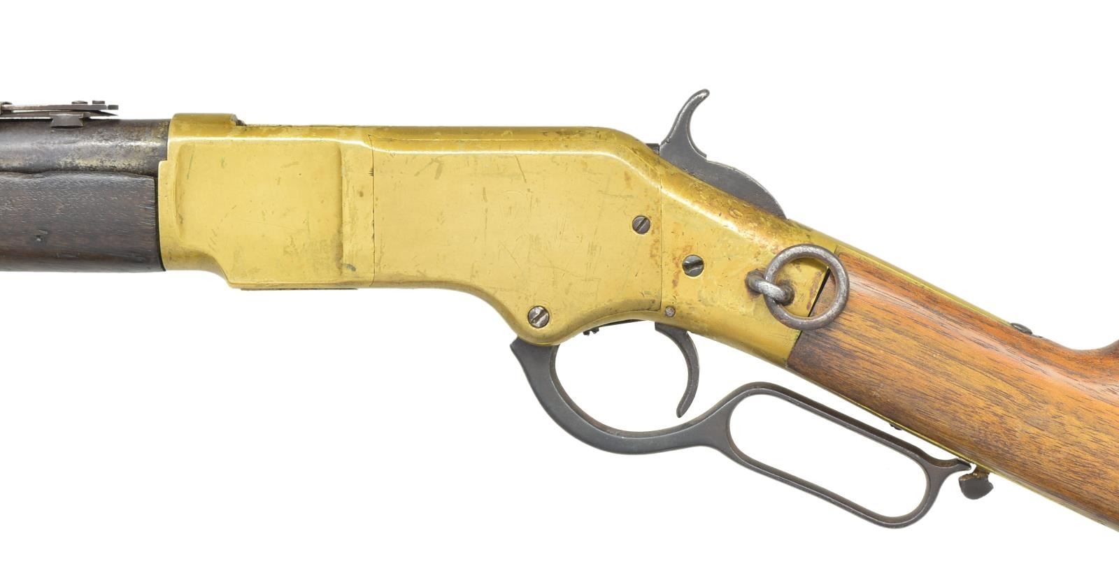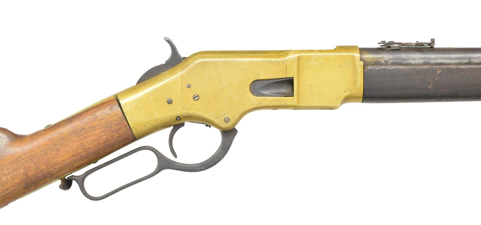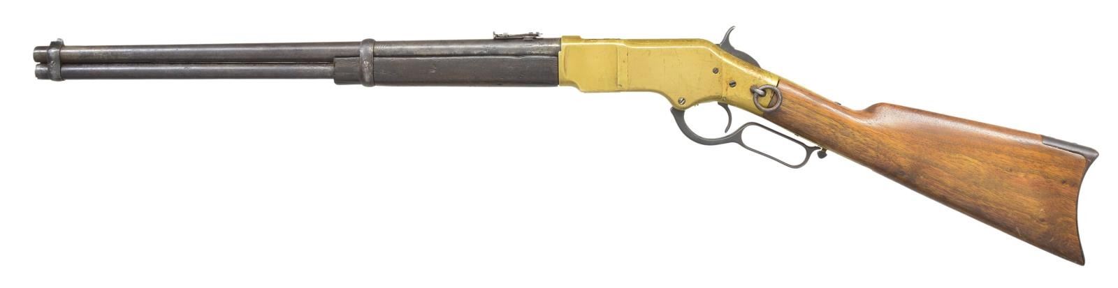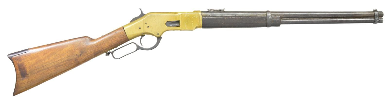 Cal. 44 HRF. S# 153491. Bbl. 20” round. Band mounted blade front sight. Later style carbine leaf rear sight is reverse mounted. Full length mag. Brass action w/ saddle ring & staple on left side. Non-original short band-fastened walnut forearm. Replacement walnut rifle stock w/ crescent steel buttplate. Mfg. 1880. CONDITION: bbl. & mag. tube have dark appearance w/ scattered pitting having a series of small dents around forend band. Action has coating of lacquer giving it a unnatural gold color. Forearm shows heavy wear & age darkening w/ chips, dents & marks. Replacement stock shows scattered scratches & has poor fit to frame. Lever latch is a replacement. Trigger pull is unnaturally hard. Dark pitted bore. PROVENANCE: From the Lifelong Collection of Glen E. Mattox. (01-22533/DS). ANTIQUE. $2,500-3,500.