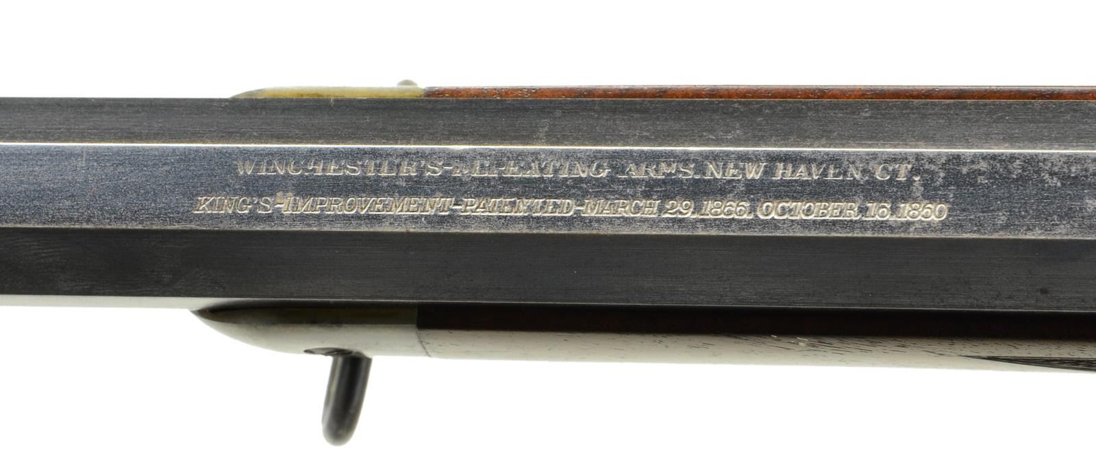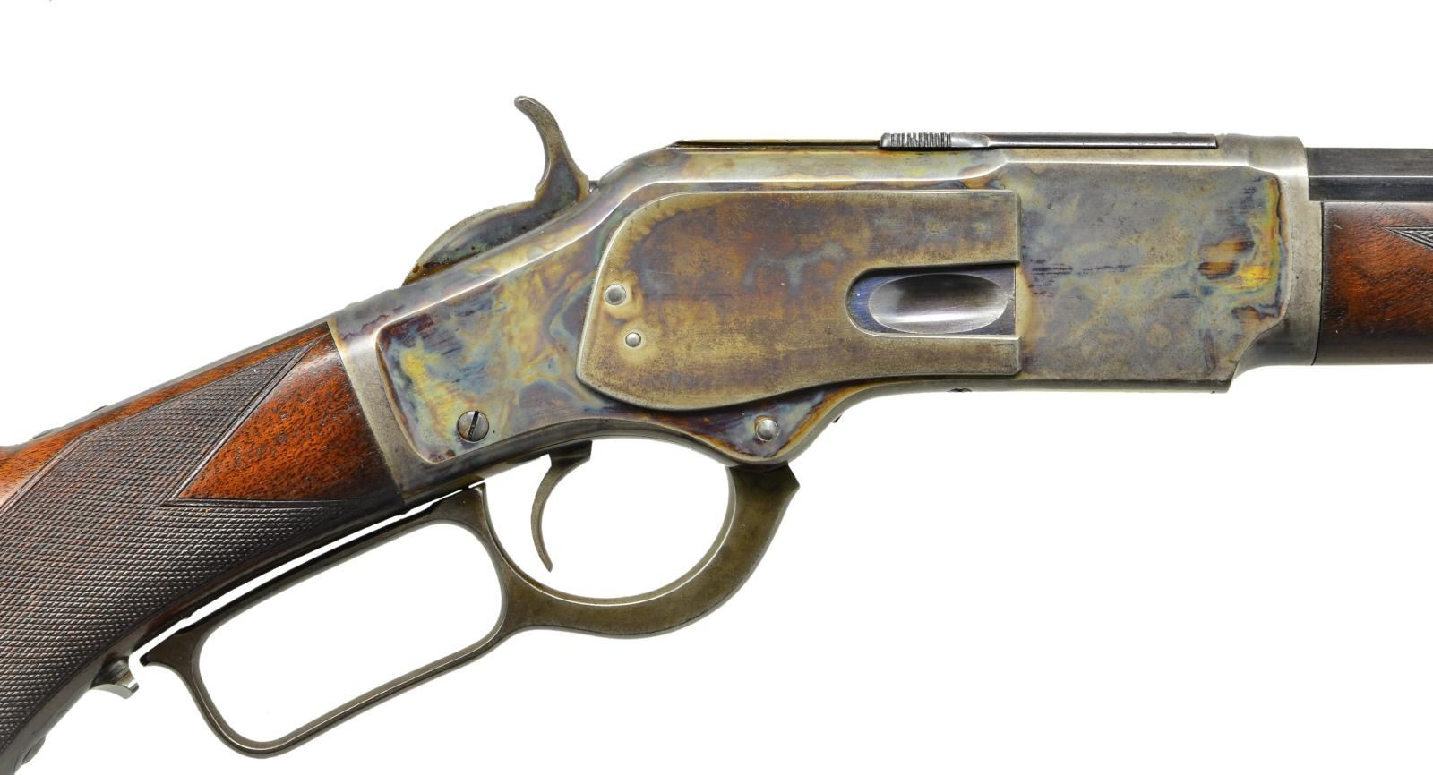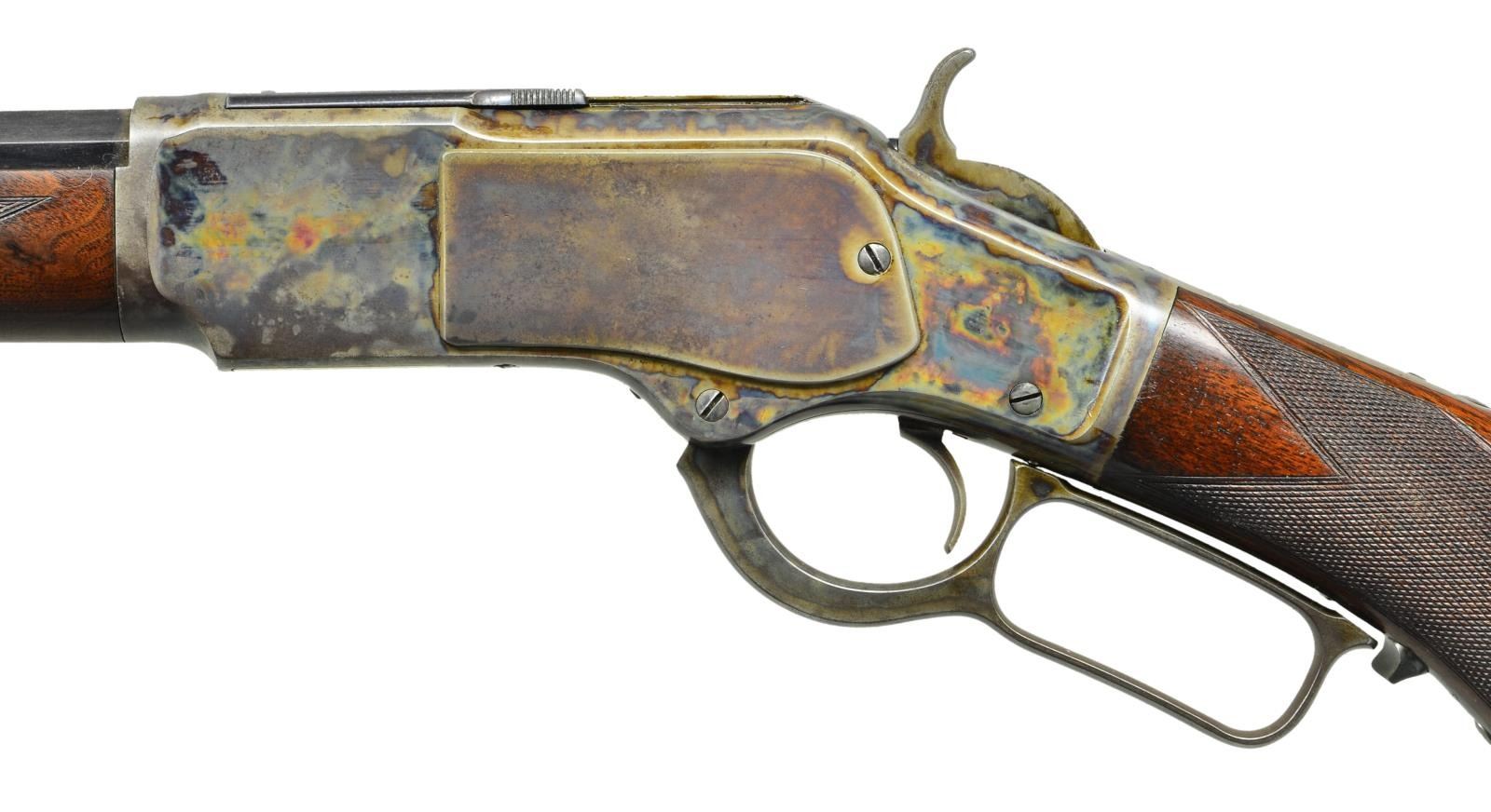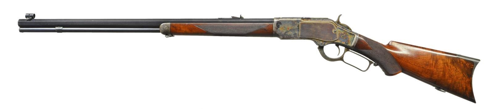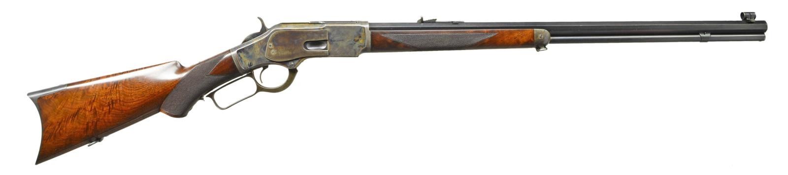 ACTION RIFLE. Cal 32 WCF (32-20). S# 107987A. Bbl. 24" octagon. Globe front sight with elevator adjustable sporting rear sight. Full length tubular magazine. Case colored action, hammer, lever and trigger with blued loading gate and dust cover. Front receiver ring is rebated. Walnut forearm and pistol grip stock with ebony insert of fancy walnut have style “H” factory checkering and case colored crescent steel buttplate. Case colored forearm cap and toeline of stock have factory sling swivels. Left inside of lower tang has “X” wood grain marking followed by assembly number “4587” followed by “3 PR”. Top tang channel of stock has matching assembly number. CONDITION: very fine. Bbl. and mag. tube retain over 98% blue showing light edge and carry wear. Action retains over 97% bright original case colors showing spots of freckling. Brass cartridge lifter has a pleasing mustard patina. Original wood finish shows areas of wear with scattered scratches and marks. Crisp mechanics. Front sight insert is missing. Bore retains strong rifling, showing scattered spots of light pitting. (01-22293/DS). ANTIQUE. $25,000-35,000.