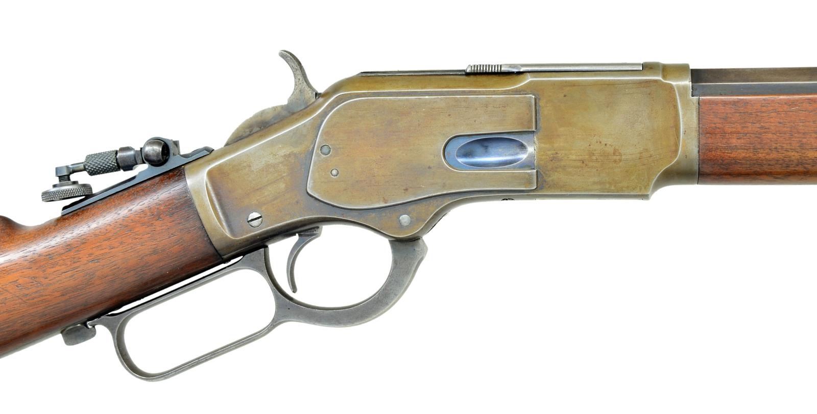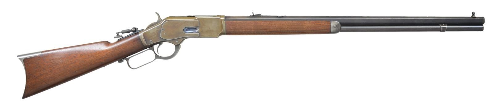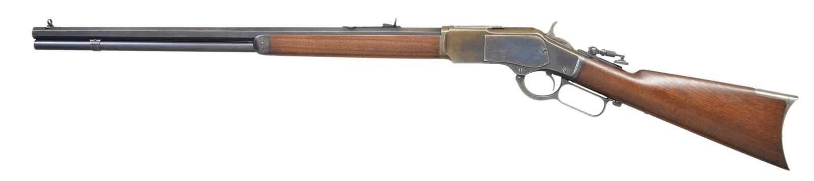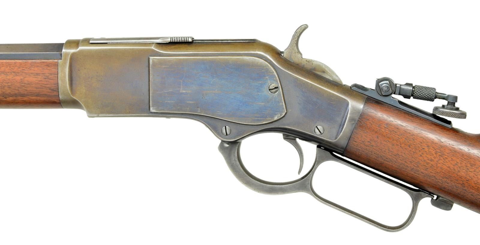 Cal. 38 WCF. S# 212893B. Bbl. 24" octagon. Combination front sight, original sporting rear sight w/ a modern Lyman combination tang sight having a large adj. disc. Full length mag. Blue finished w/ case colored lever & crescent steel trap door buttplate. Walnut forearm & straight grip stock. Mfg. 1886. UNATTACHED ACCESSORIES: combination screwdriver & oiler held in the stock compartment. CONDITION: fine. Bbl. & mag. tube retain over 70% lightly faded blue. Action retains good blue in some areas w/ majority fading to brown. Hammer & lever retain small amounts of case colors. Lightly worn original wood finish shows scratches & marks. Bore is generally bright w/ strong rifling showing scattered very light pitting. (01-23010/DS). ANTIQUE. $2,000-2,750.