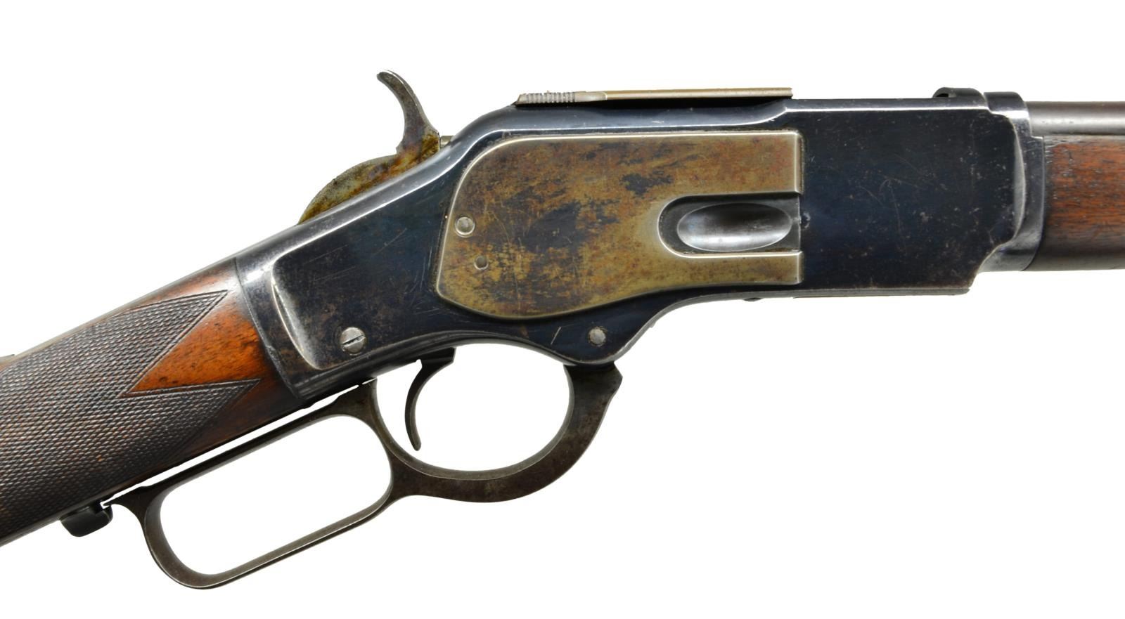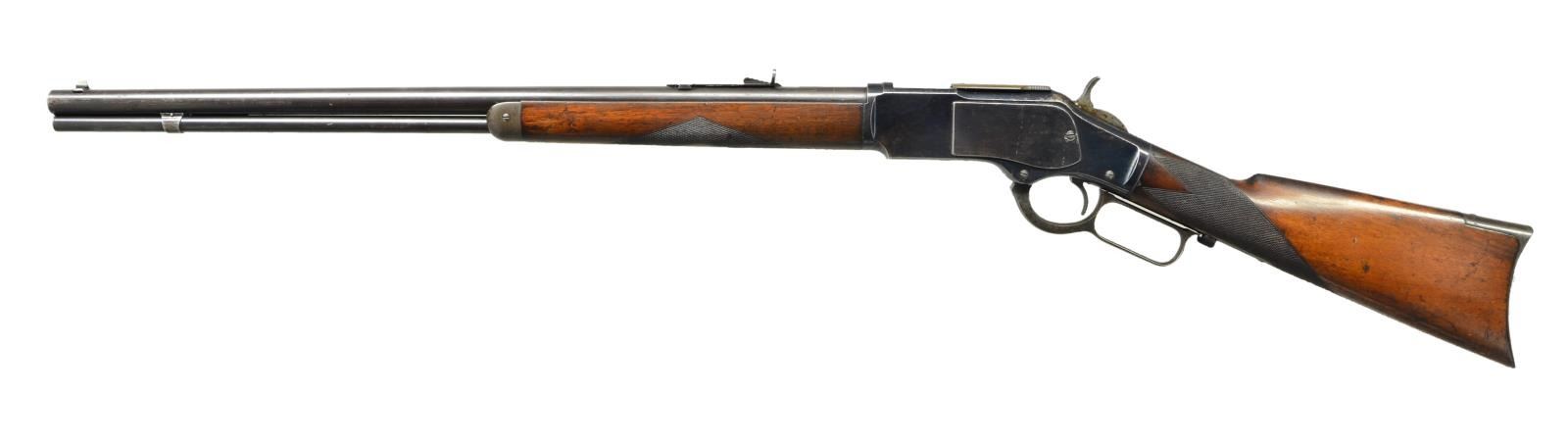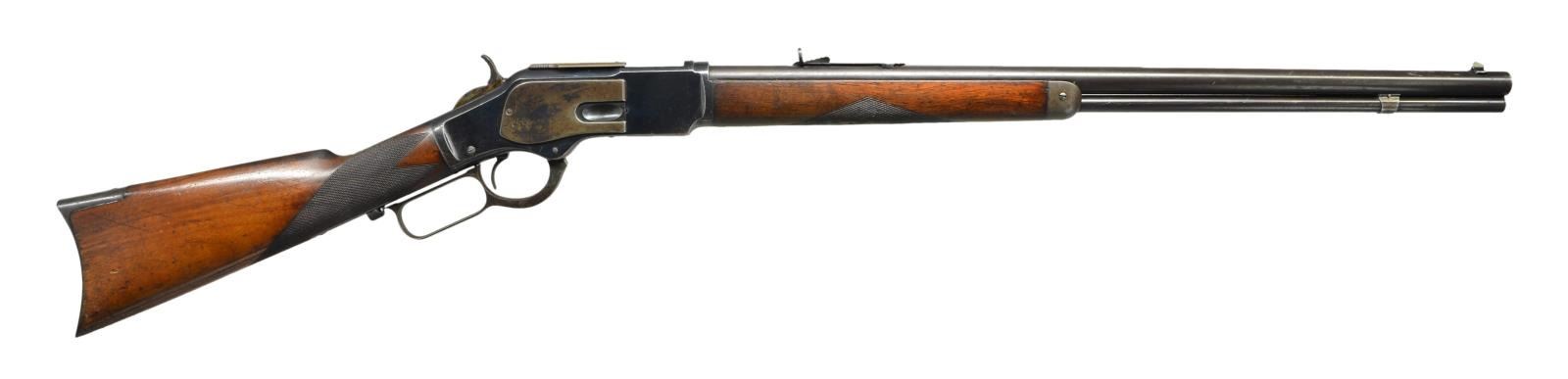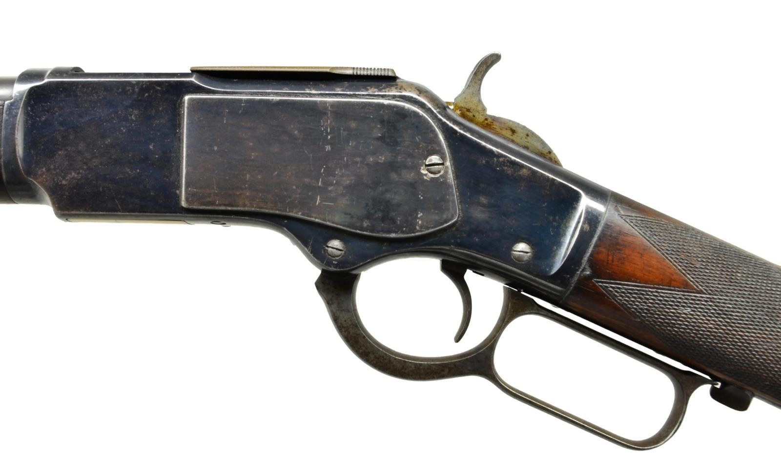 Cal. 32 WCF. S# 257574B. Bbl. 24" round w/ original sporting sights. Full length mag. Blue finish w/ case colored hammer, lever & crescent buttplate. Walnut forearm & straight grip stock have added checkering. Mfg. 1888. CONDITION: fine. Bbl. & action retain over 70% dull blue w/ fading on sideplates & dust cover. Hammer & lever retain some visible case colors. Worn original wood finish shows numerous scratches, dents & marks. Bore retains sound lightly worn rifling. (01-23009/DS). ANTIQUE. $1,500-2,250.