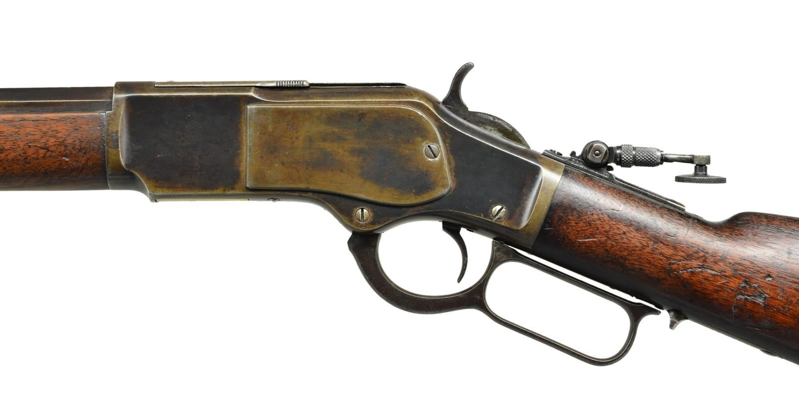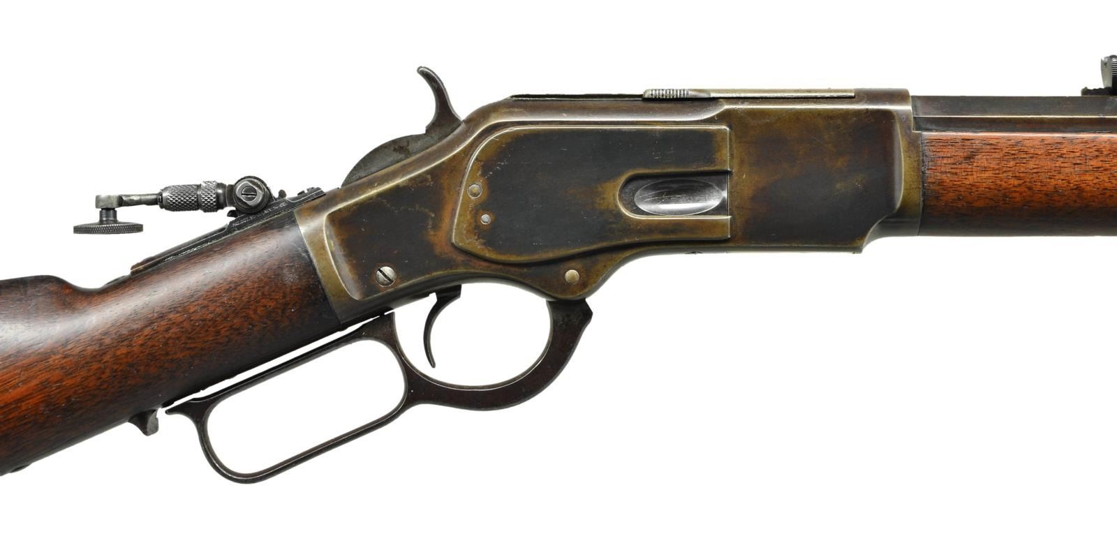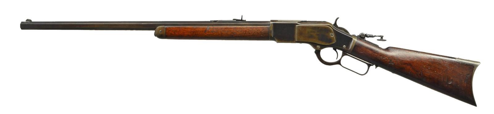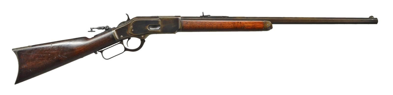 Cal. 44 WCF. (44-40). S# 191331B. Bbl. 24’’ heavy octagon. Lyman no. 4 gold bead hunting front sight, original sporting rear sight. Marble’s combination tang sight. Button mag. Walnut forearm & straight grip stock w/ crescent steel trap door buttplate. Mfg. 1891. UNATTACHED ACCESSORIES: oiler tube held in stock compartment. CONDITION: metal has blue/brown coloration indicating touch up finish. Forearm is lightly sanded & refinished showing numerous dents & marks. Stock has worn finish w/ numerous scratches, dents & marks. Bore shows scattered light pitting & retains sound rifling. (01-22667/DS). ANTIQUE. $1,200-1,800.
