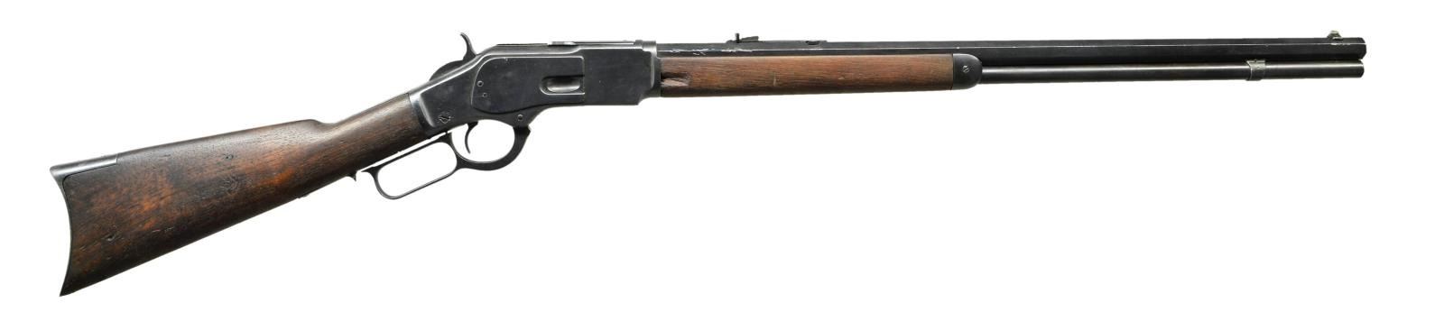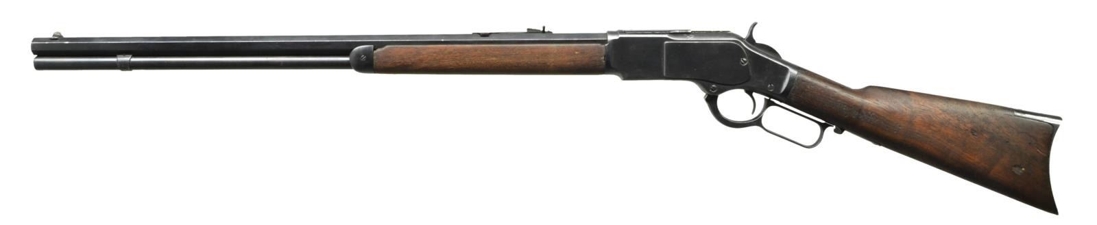 Cal. 38 WCF. S# 414141B. Bbl. 24" octagon with sporting sights. Full length mag. Walnut stock and forearm with crescent steel buttplate. 1892 mfg. CONDITION: metal shows a dull reblued finish over unpolished metal retaining dents, scratches, pitting, and marks. Replacement dust cover. Wood shows heavy wear with numerous dents and marks having chips and cracks around action. Functioning action. Bore retains intact rifling. (01-22037/DS). ANTIQUE. $700-1,000.