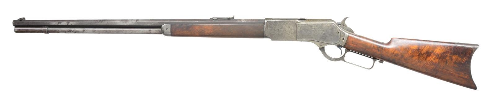 Cal. 45-75. S# 48613. Bbl. 28" octagon. Rocky mountain front sight with graduated leaf rear sight. Full length mag. Blue barrel and mag with case colored action. Single set trigger. Stock set of unusually well grained walnut with trapdoor crescent steel buttplate. 1884 mfg. UNATTACHED ACCESSORIES: four piece steel cleaning rod held in stock compartment. CONDITION: metal finish has faded to a mottled gray blending with areas of dark patina. Receiver retains traces of case colors. Trigger will not set properly. Unsanded wood has moderately worn finish showing scattered scratches, marks and small dents. Bore has slightly darkened appearance retaining sound rifling. (01-20188/DS). ANTIQUE. $2,750-3,750.