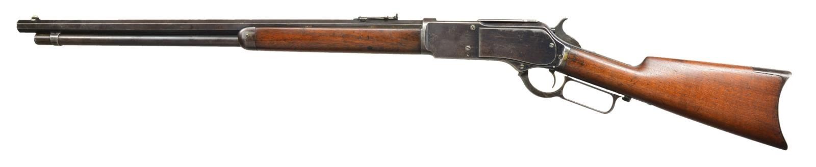 CONVERSION RIFLE. Cal. Converted to 45 Colt from original 45-75 chambering. S# 61206. Bbl. octagon shortened at breach end for rechambering to 25" length. Mag tube is shortened to 23 1/8". Action has screws on sides to hold blocks to allow chambering of the shorter cartridge. Sporting front sight with graduated leaf rear sight. Walnut stock set with steel trapdoor crescent buttplate. 1887 mfg. UNATTACHED ACCESSORIES: four piece steel cleaning rod held in stock compartment. CONDITION: metal retains 60% dull faded blue. Stock set has worn finish showing scratches and marks. Forearm has small plug type repair on left side. Bore retains sound rifling showing substantial leading. (01-20199/DS). ANTIQUE. $2,000-3,000.