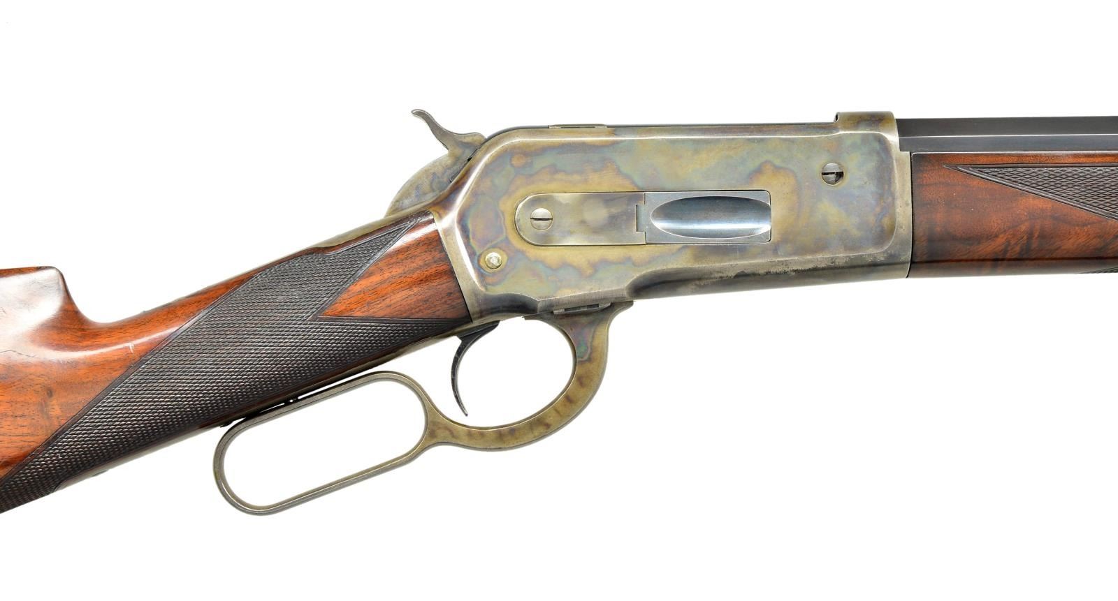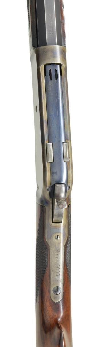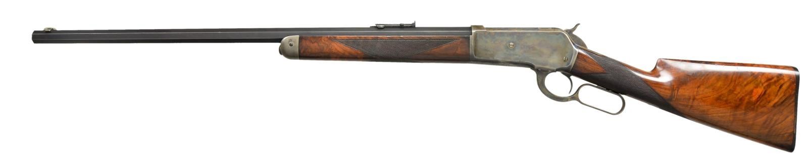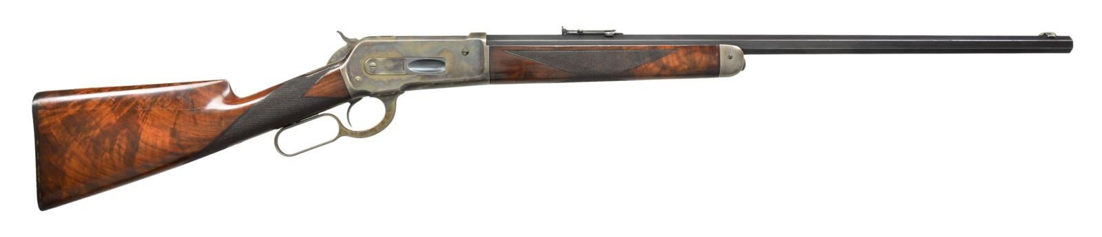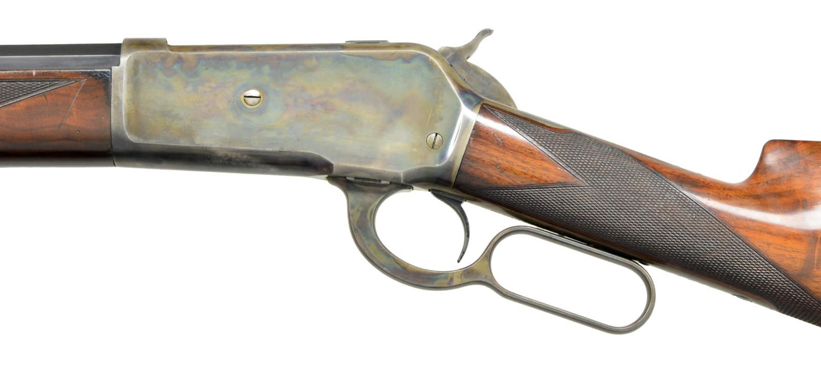 CASEHARDENED DELUXE MODEL 1886 IN DESIREABLE 45-90 CALIBER. Cal. 45-90 WCF. S# 61799. Bbl. 26" octagon. German silver blade rocky mountain front sight with graduated leaf rear sight. Button mag. Case colored action and forearm cap. Forearm and straight grip stock of fancy walnut have style “H” factory checkering and hard rubber shotgun buttplate. Left inside of lower tang stamped with “271” assembly number, followed by “XXX” wood grade marking, followed by “SRB”. Top tang channel of stock has matching “271” assembly number. UNATTACHED ACCESSORIES: Cody firearms records check stating: "Type: Rifle / Caliber: 45-90 / Barrel Type: Octagon / Trigger: Plain / Checkered stock / 1/2 Magazine / Shotgun butt, rubber butt plate / Received in warehouse on September 16, 1891 / Shipped from warehouse on September 16, 1891, Order number 10075". CONDITION: bbl. shows 80% dull lightly faded blue with edge wear and small marks. Action retains 80% lightly faded case colors with carry wear along lower areas. Original wood finish shows scattered scratches and marks. Sound action. Bore retains good rifling showing scattered light pitting. (01-21905/DS). ANTIQUE. $12,000-18,000.