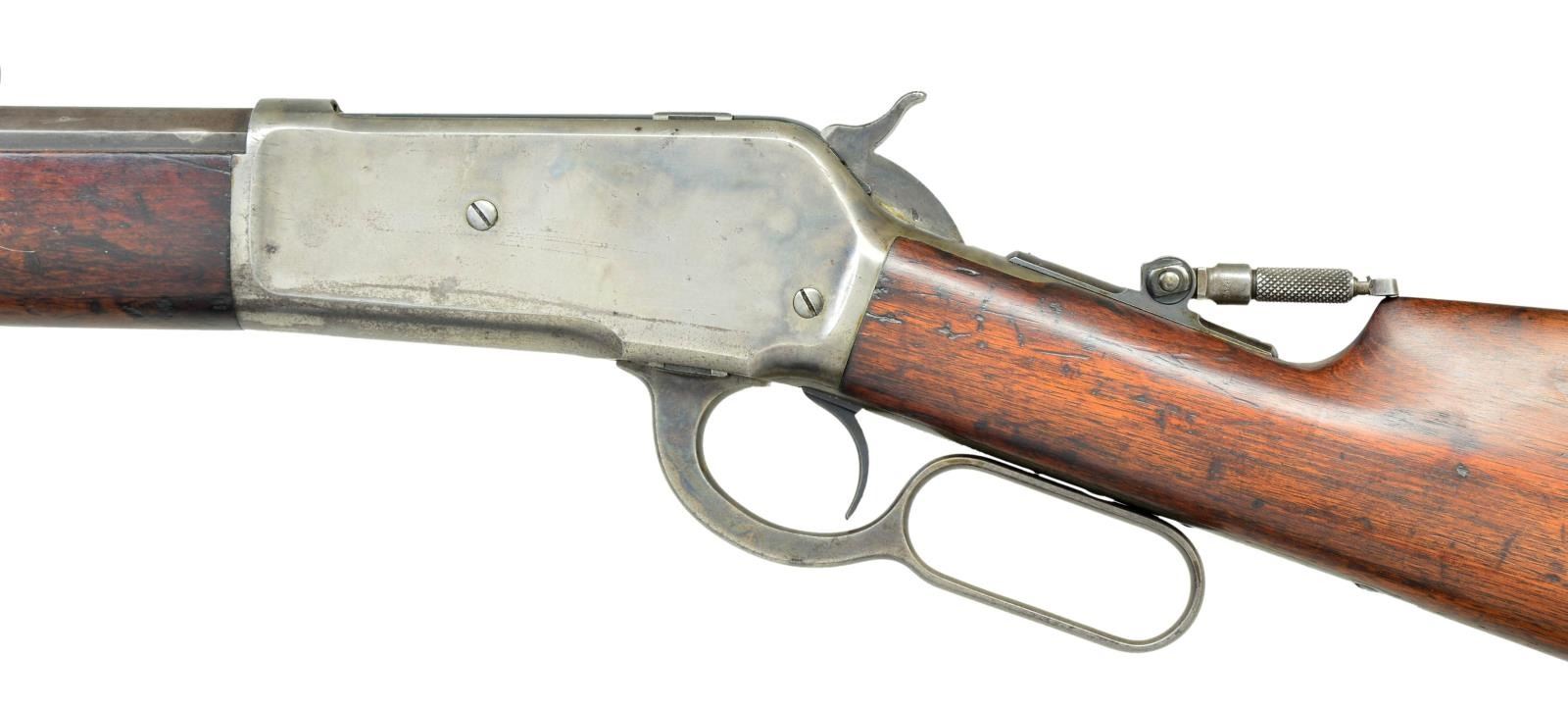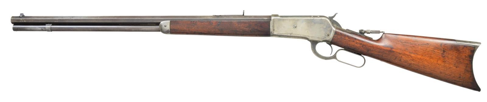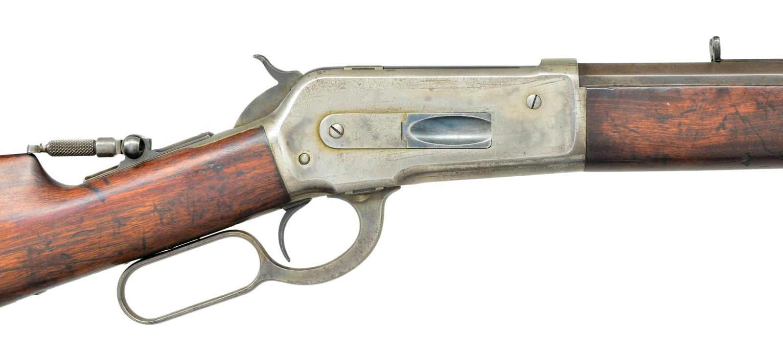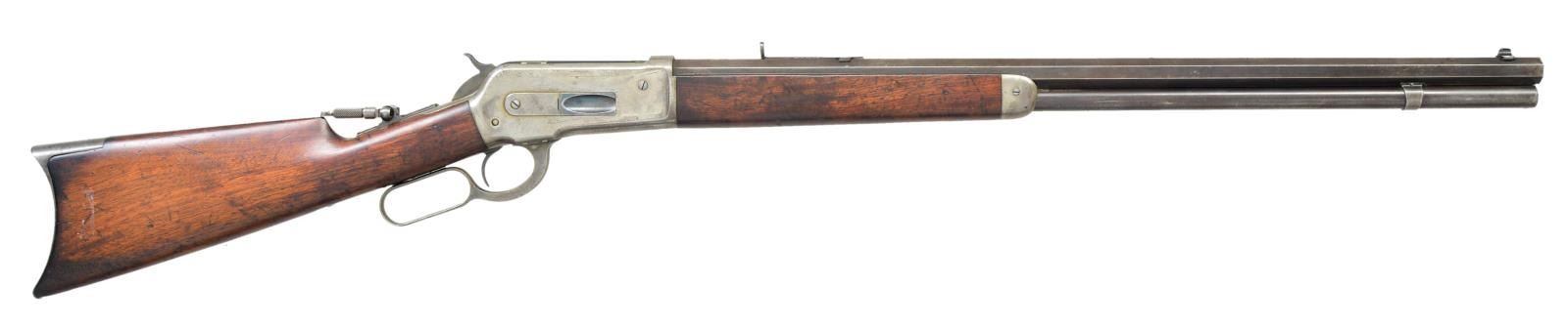 Cal. 40-82 WCF. S# 76586. Bbl. 26” octagon. Bead front sight, sporting rear sight w/ combination tang sight. Full length mag. Blue finish w/ case colored action. Walnut forearm & straight grip stock w/ crescent steel buttplate. Mfg. 1893. CONDITION: bbl. & mag. tube retain 30% dull fading blue. Action retains 20% lightly visible case colors fading to silver gray. Original wood finish shows wear & dark spots w/ numerous scratches, marks & dents. Front sight has broken bead, rear sight elevator. Lightly pitted bore retains good rifling. PROVENANCE: From the Lifelong Collection of Glen E. Mattox. (01-22521/DS). ANTIQUE. $2,000-3,000.