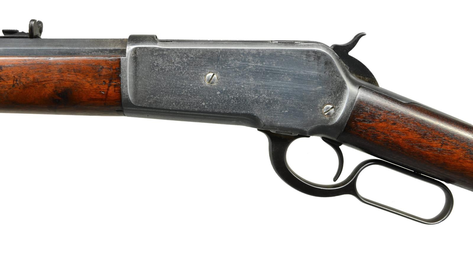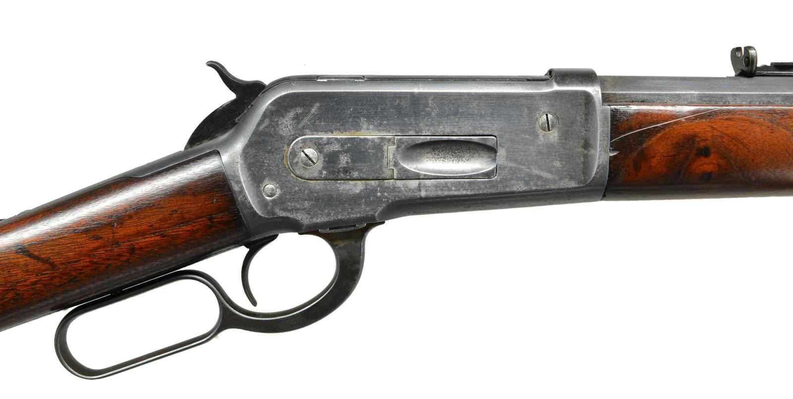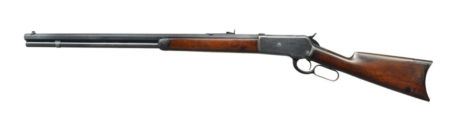 Cal. 45-90. S# 93665. Bbl. 26” octagon. Front sight has broken bead, sporting rear sight has replacement elevator. Full length mag. Walnut forearm & straight grip stock w/ crescent steel buttplate. Mfg. 1894. CONDITION: metal retains 70% dull fading reblued finish over general light pitting. Sanded & refinished wood has dark worn appearance w/ small chips, heavy dents, handling marks & scratches. Lightly pitted bore retains largely intact rifling. (01-22996/DS). ANTIQUE. $1,500-2,000.