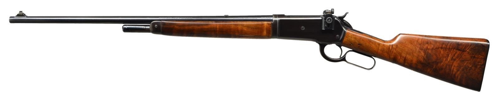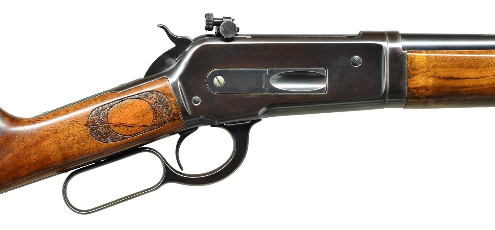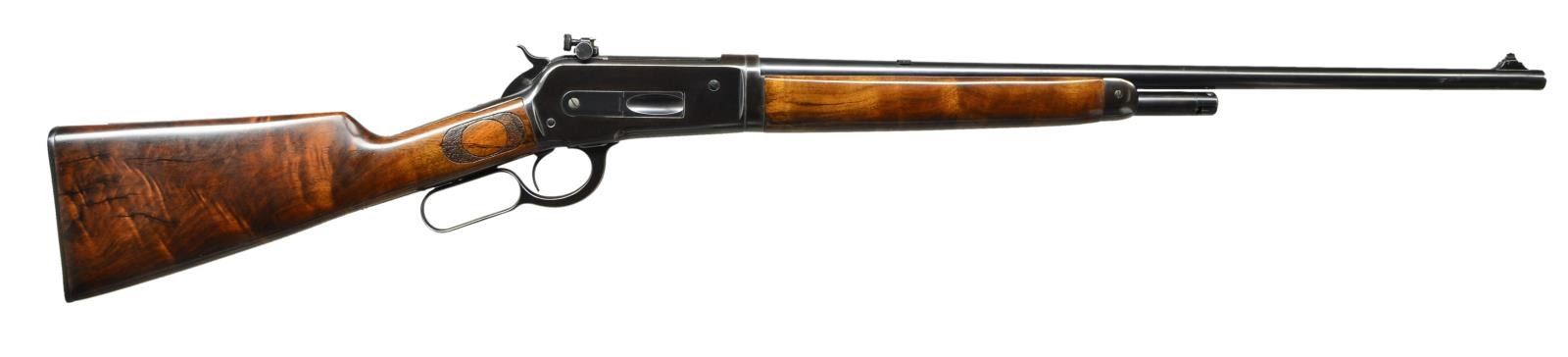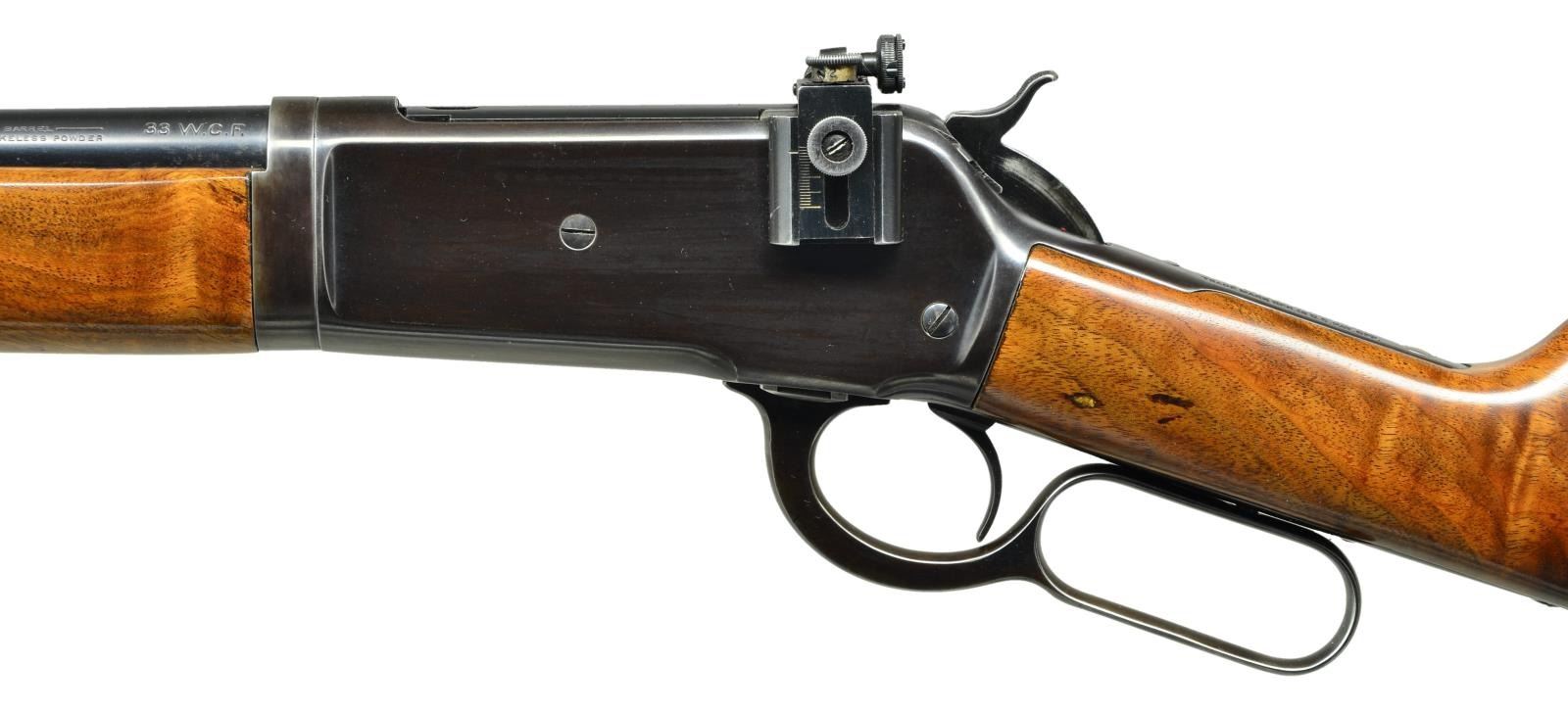 RIFLE. Cal. 33 WCF. S# 157860. Bbl. 24" tapered round. Ramp mounted bead front sight, filler in rear dovetail w/ added Lyman receiver sight having adj. disc. Replacement forearm & straight grip walnut stock w/ plastic buttplate. Right wrist of stock has a stippled oval marking w/ plain center. Mfg. 1920. CONDITION: metal retains 90% lightly faded reblued finish. Custom wood finish shows small marks w/ filled grain cracks. Strong rifling. (23-300/DS). CURIO. $1,200-1,800.