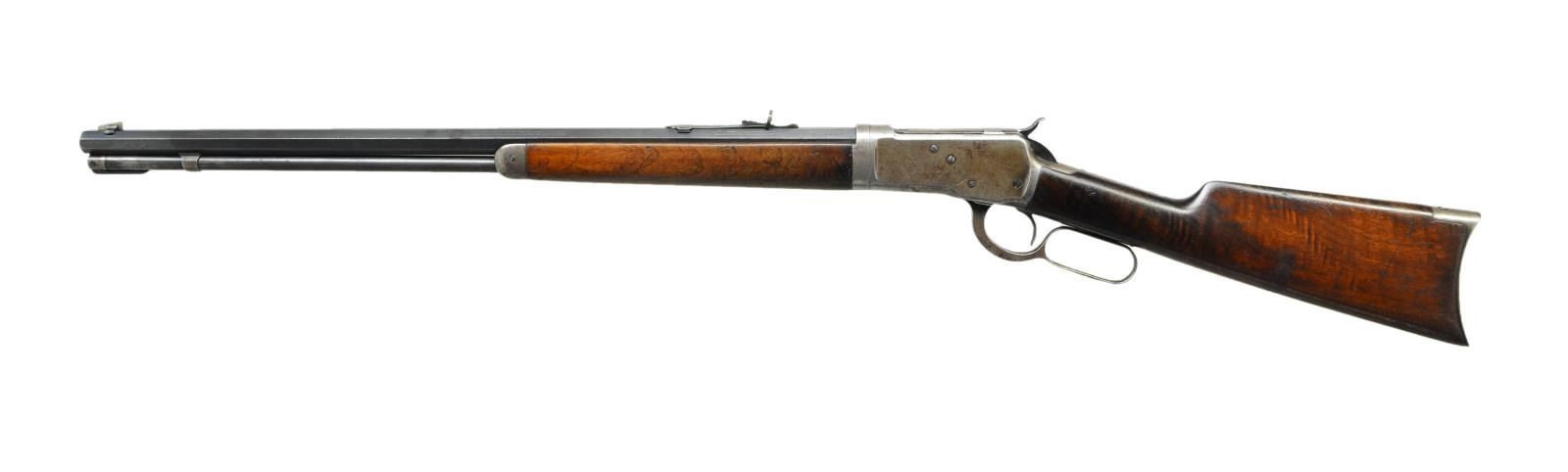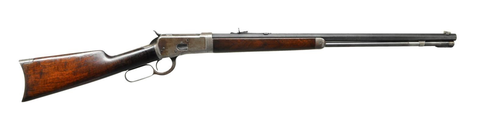 Cal. 25-20 WCF. S# 419593. Bbl. 24" octagon w/ German silver blade rocky mountain front sight & sporting rear sight. Full length takedown mag. Walnut forearm & straight grip stock w/ crescent steel buttplate. Mfg. 1907. CONDITION: bbl. & mag. tube retain over 50% lightly faded blue showing signs of corrosion. Action is fading to gray. Wood has dark worn appearance w/ numerous scratches, dents & marks. Takedown bbl. is loose on frame & in need of adj. Bore retains lightly worn rifling. (23-450/DS). CURIO. $1,200-1,800.
