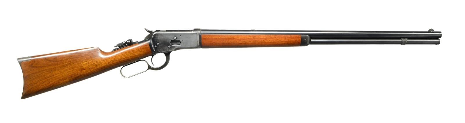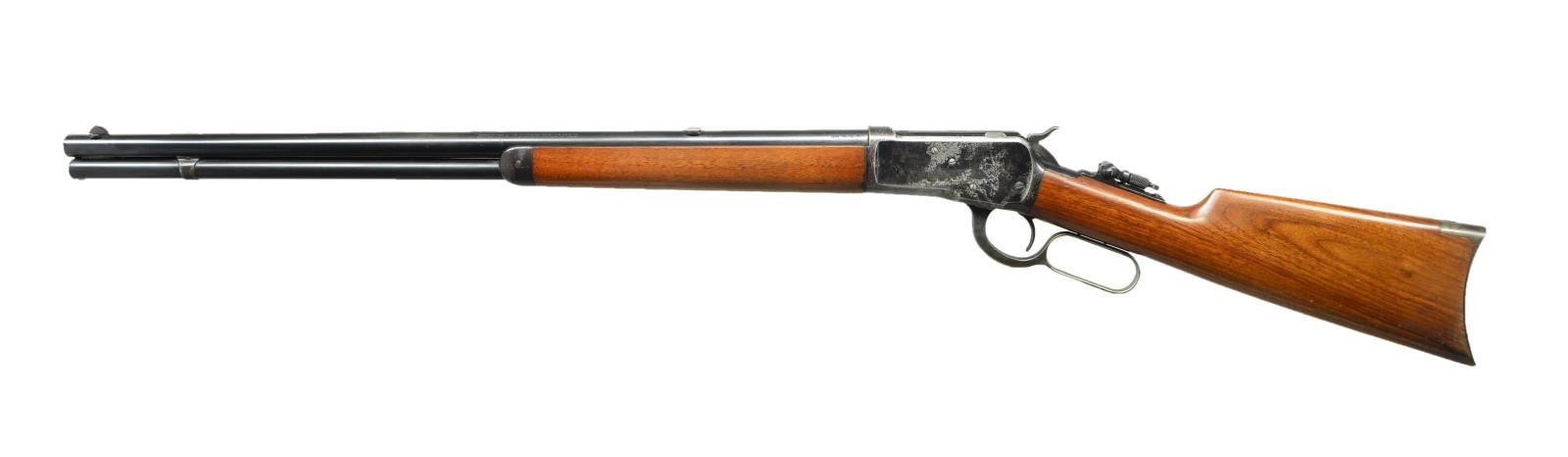 Cal. 38 WCF (38-40). S# 654319. Bbl. 24" round. Lyman no. 4 hunting white bead front sight, filler in rear dovetail w/ combination tang sight. Full length mag. Blue finish. Walnut forearm & straight grip stock w/ crescent steel buttplate. Mfg. 1912. CONDITION: very fine. Bbl. & mag. tube retain over 90% original blue. Action has 40% blue blending w/ areas of flaking having an area of cleaning on right side of the frame. Original wood finish shows light wear w/ limited scratches & marks. Very good bright bore. (23-426/DS). CURIO. $1,200-1,800.