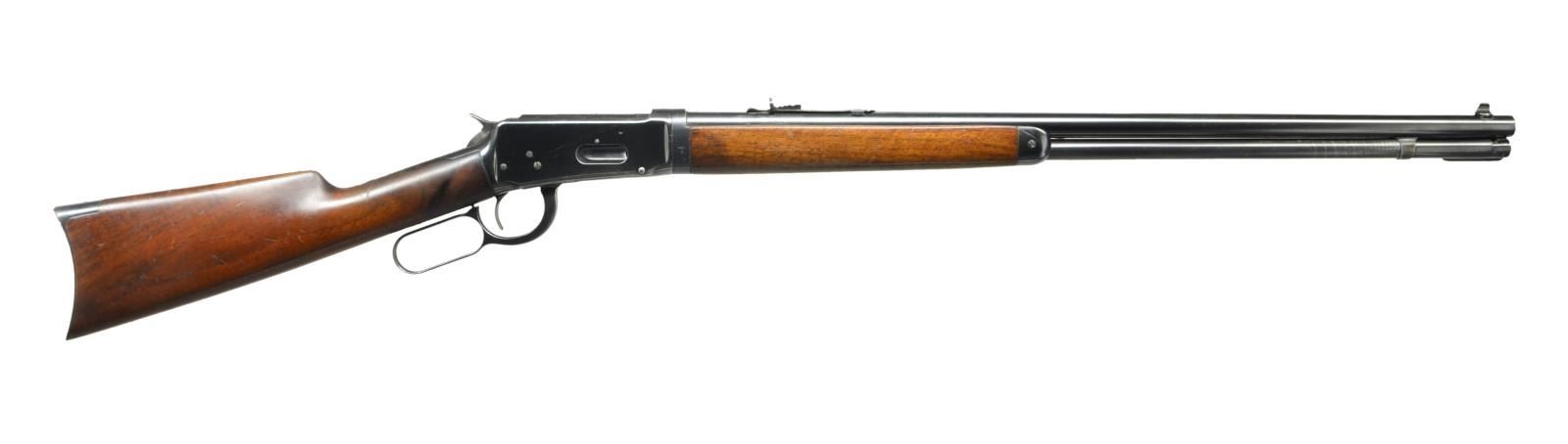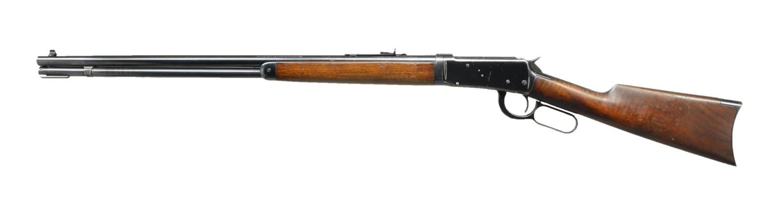 Cal. 32 WS. S# 131435. Bbl. 26" round w/ marbled replacement bead front sight & original sporting rear sight. Walnut forearms & straight grip stock w/ crescent steel buttplate. Mfg. 1898. CONDITION: action retains 80% reblued finish. Bbl. & mag. tube retain 90% original case coloring finish w/ takedown wear on the mag. tube. Wood has worn age darkened appearance showing scratches & marks. Bore retains sound rifling. (01-22928/DS). ANTIQUE. $1,200-1,800.