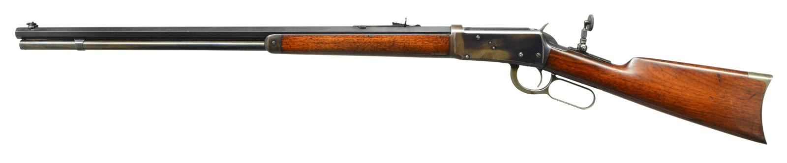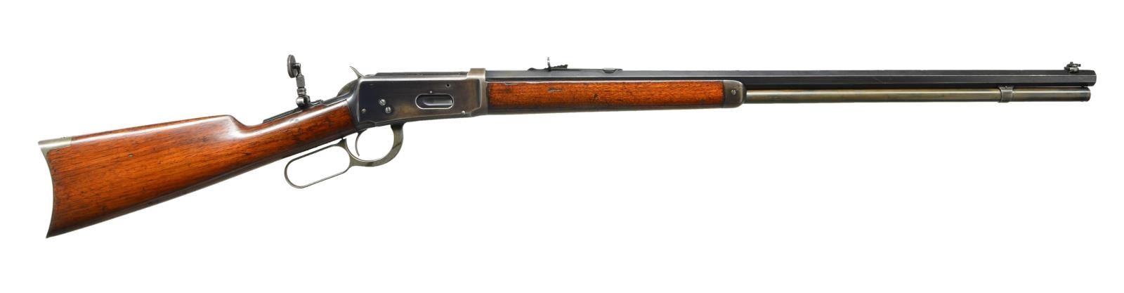 Cal. 38-55. S# 158519. Bbl. 26” octagon. White bead front sight, sporting rear sight w/ Lyman combination tang sight having a large disc aperture. Full length mag. Blue finish w/ case colored hammer, lever & crescent steel buttplate. Walnut forearm & straight grip stock. Mfg. 1899. CONDITION: bbl. retains over 80% lightly faded blue showing wear on sharp edges. Forward portion of mag. tube has gray brown coloration indicating touch up finish. Receiver shows 60% dull fading blue blending w/ areas of touch up finish. Hammer & lever show lightly visible case colors in protected areas. Buttplate has traces of remaining case colors. Wood has a light added coat of finish over moderate wear w/ numerous dents & marks. Lightly pitted bore retains intact rifling. (23-289/DS). CURIO. $1,000-1,500.