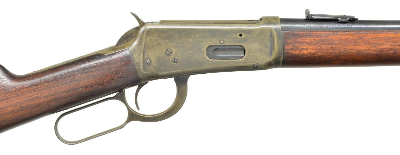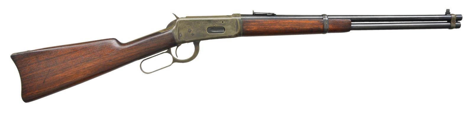Cal 30 WCF. S# 985622. Barrel 20”. Replacement pinned blade bead front with carbine style leaf rear sight. Left side of action has saddle ring with leather wrapping. Walnut stock set with steel carbine buttplate. 1926 Mfg. CONDITION: over 80% bbl. and mag. blue. Action shows cold blue touchup. Worn wood finish shows scratches and marks. Very good bright bore. (21- 4120/DS). CURIO. $600- $900.