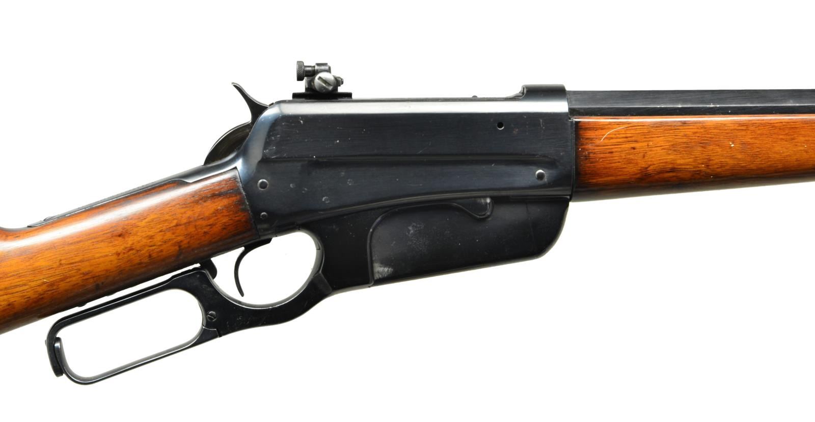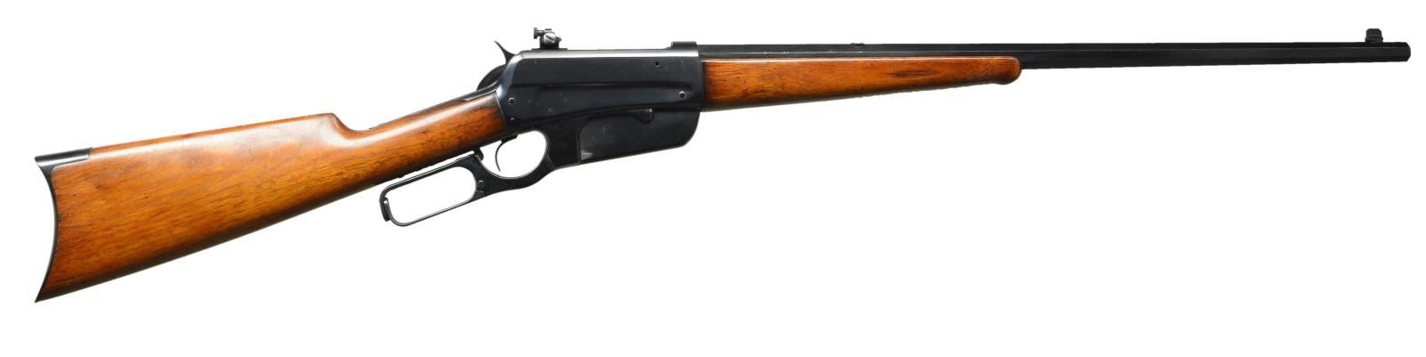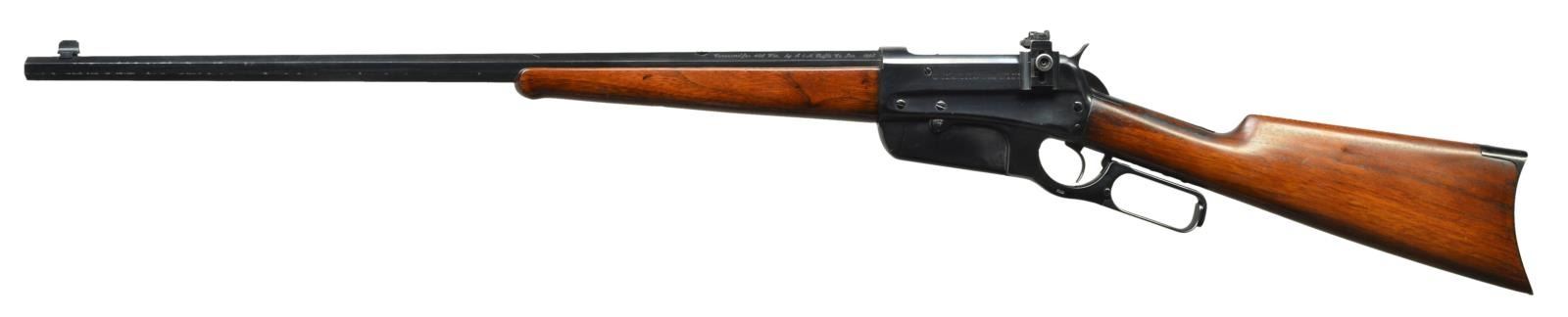 ACTION RIFLE. Cal. Converted to 405 Win. S# 24835. Bbl. 24" tapered octagon. Left flat is marked “Converted for 405 Win., By A & M Rifle CO., INC. 1965”. Redfield gold bead blade front sight, filler in rear dovetail with Lyman #56 receiver sight. Ebony tipped schnabel forearm and straight grip walnut stock with crescent steel buttplate. 1899 mfg. CONDITION: bbl. has 90% blue showing spots of loss on forward portion. Action retains 95% reblued finish. Sanded wood has good refinish showing small marks. Very good bright bore. (21-4173/DS). CURIO. $1,500-2,500.