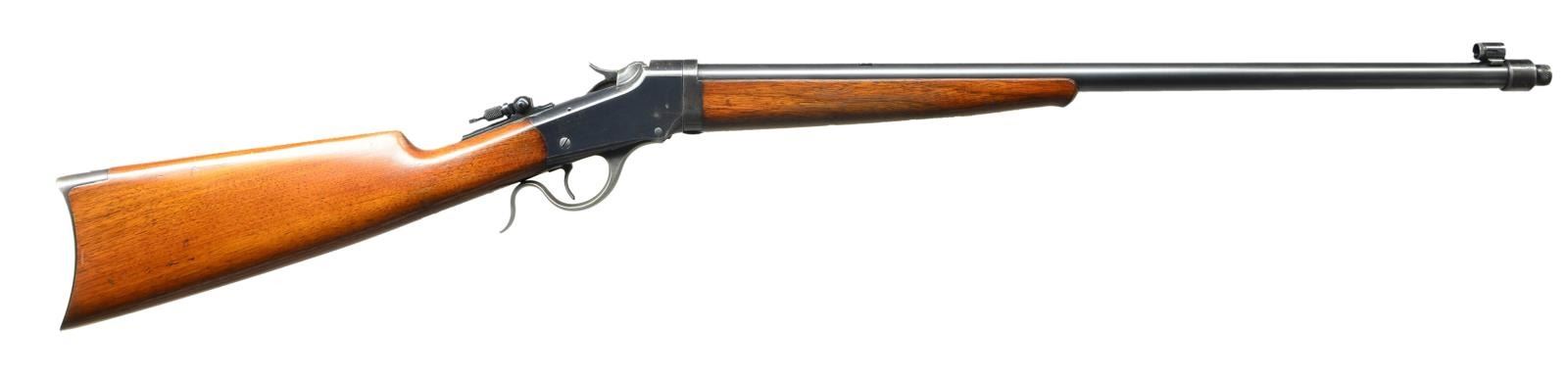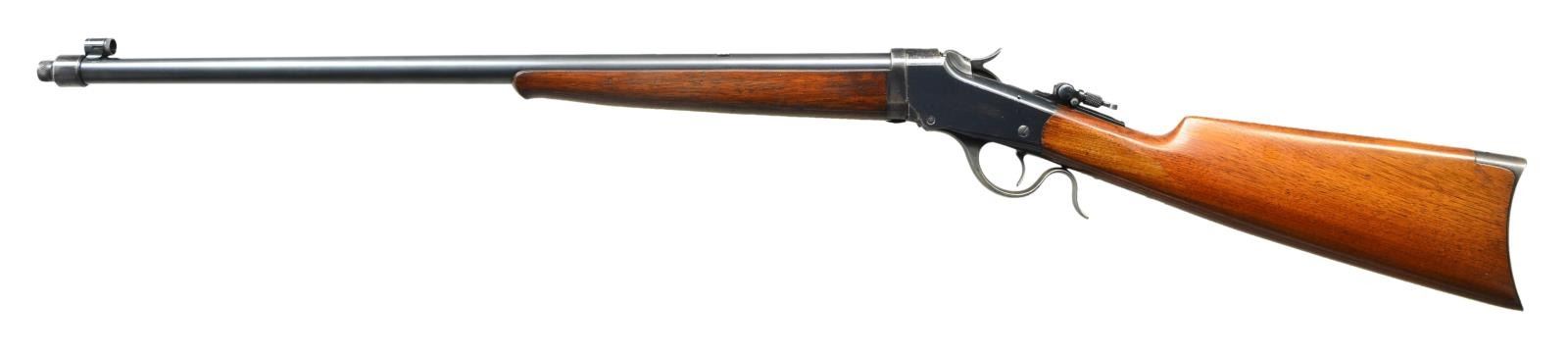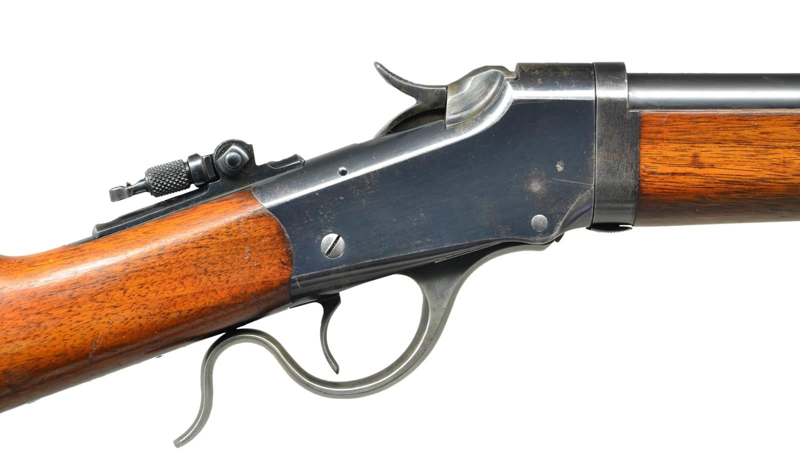 Cal. 22 Long. S# 106128A. Bbl. No. 1 weight round measuring 24 5/8” over collar & threaded muzzle for silencer installation. Threads are covered by knurled cap. Globe front sight, filler in rear dovetail w/ Lyman combination tang sight. Blue finish w/ case colored hammer, breech block & lever. Ebony tipped Schnable forearm & straight grip walnut stock w/ crescent steel buttplate. Late style rifle w/ flat main spring, a major design changes designated by the letter “A” after the S#. S# indicates approx. 1907 mfg. CONDITION: very fine. Bbl. & receiver retain over 80% blue showing light carry wear w/ spots of flaking on frame & bbl. extension. Case colored action parts retain 40% lightly faded colors. Original wood finish shows light wear w/ light scratches & marks. Lightly pitted bore retains strong rifling. (23-463/DS). CURIO. $3,000-4,500.