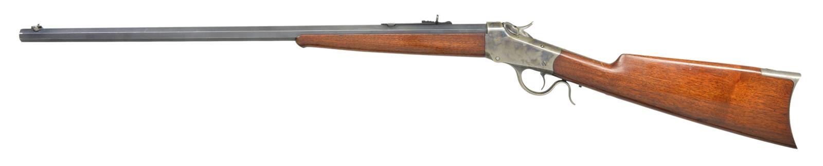 Cal. 22 short. S# 32725. Bbl. No. 1 weight 26” octagon. Combination front sight w/ elevator adj. sporting rear sight. Case colored action & crescent steel buttplate. Ebony tipped Schnable forearm & straight grip walnut stock. Mfg. 1889. CONDITION: very fine. Action retains over 50% nicely visible case colors. Buttplate retains traces of colors. Over 80% original bbl. blue shows light fading & edge wear. Wood has added varnish over scratches & marks. Bright bore w/ sound rifling. (01-22960/DS). ANTIQUE. $2,500-3,500.