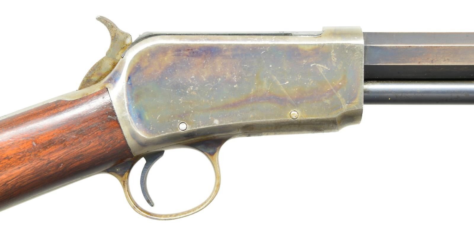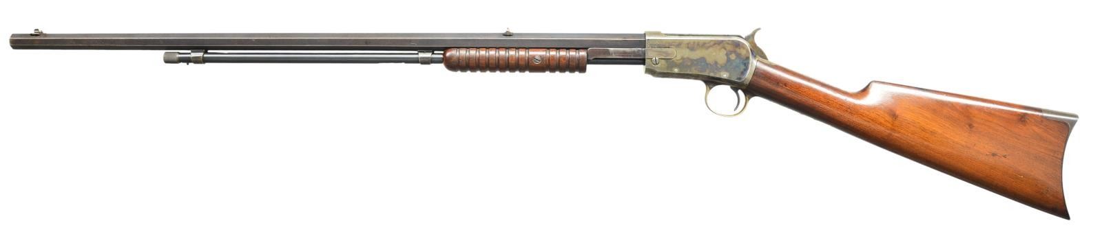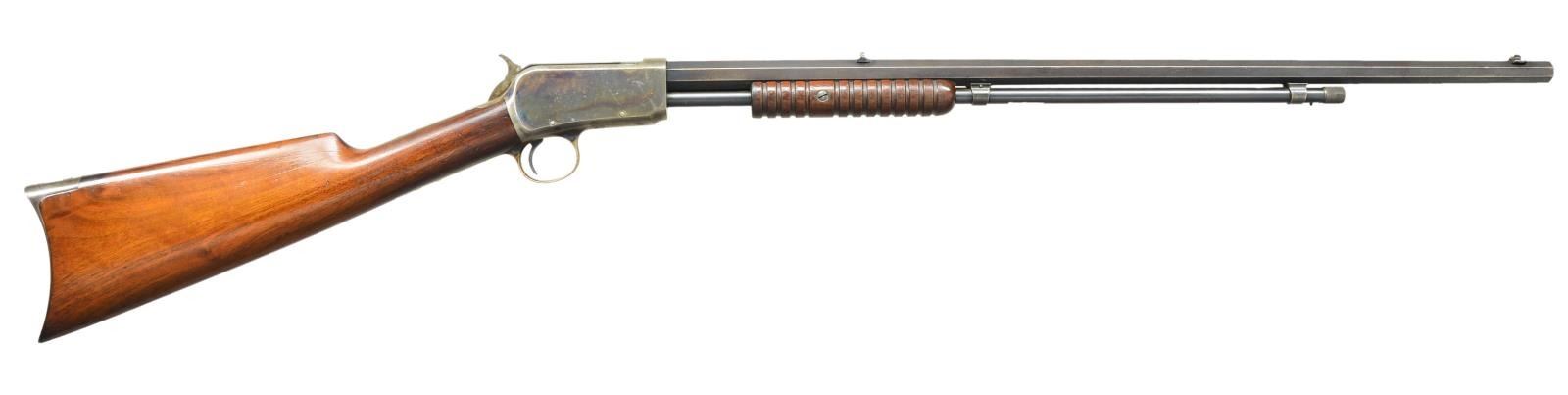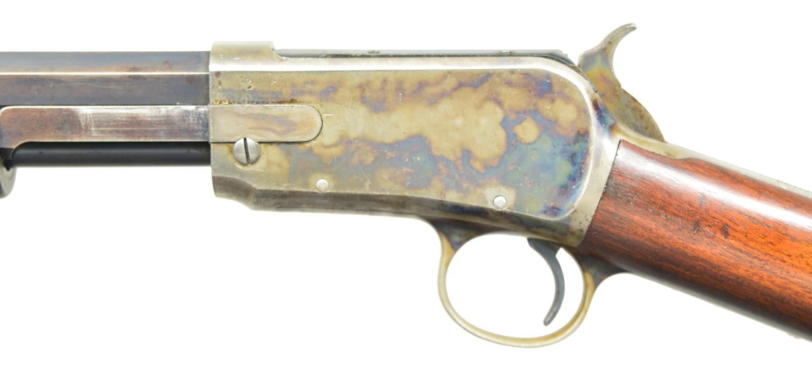 RIFLE. Cal. 22 Short. S# 804. The 1st Model 1890s featured a case colored solid frame action w/ pinned trigger guards. Approx. 15,500 solid frame rifles were produced. In 1893 the 2nd Model was introduced w/ the common takedown action. Bbl. 24 3/8" octagon, longer than the 24" bbls. of the 2nd & 3rd models. Blade front sight w/ white insert & flat top V notch rear sight. Tubular mag. Grooved walnut slide handle w/ straight grip stock having crescent steel buttplate. UNATTACHED ACCESSORIES: Cody Firearms Museum letter listing the following: “Rifle”, “22 Short”, “Received in the warehouse on February 23, 1891”, “Shipped from the warehouse on February 24, 1891”, “Returned and repaired on March 1, 1895, on June 28, 1904 on September 11, 1909”. CONDITION: very fine. Receiver retains a surprising 70% lightly faded original case coloring showing scratches, small dings & dark spotting. Buttplate has faded to a dark patina retaining traces of case coloring. Bbl. & mag. tube have over 70% dull lightly faded blue showing edge & slide wear. Original wood finish shows moderate wear w/ scattered scratches & marks. Bore is lightly pitted retaining intact rifling. (01-22959/DS). ANTIQUE. $10,000-15,000.
