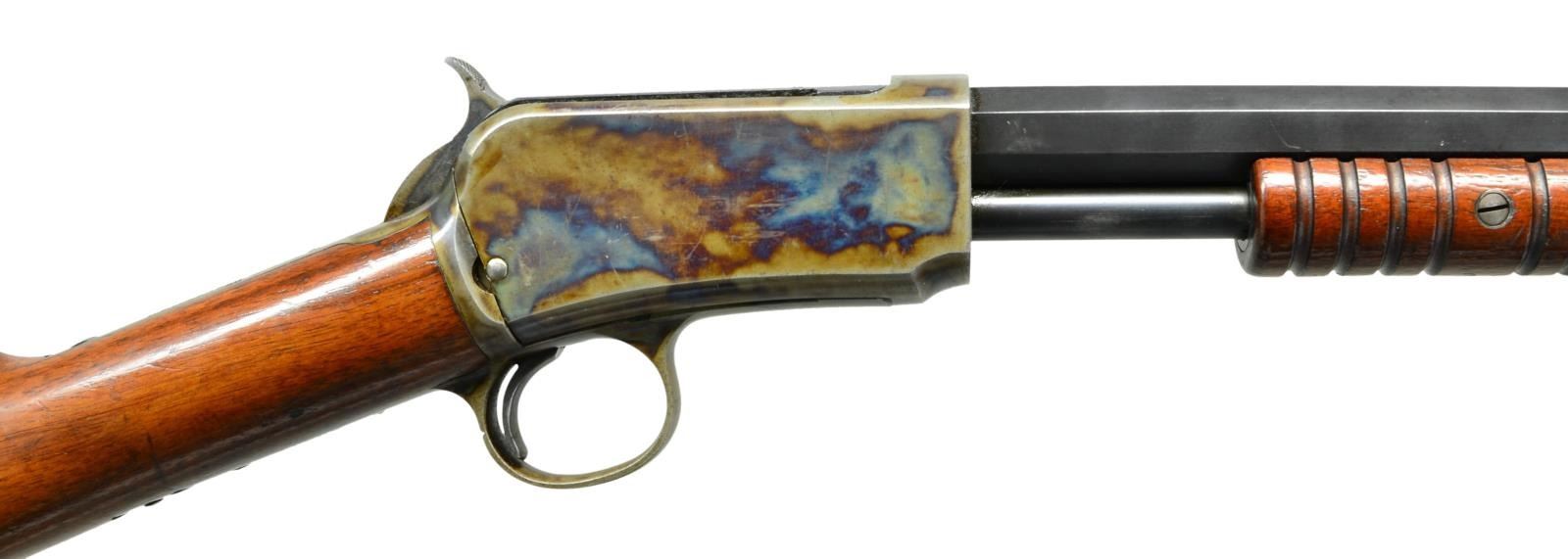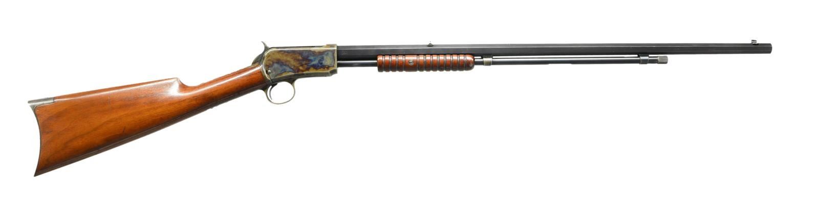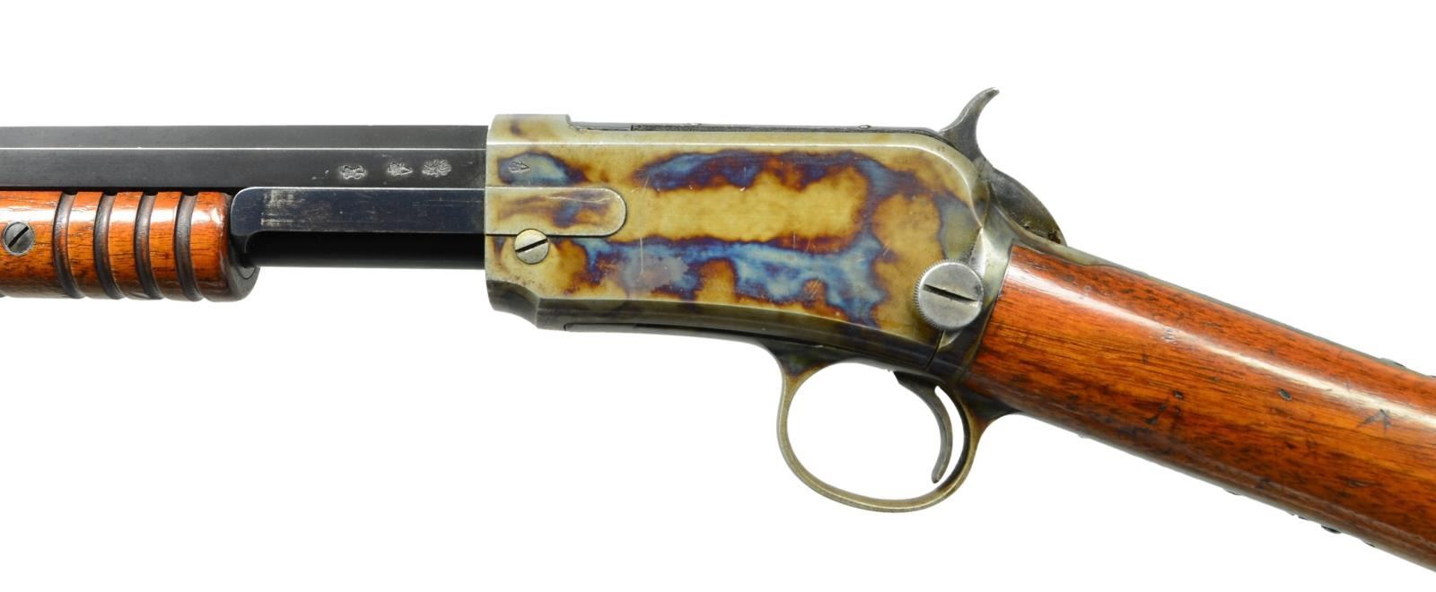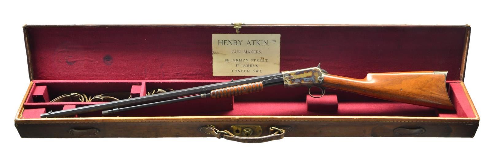 MODEL SLIDE ACTION RIFLE. Cal. 22 WRF. S# 23317. Bbl. longer 24 3/8” octagon as found on 1st model rifles. Early 2nd model case colored takedown action. Left side of bbl. & receiver have British proofs. Blade front sight w/ fixed flat top U notch rear sight. Standard tubular mag. Small round grooved slide handle w/ straight grip walnut stock having crescent steel buttplate. Serial number indicates 1893 mfg. UNATTACHED ACCESSORIES: leather covered rifle case w/ burgundy felt interior. Exterior of case marked w/ initials “D.A.C.”. Interior case lid label marked “HENRY ATKIN, LTD/GUNMAKERS/88, JERMAYN STREET,/St. JAMES’S,/LONDON,S.W.I.”. Case contains leather straps & cord style bore cleaner. CONDITION: extremely fine. Action retains over 90% vivid case colors showing small marks. Bbl. & mag. tube retain over 90% lightly faded blue showing slide & edge wear w/ spots of flaking on mag. bands. Original wood finish shows scattered scratches & marks. Bore shows scattered pitting & retains most rifling. (01-22997/DS). ANTIQUE. $8,000-12,000.