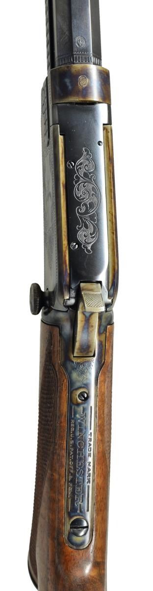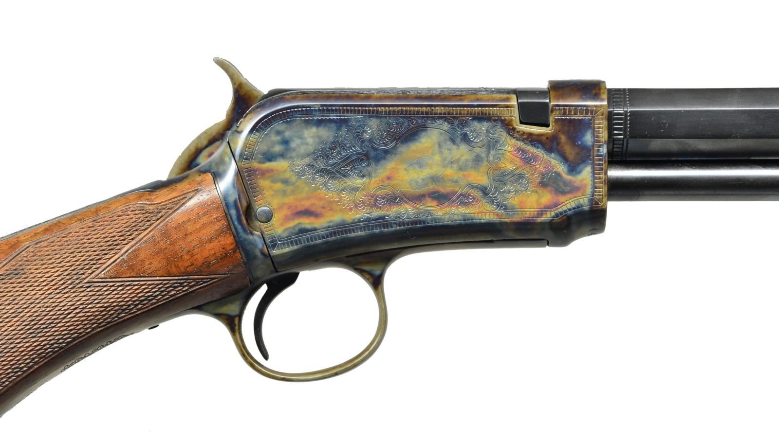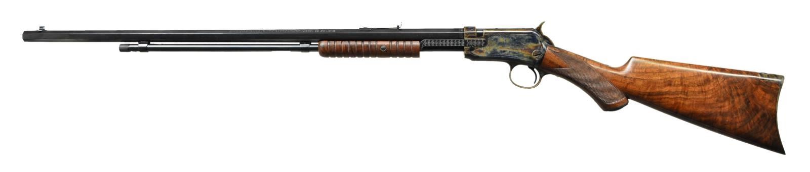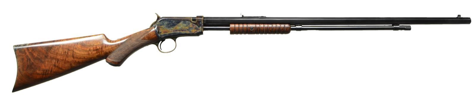 Cal. 22 L. S# 447576A. Bbl. 24” octagon. Case colored action has fine custom hand engraving. Scenes feature a rabbit on right side & squirrel on left surrounded by heart-shaped highlights & arabesque scroll. Rectangular chain borders continue to breech end of bbl. Additional scroll highlights are found on upper & lower tangs as well as top of breech block. Slide bar & slide bar cover have wheat grass pattern engraving. Custom small round grooved slide handle of fancy walnut. Fancy walnut custom stock features style H hand checkering, small round plastic grip cap & case colored crescent steel buttplate having complimentary engraving at heel. Mfg. 1911. CONDITION: very fine as refurbished. Bbl., mag. tube & breech block retain over 98% fine custom blue finish. Action & buttplate retain nearly all case coloring showing vivid blue, green, yellow & orange colors. Wood has very good custom finish. Lightly pitted bore retains intact rifling. (23-474/DS). CURIO. $5,000-8,000.