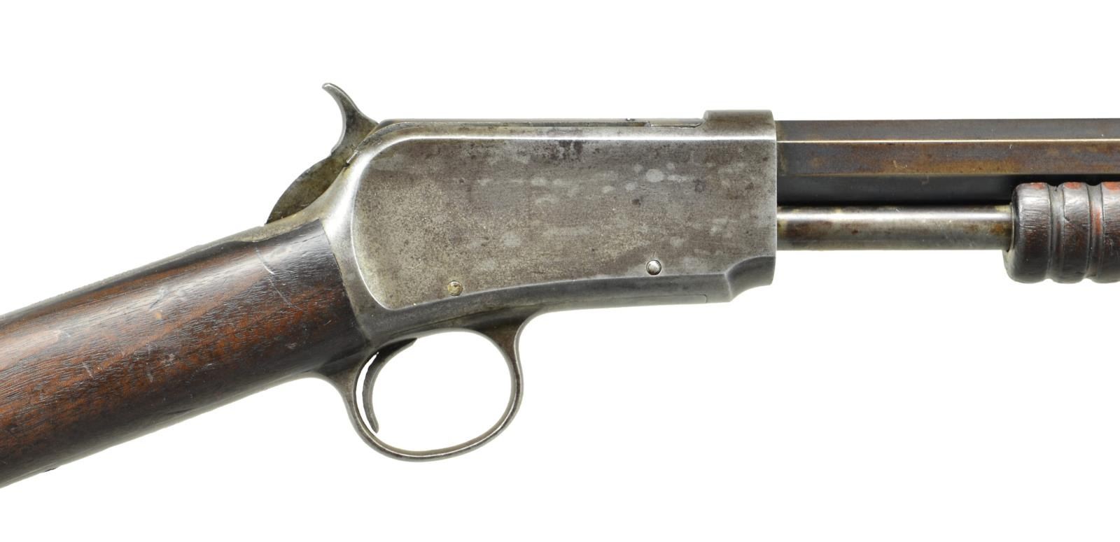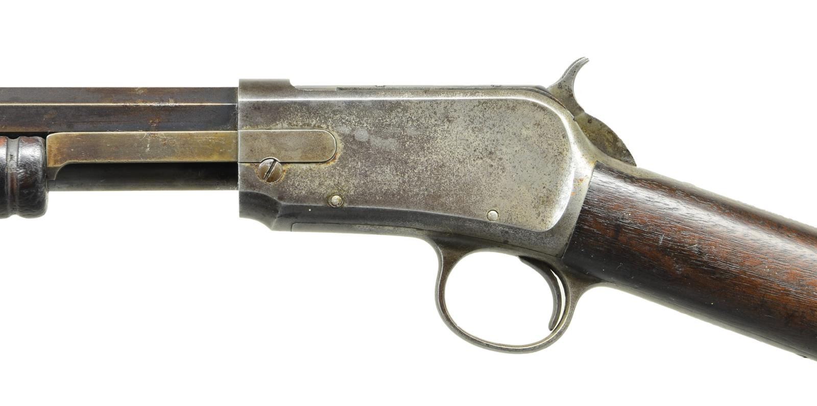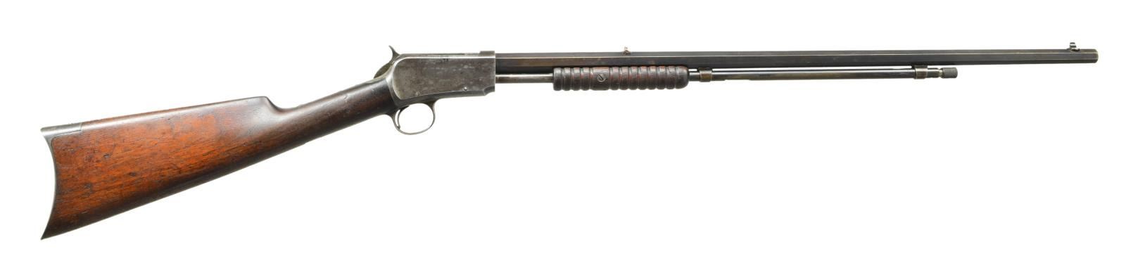 Cal. 22 Long. S# 14414. Bbl. 24-3/8". Replacement sporting front sight & fixed rear sight. Solid frame non-takedown action. Grooved forend straight grip walnut stock w/ crescent steel buttplate. CONDITION: bbl. & mag. tube have a faded brown appearance. Case colored action has faded to a silver/brown patina. Wood shows wear w/ darkened appearance & handling marks. Dark pitted bore retains partially intact rifling. (01-20941/DS). ANTIQUE. $3,500-5,000.