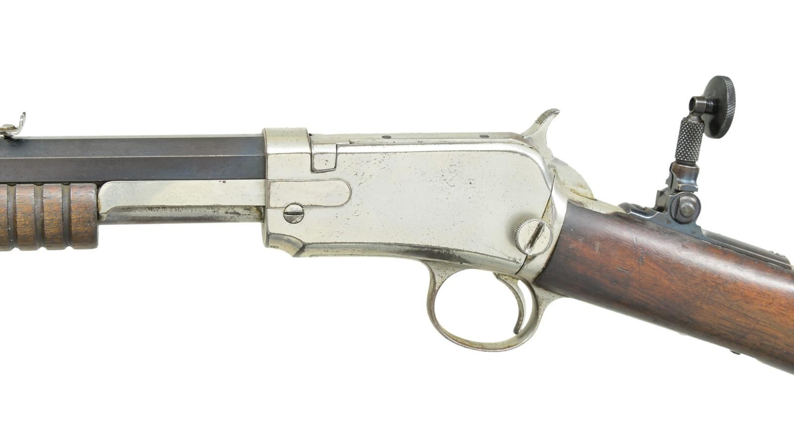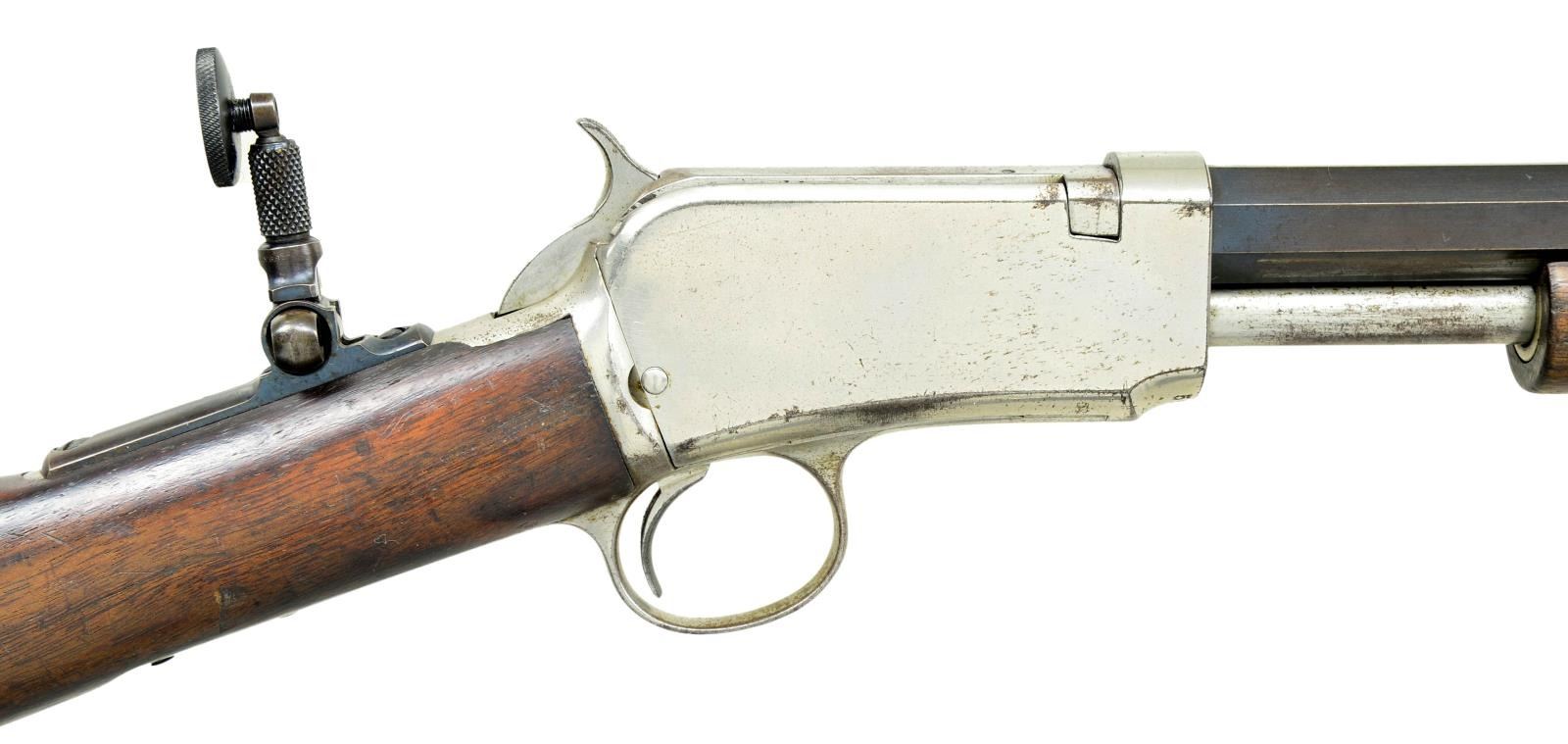 Cal. 22 Short. S# 567448A. BBL. 24" octagon. Combination tang sight, M90 sporting rear & replacement globe front sights. Rare rifle with entirely nickel finished action, mag tube, rear sight & crescent buttplate. Only the bbl. is blued. Grooved forend & straight grip walnut stock. "Winchester For Over a Century, Volume 1" page IV-7 by Bill West states "Nickel plated rifles with tang sights were used by exhibition shooters. Called "Expert" rifles". Mfg. 1916. CONDITION: