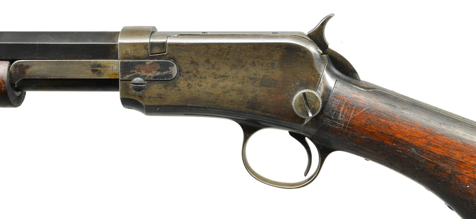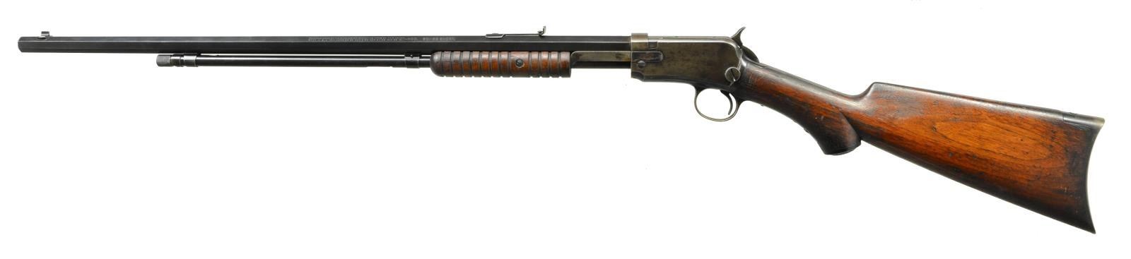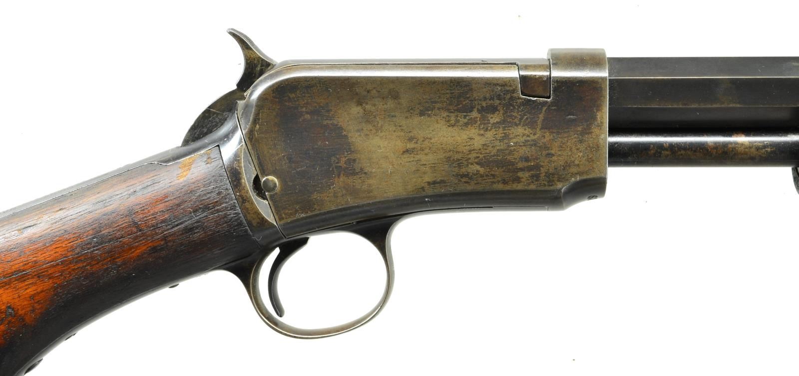 Cal. 22 Short. S# 680007A. Bbl. 24" octagon w/ model 90 sporting sights. Rare & desirable pistol grip walnut stock w/ crescent steel buttplate & hard rubber grip cap. Grooved forend. Mfg. 1926. CONDITION: blue has dull appearance w/ areas fading to brown. Wood has age darkened appearance showing wear & handling marks. Bore is bright w/ strong rifling. (22-1887/DS). CURIO. $2,750-3,500.