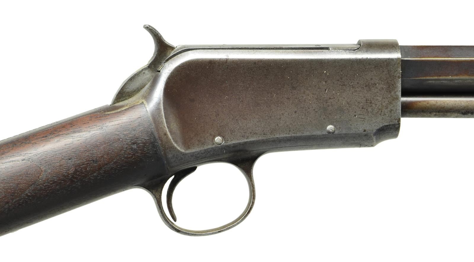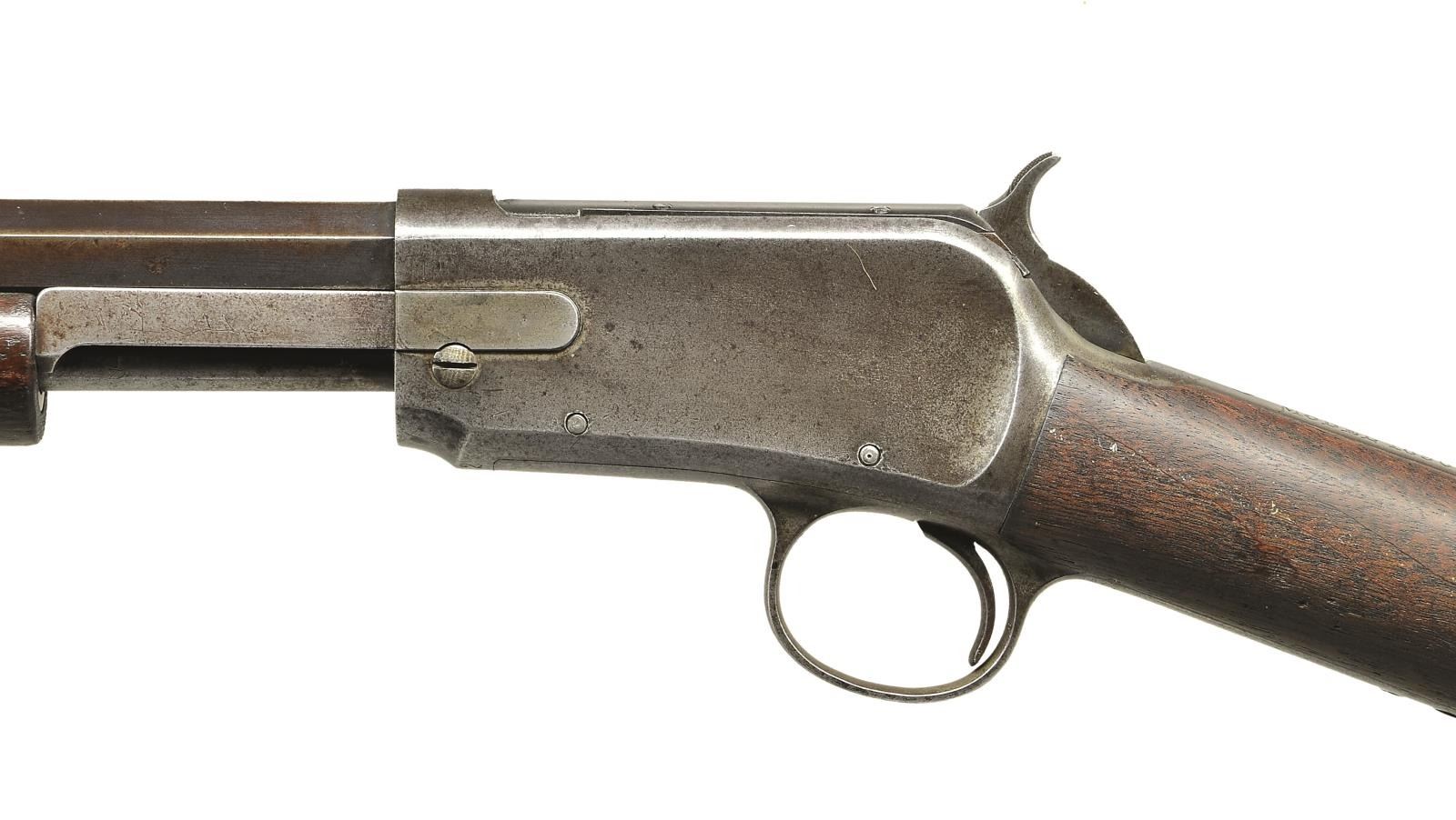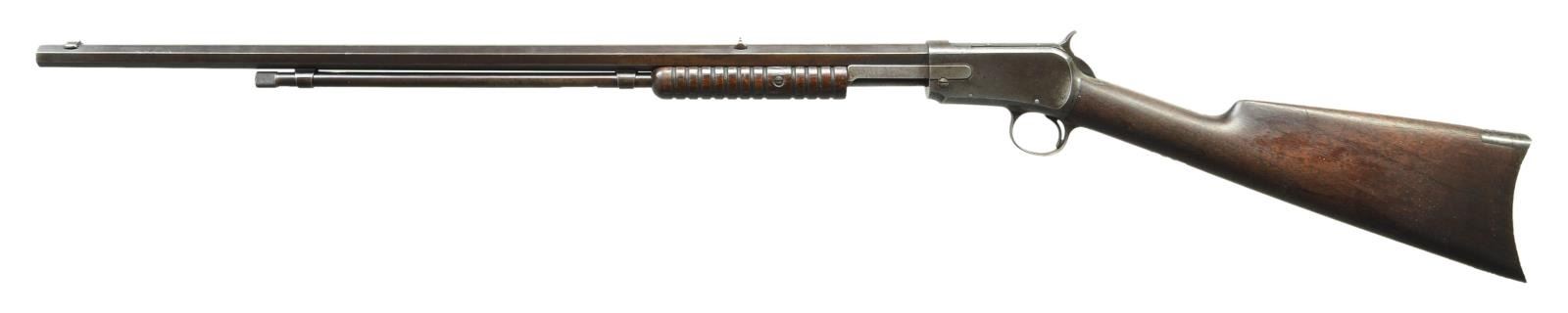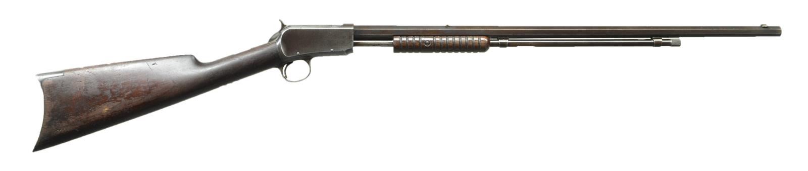 ACTION RIFLE. Cal. 22S. S#3412. The 24 1/4" octagon bbl. is marked "MANUFACTURED BY THE" "WINCHESTER REPEATING ARMS CO. NEW HAVEN. CONN. U.S.A." on top flat in front of single leaf V-notch rear sight & w/ cal. at rear. Solid frame action w/ blued bolt has "Winchester" "Model 1890" on top tang. Bottom tang is marked "PAT. JUNE 26. 1888". S# is on bottom of action. Plain American walnut straight grip stock has crescent steel buttplate. Straight grooved forend. CONDITION: good. Bbl. & mag. tube retaining about 20% original blue, the balance smooth brown patina w/ silver hand worn highlights on edges. There are traces of blue on bolt. Action is mostly all smooth gray to brown. Bottom tang shows some considerable pitting. Stocks retain 30-40% original finish w/ a large number of marks & scratches. Bore is good, dark in grooves w/ rifling evident throughout. Mechanically good. (01-20939). CURIO. $2,500-4,000.