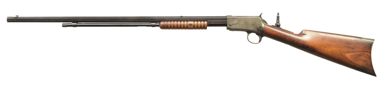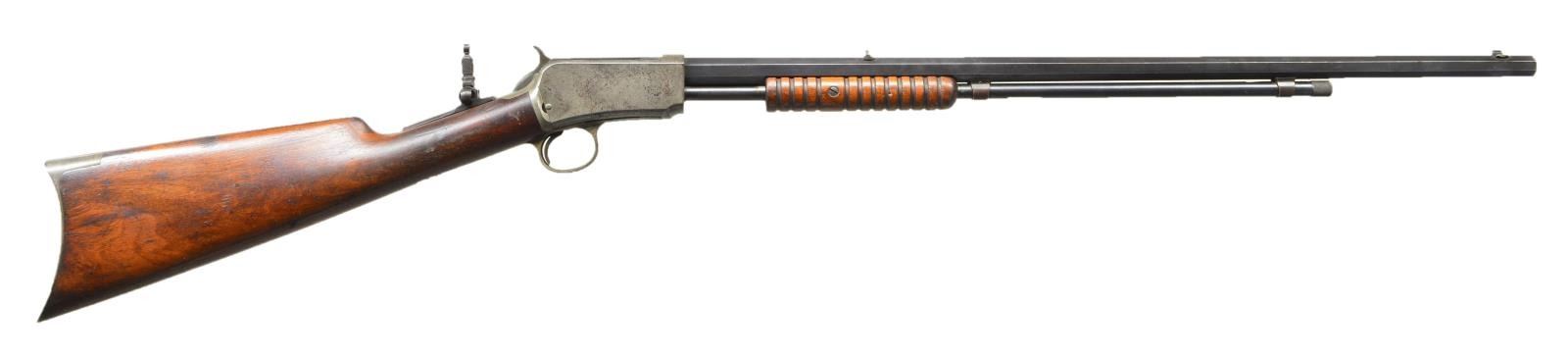 2ND MODEL RIFLE W/ CASE HARDENED FRAME. Cal. 22S. S# 34945. The 24 1/4" octagon bbl. is marked "MANUFACTURED BY THE" "WINCHESTER REPEATING ARMS CO. NEW HAVEN. CONN. U.S.A." on top flat in front of single leaf V-notch rear sight & w/ cal. at rear. Case hardened takedown action w/ blued bolt has "Winchester Model 1890" w/ patent dates on top tang covered by Lyman "WS" marked tang sight. Plain American walnut straight grip stock has crescent steel buttplate. Straight grooved forend. CONDITION: fine-very fine. Bbl. & mag. tube retain over 70% original blue w/ some browning overall & sharp edge wear. Bolt retains about 80% of its blue w/ some light freckling. Action retains about 30% original case hardening color, fading to gray w/ a good amount of scattered freckling. Stocks retain most of their original varnish. Buttplate w/ traces of color is mostly gray w/ some brown patches. Bore is fine, shiny w/ some scattered pitting. Mechanically good. (01-20940/MGM). CURIO. $2,000-3,000.