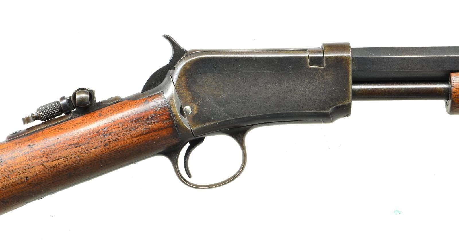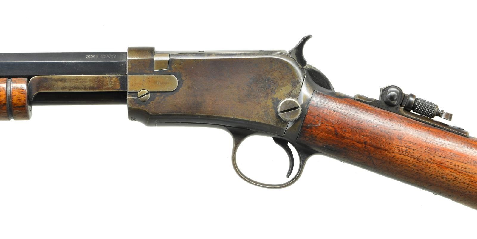Cal. 22 Long. S# 588332A. Bbl. 24" octagon w/ sporting front, single folding leaf rear & combination tang sights. Grooved forend & straight grip walnut stock w/ crescent steel buttplate. Mfg. 1917. CONDITION: bbl. has 70% thinning blue. Action & mag. tube are fading to brown. Original wood finish shows light wear w/ scratches & marks. Lightly pitted bore retain partially visible rifling. (22-1872/DS). CURIO. $1,750-2,500.
