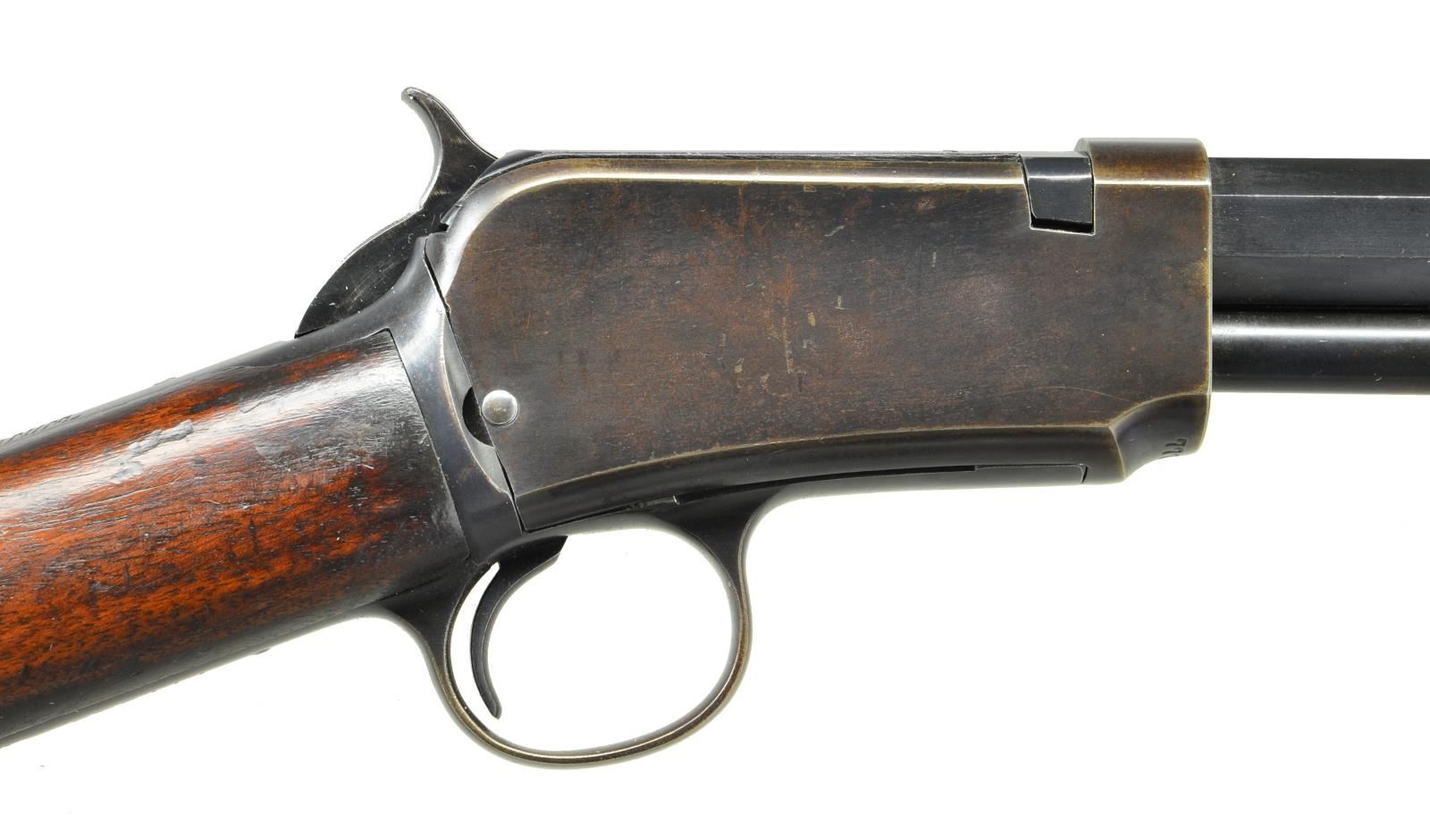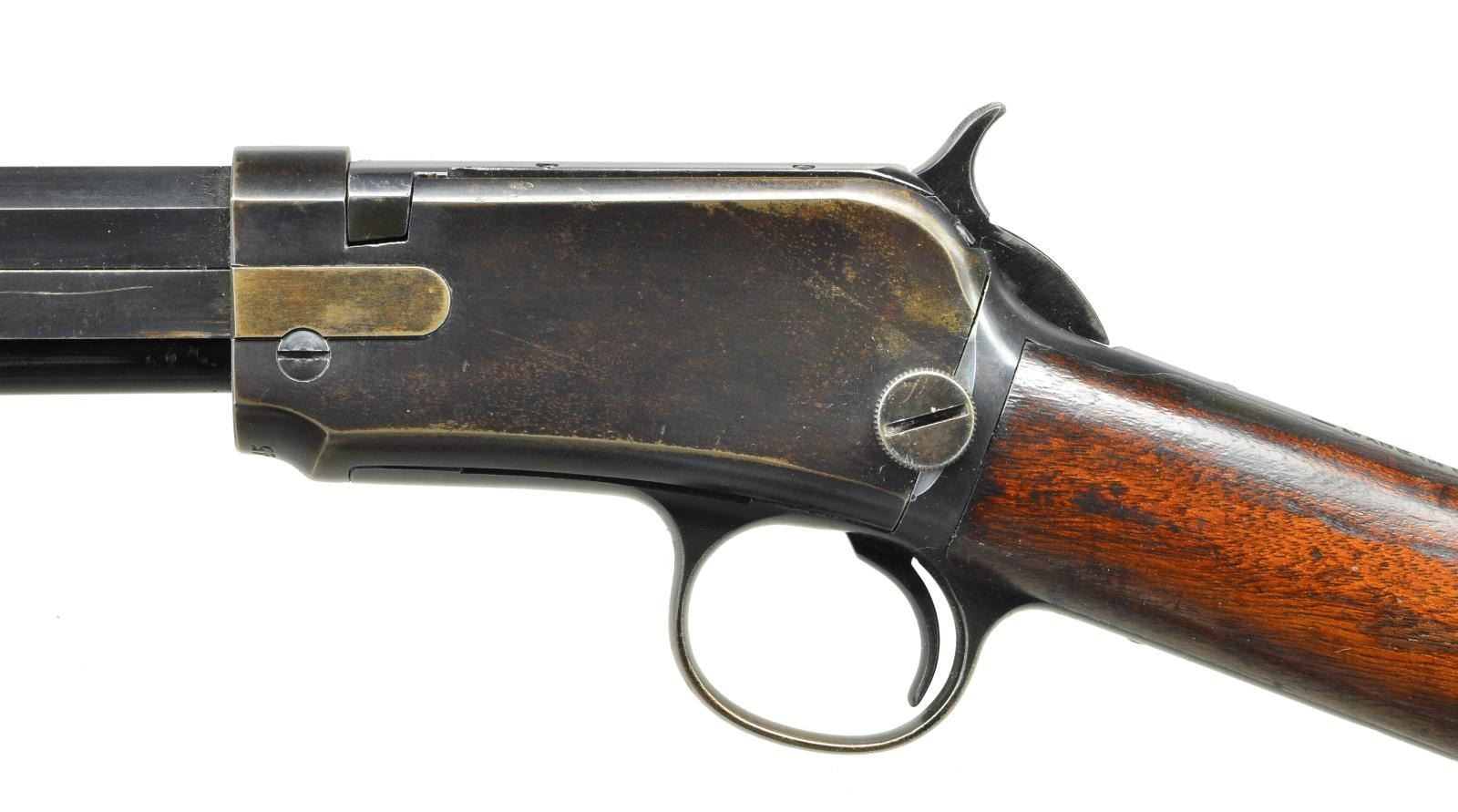 Cal. 22 Long. S# 777545. Bbl. 24" octagon w/ model 90 sporting sights. Grooved forend & straight grip walnut stock w/ crescent steel buttplate. Left side of stock has carved initial "M". Late production rifle mfg. 1933 or later. CONDITION: 80% lightly worn blue fading to brown in some areas. Original wood finish shows wear & age darkening w/ scattered scratches & marks. Bore is bright w/ strong rifling. (22-1888/DS). CURIO. $1,250-1,750.