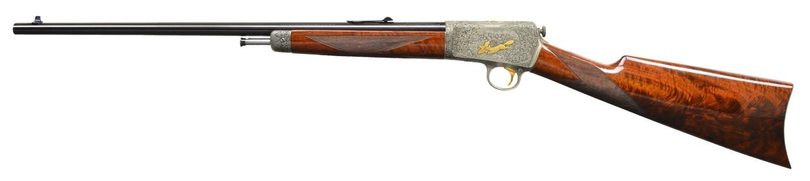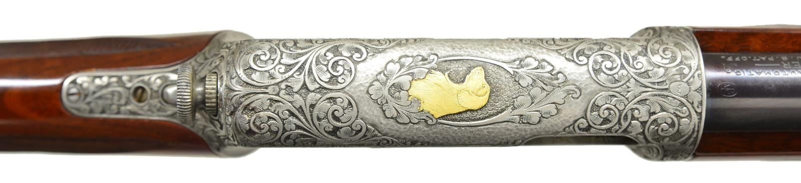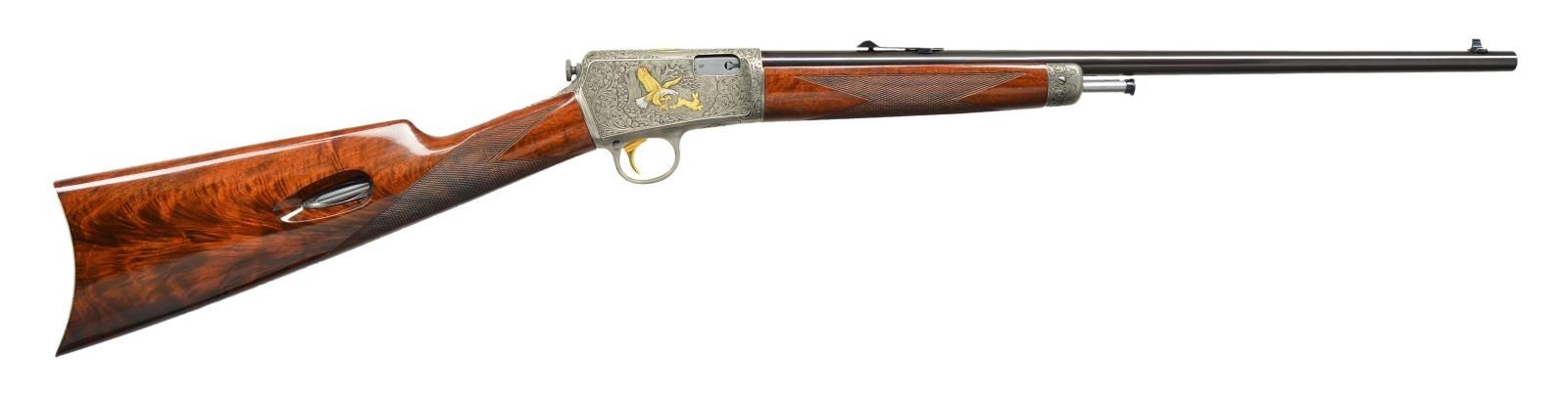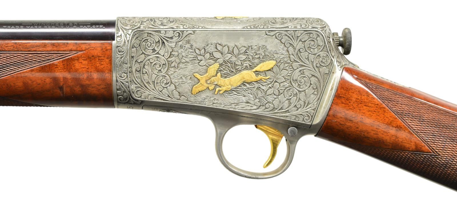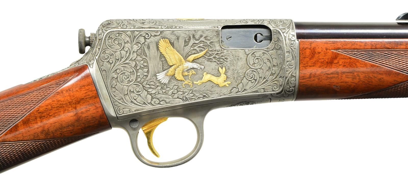 LOADING RIFLE. Cal. 22 Win. Auto. S# 101415. Outstanding full coverage engraving by world renowned Belgium-trained master engraver Angelo Bee. Coin finished action & fittings. Right side woodland scene features a gold & silver inlaid eagle pursuing a gold rabbit. Left scene portrays a gold & silver fox w/ flushing partridge. Top of receiver portrays a gold portrait of a hunting dog accented by a hammer finished oval ring. Balance of receiver top & sides are covered w/ vine type foliate scroll accented by dark shaded backgrounds that continue to top tang & trigger guard. Forearm cap has matching scroll w/ hammer finished accents. Crescent steel buttplate is scroll engraved at heel & toe. Bbl. 20" round. Bead front sight w/ original screw adj. U notch rear sight. Gold finished trigger. Custom forearm & straight grip stock of gloss finished fancy walnut w/ hand checkering. Mag. tube inserts through buttplate & loads through right side of stock. Mfg. 1924. CONDITION: very fine as refurbished. Action & fittings have near excellent coin finish showing small spots of remaining pitting along lower edge of action. Bbl. retains 98% brightly polished reblued finish. Stock finish shows a few small scratches & marks w/ a dent on left side of forearm. Bore has a lightly frosted appearance & worn rifling. (23-478/DS). CURIO. $8,000-12,000.