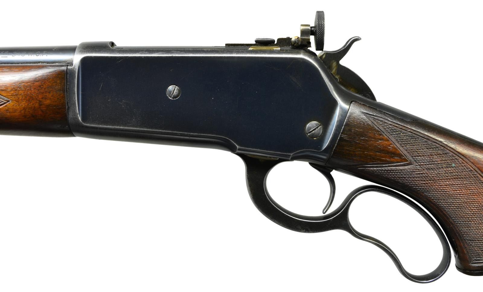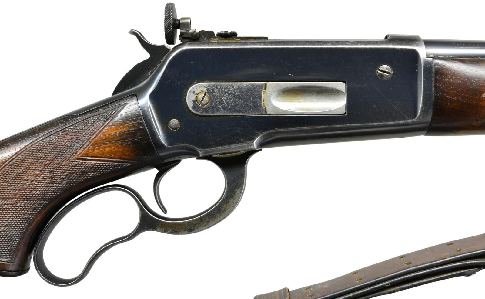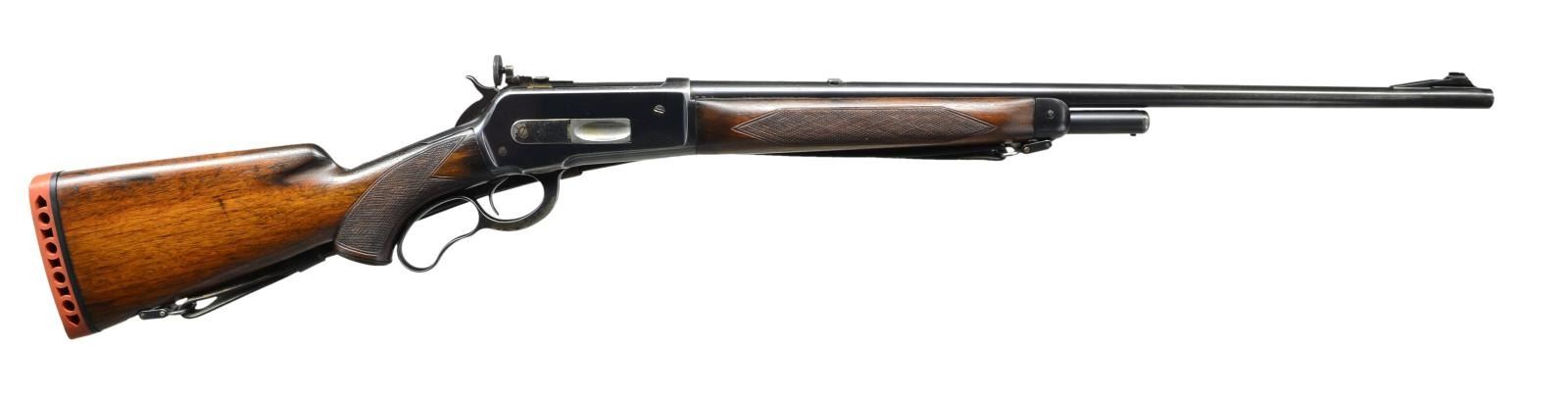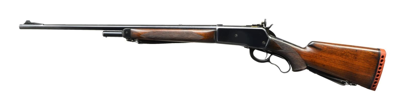 Cal. 348 WCF. S# 7762. Bbl. 24" round. Ramp mounted bead front sight, filler in rear dovetail w/ bolt peep sight having an added large aperture. Half length mag. Long tang action. Semi beavertail forearm & hard rubber capped pistol grip stock w/ checkering. LOP is shortened to 13 1/4" over an aftermarket Redhead pad. Military style leather sling on original Super Grade sling swivels. Mfg. 1936. CONDITION: over 75% lightly faded blue showing edge & carry wear. Refinished wood shows aged darkening w/ scattered scratches & marks. Checkering is recently recut. Bright bore retains strong rifling. (23-292/DS). CURIO. $1,500-2,200.