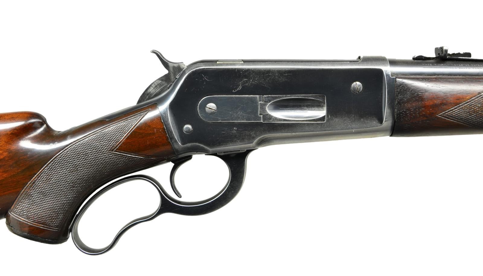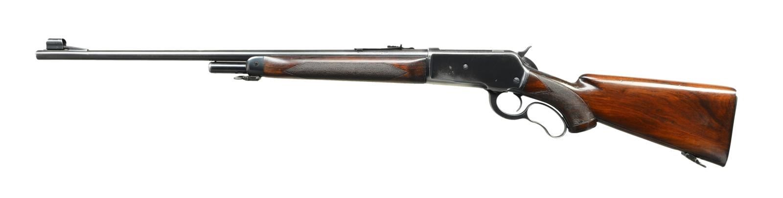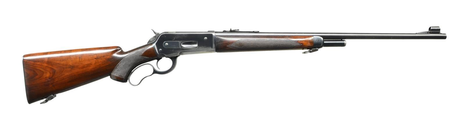 Cal. 348 WCF. S# 24136. Bbl. 24" w/ hooded ramp white bead front sight. Sporting rear sight is altered to flat top configuration. Half length mag. Short tang action. Semi beavertail forearm w/ hard rubber capped pistol grip stock having hand checkering, checkered steel buttplate & Super Grade sling swivels. S# indicates 1947 mfg. CONDITION: over 60% fading blue showing carry wear. Wood has added finish over wear w/ numerous scratches & handling marks. Very good bright bore. (23-291/DS). CURIO. $1,400-1,900.