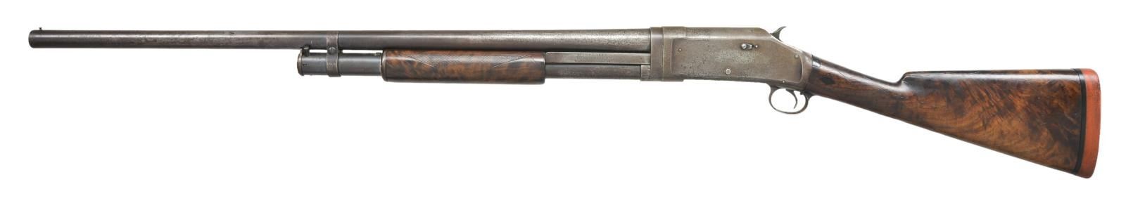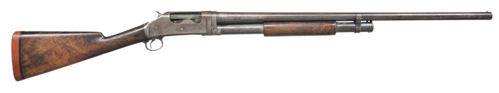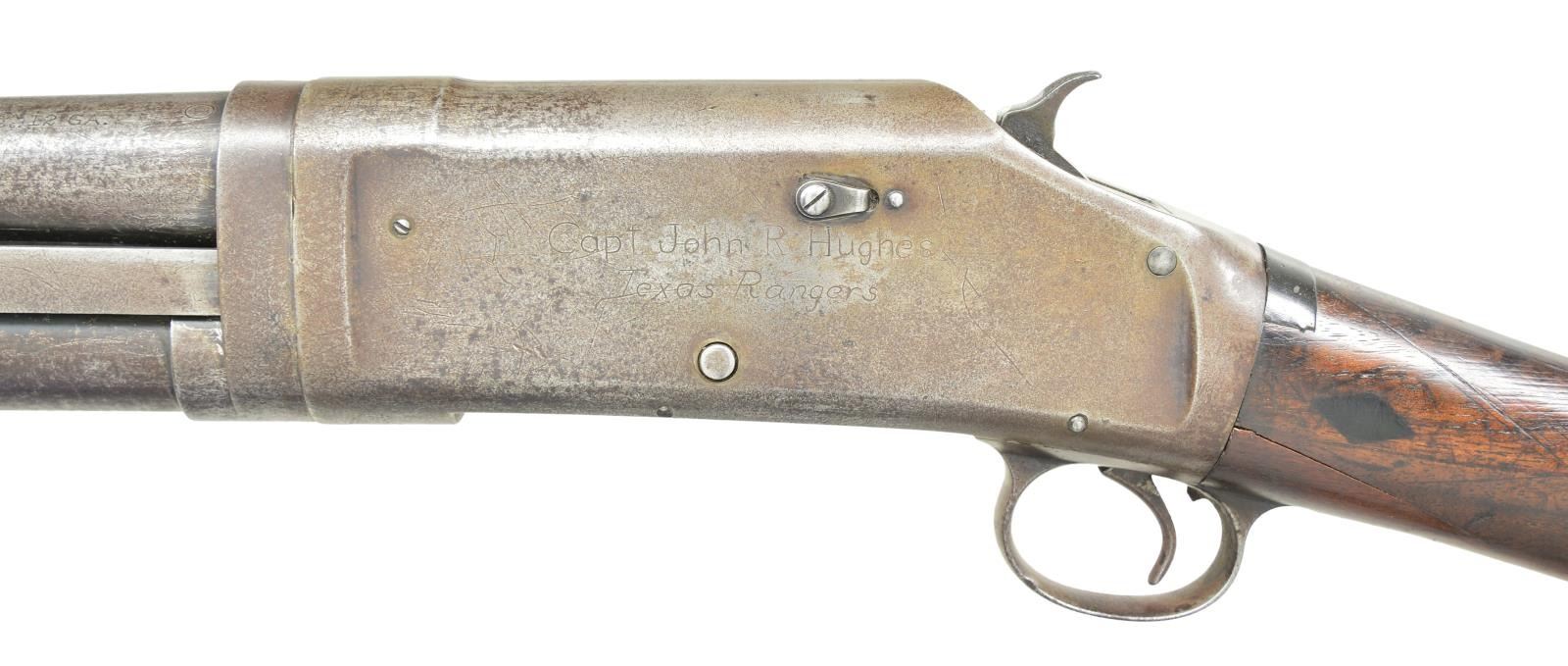 Cal. 12 Ga. S# 461336E. Captain John R. Hughes had an illustrious career w/ the Texas Rangers from 1887 until his retirement in 1915. Captain Hughes, who often worked alone, had a reputation for always getting his man dead or alive & faced some of the most dangerous outlaws in Texas at the time. Captain Hughes was born on Feb 11th, 1855 near Cambridge, Illinois. Consignor supplied information states that Hughes was the inspiration for Zane Grey’s “The Lone Ranger”. Bbl. Shortened 28” w/ Cyl. bore. Hand matted top that extends over receiver. Breech block is marked “TRAP GUN”. Left side of receiver is engraved “Capt. John R, Hughes/Texas Ranger”. Small round grooved forearm & straight grip stock of XXX fancy walnut w/ trap grade checkering having black diamonds on both sides of wrist. LOP is shortened 13 1/4” over an aftermarket London style pad. Mfg. 1910. UNATTACHED ACCESSORIES: included w/ this historic shotgun is a packet of information containing the October 1927 edition of the Frontier Times featuring an article about Captain Hughes’s career & exploits along w/ photocopies of a later Frontier Times article w/ his obituary. CONDITION: metal finish has faded to gray showing general light pitting. Left side of bbl. has raised dent 9” inches from the muzzle. Sanded & refinished wood have worn appearance w/ thinned checkering showing numerous scratches, marks & dents. Stock has added wood repair left of trigger guard w/ band of dark composite repair at top of receiver. Bore shows scattered pitting. PROVENANCE: purchased from descendants of John R. Hughes by Clayton Grant, special forces retired, in 1977. Sold to Todd Gurganus of Goldsboro, NC. Later sold to John Hayes of Gettysburg, in 1992. (22-6183/DS). CURIO. $15,000-20,000.