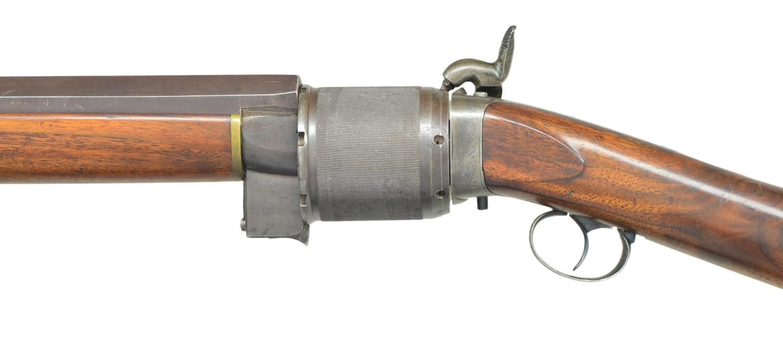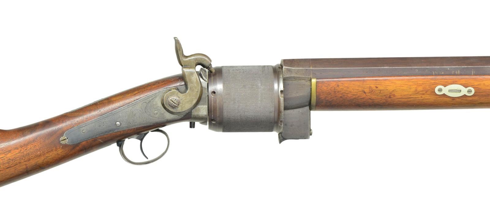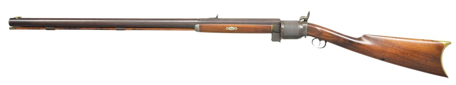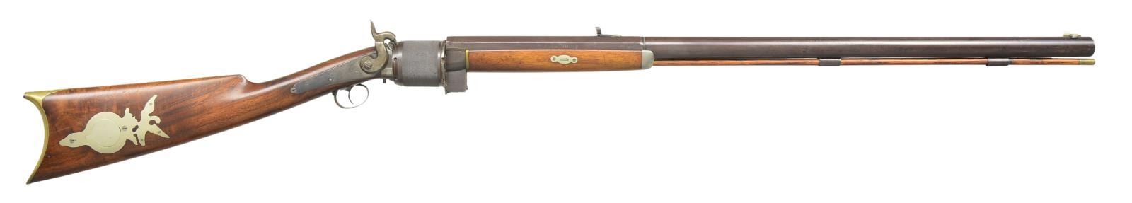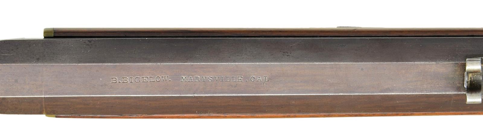 REVOLVING RIFLE. Cal. 40. NSN. Bbl. 28 3/4" round with faceted transition to octagon shank. Top flat marked “B. BIGELOW. MARYSVILLE, CAL.” Rocky Mountain front sight with semi Buckhorn V notch rear sight. Seven round cylinder has finely serrated grasping surface with circular indentions for priming pills at rear. Manually turned cylinder is released by protruding latch and rear of bbl. Iron frame with engraved back action lock. Pewter tipped forearm has German silver escutcheons with brass plate at rear. Straight grip stock, brass crescent buttplate. Right side of stock has a German silver circular lid patch box with Eagle finial. Brass tipped hardwood cleaning rod is held by 2 plain pipes. Rifles of this style were manufactured by several makers and are generally known as Billinghurst rifles. Benjamin Bigelow worked for Billinghurst in New York before moving to Marysville California during the gold mining era. His rifles history is intertwined with California's gold mining lore. CONDITION: fine. Bbl. and cylinder retain over 70% browned finish showing light carry wear with scattered small marks. Frame has traces of case colored finish remaining. Lock has fading blue finish. Wood has lightly worn finish showing numerous scratches and marks. Sound mechanics. Bore retains strong rifling showing scattered pitting. (01-21982/DS). ANTIQUE. $6,000-12,000.