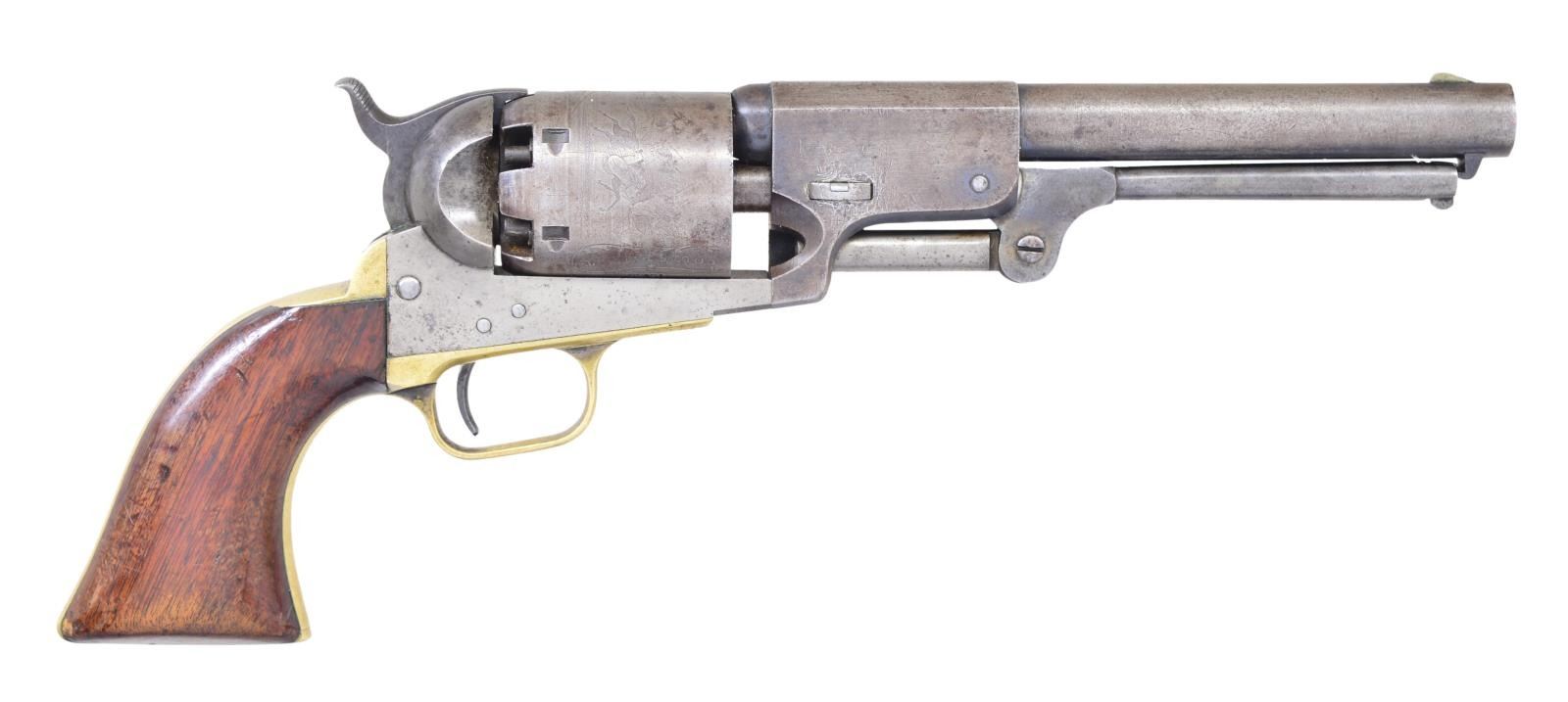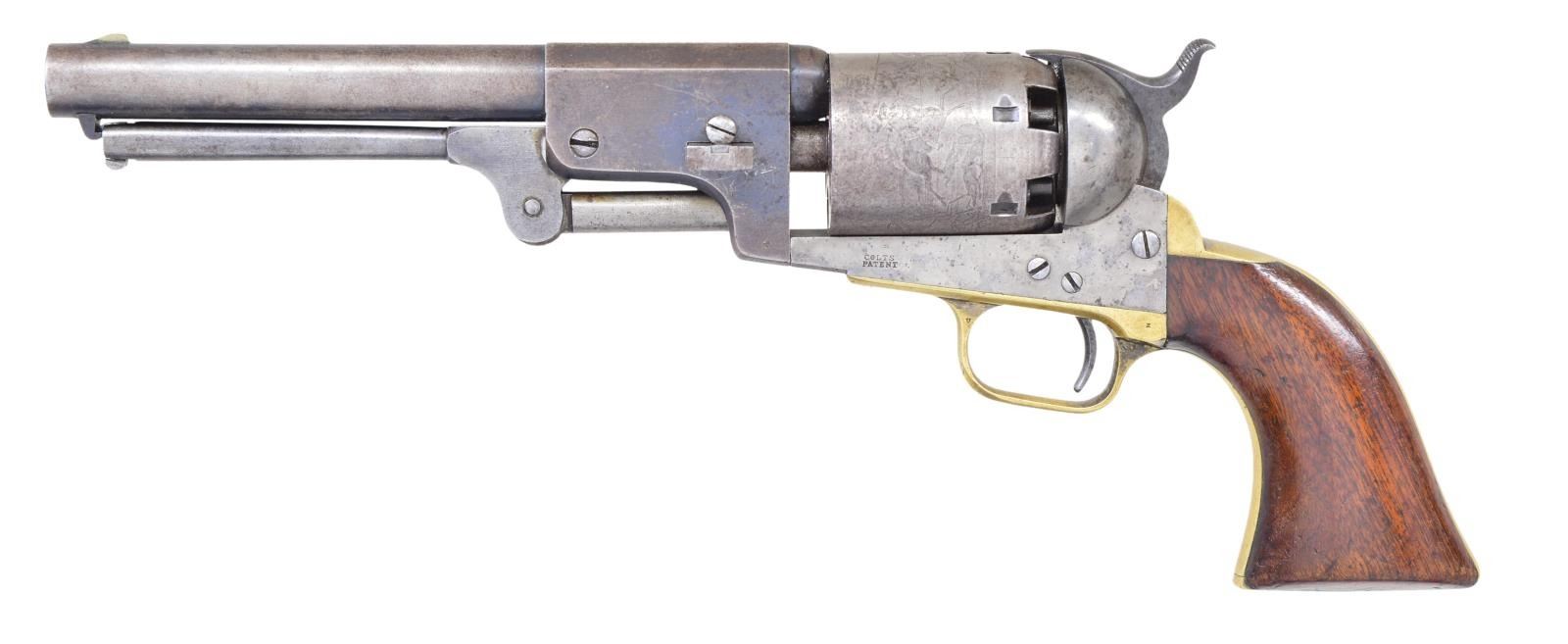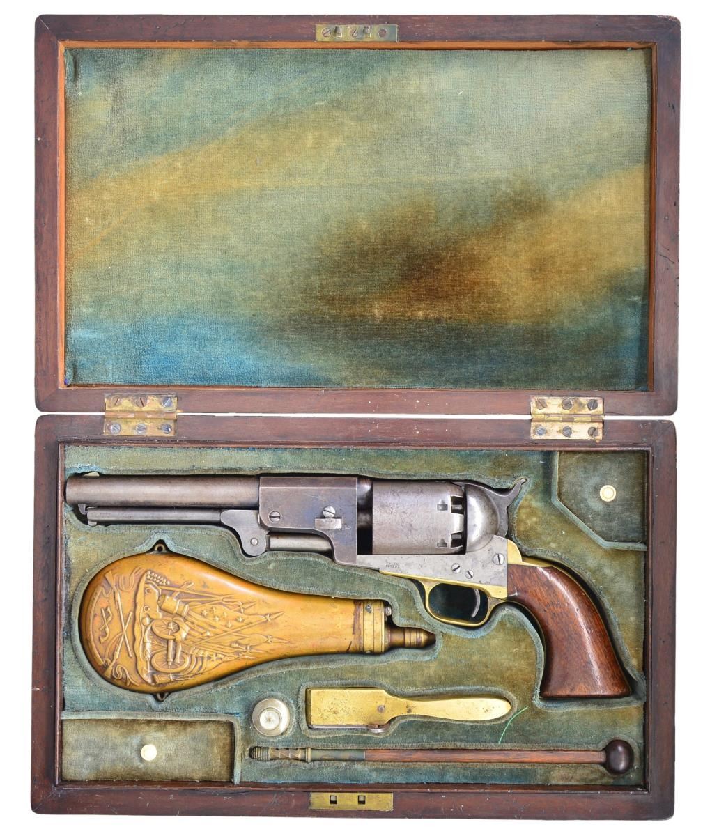 Cal. 44 Colt. S# 15035. Bbl. 7 1/2” round w/ octagon shank having the New York address. Round six shot cyl. with rectangular stop slots and Texas Ranger scene roll engraving. Blue finish with case colored frame, hammer & loading lever. Silver finished brass backstrap and round trigger guard. Bbl., frame, grip straps, cyl., loading lever & wedge have matching numbers. 1 Piece walnut grip. Total of 10,500 mfg. 1851-1861. Mfg. 1855. UNATTACHED ACCESSORIES: period style casing of fancy walnut with brass finished trim. Blue cloth fitted interior shows wear & fading. Case contains dragoon size patriotic themed flask, 2 cavity brass mold, oil bottle, cleaning rod, cap tin & case key. Also included is a six round package of combustible envelope cartridges, cal. 44-100. 1 Lid strap is loose on back end. CONDITION: fine overall. Bbl. retains 25% dull fading blue on its rear portion with a series of small dents on the right side around the wedge. Cyl. has faded to gray showing clearly visible scene. Frame & loading lever show a small amount of very light case colors. Grip straps show evidence of cleaning retaining only traces of silver finish. Grips show heavy wear and marks w/ added coat of finish. Sound mechanics. Bore retains sound rifling with spots of frosted appearance. (01-22836/JB). ANTIQUE. $8,000-12,000.