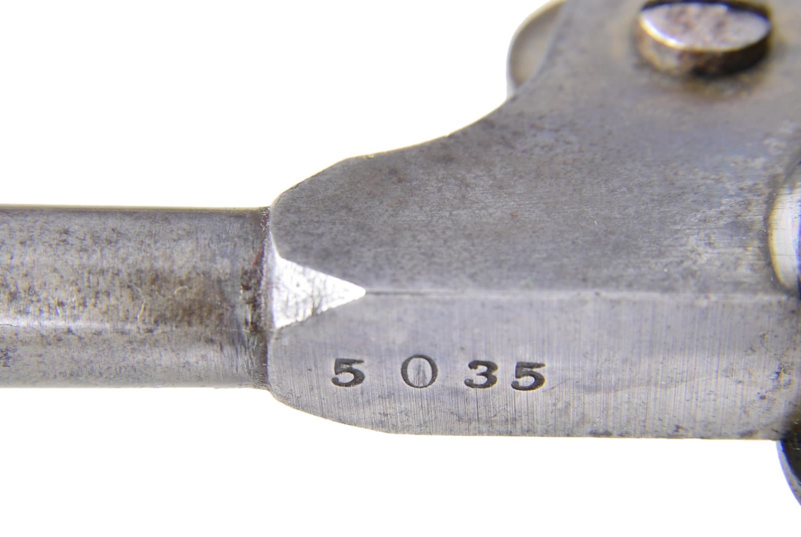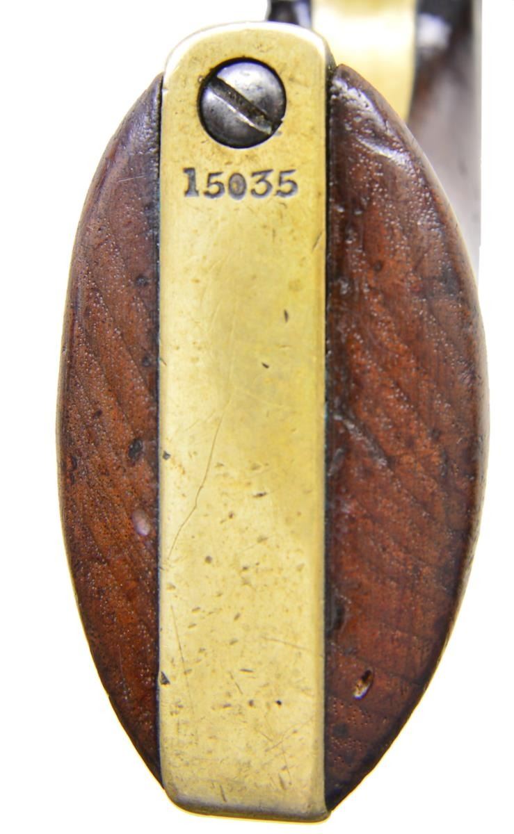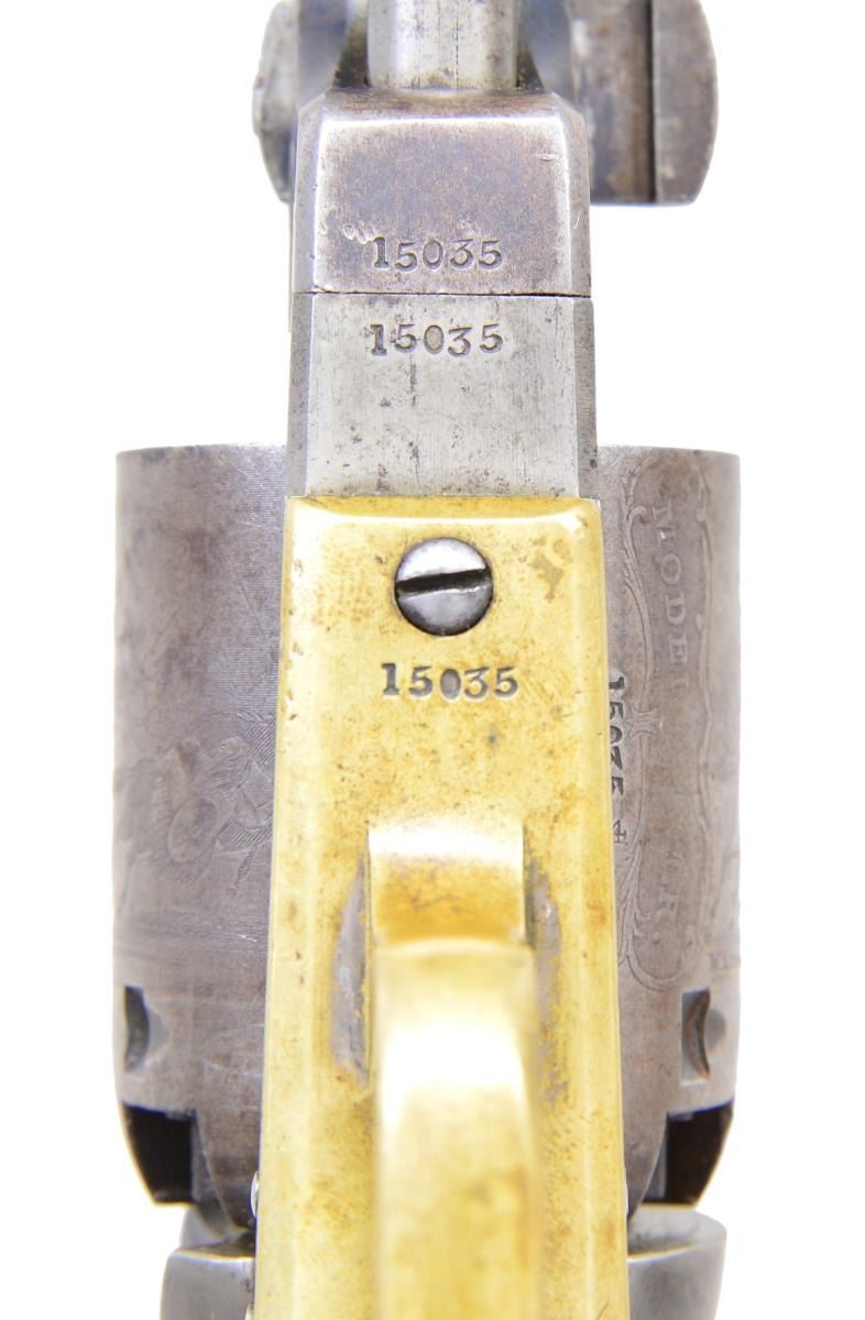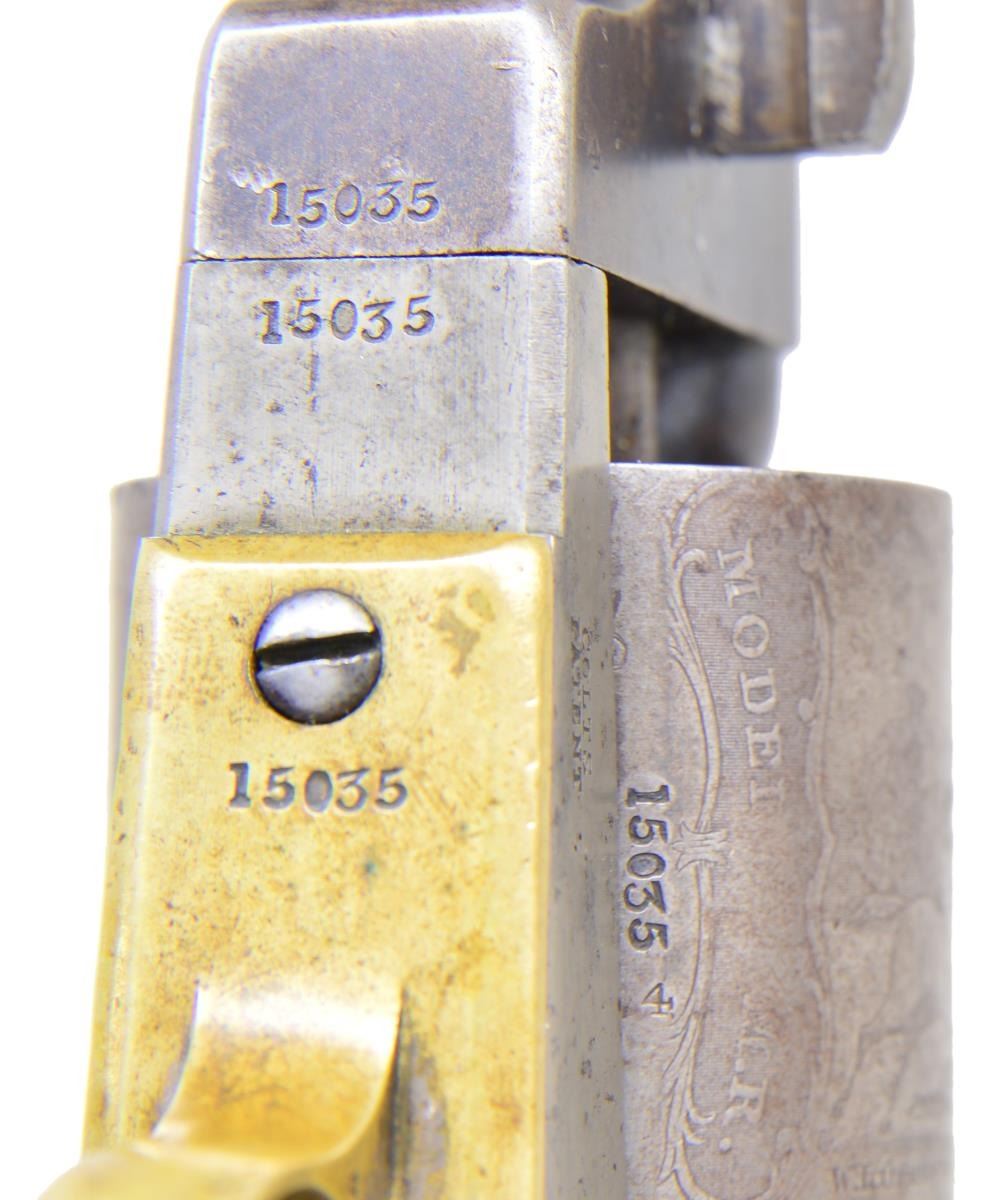 Cal. 44 Colt. S# 15035. Bbl. 7 1/2” round w/ octagon shank having the New York address. Round six shot cyl. with rectangular stop slots and Texas Ranger scene roll engraving. Blue finish with case colored frame, hammer & loading lever. Silver finished brass backstrap and round trigger guard. Bbl., frame, grip straps, cyl., loading lever & wedge have matching numbers. 1 Piece walnut grip. Total of 10,500 mfg. 1851-1861. Mfg. 1855. UNATTACHED ACCESSORIES: period style casing of fancy walnut with brass finished trim. Blue cloth fitted interior shows wear & fading. Case contains dragoon size patriotic themed flask, 2 cavity brass mold, oil bottle, cleaning rod, cap tin & case key. Also included is a six round package of combustible envelope cartridges, cal. 44-100. 1 Lid strap is loose on back end. CONDITION: fine overall. Bbl. retains 25% dull fading blue on its rear portion with a series of small dents on the right side around the wedge. Cyl. has faded to gray showing clearly visible scene. Frame & loading lever show a small amount of very light case colors. Grip straps show evidence of cleaning retaining only traces of silver finish. Grips show heavy wear and marks w/ added coat of finish. Sound mechanics. Bore retains sound rifling with spots of frosted appearance. (01-22836/JB). ANTIQUE. $8,000-12,000.