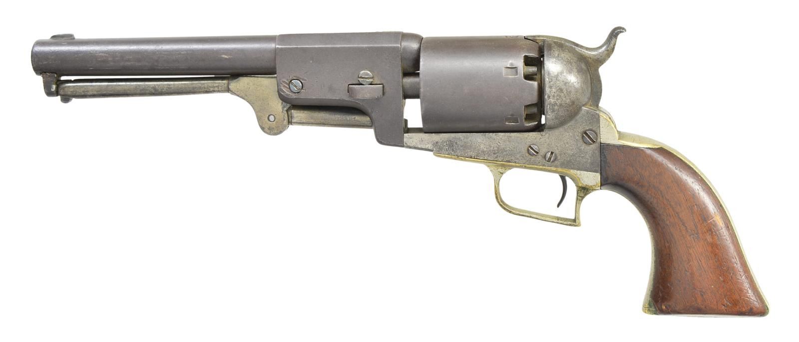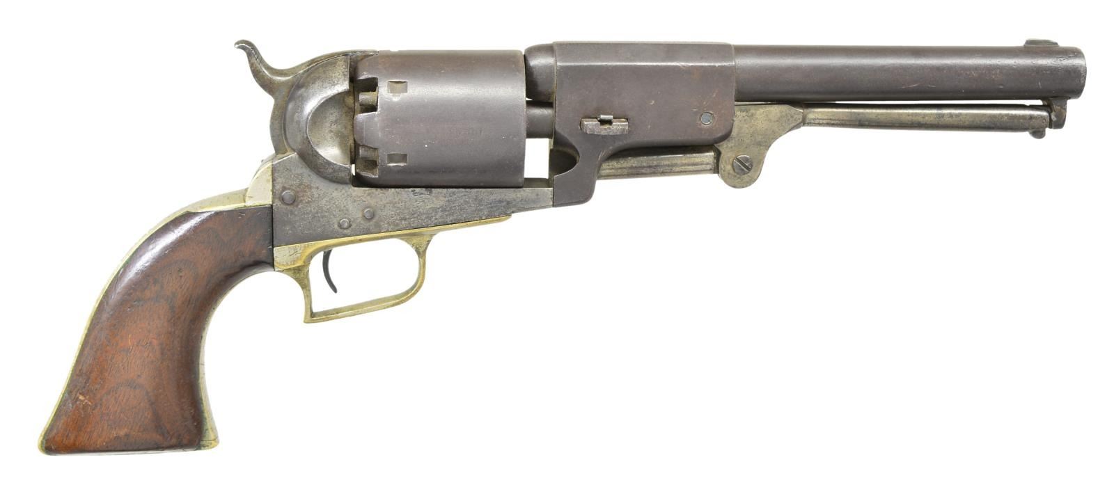 Cal. 44 . S# 10285. Bbl. 7.5". Standard configuration 7.5" round barrel & octagonal lug, 1-line Colt New York address, German silver blade front sight, left side of frame stamped "COLT’S / PATENT / U.S.", square back silver plated brass trigger guard & back strap, one piece walnut grips. This is an honest survivor that saw hard use. Less than 3000 2nd models made 1850-1851. CONDITION: good overall, all matching and complete, discernible markings, sight shortened, smooth iron patina on barrel & cylinder, mottled silver/gray frame, hammer, & loading assembly. Grips not numbered, leather shim, appears original to time of use, heavy wear, good fit to frame. Most of plating on grip fame intact. Mechanics functioning, good crisp rifled bore. PROVENANCE: Michael E. Bray estate collection. (01-23279/JS). ANTIQUE. $3,000-5,000.