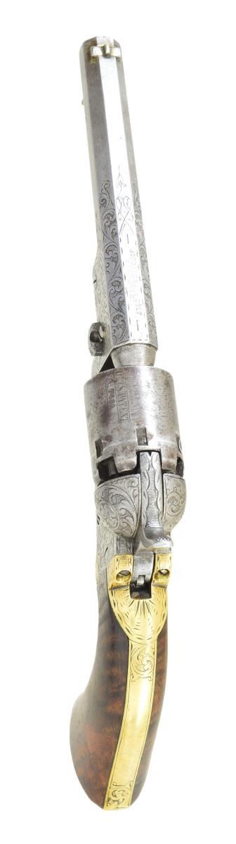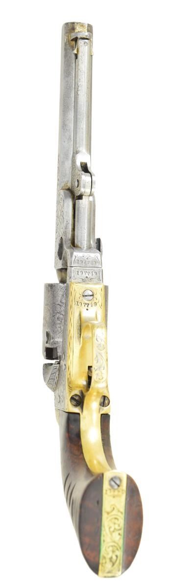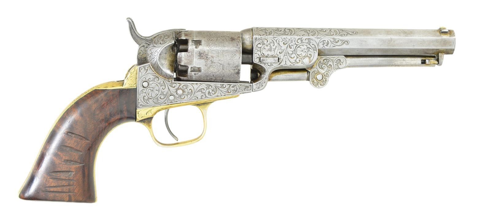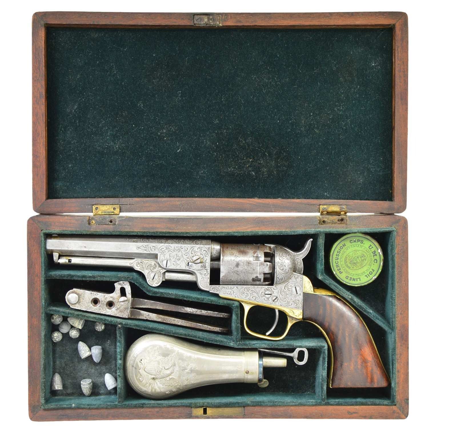 MODEL PERCUSSION REVOLVER. Cal. 31. S# 197749. Bbl. 5”. Standard configuration of 1862 manufactured Colt pocket, 5” barrel with 2-line Hartford address, small “COLT’S / PATENT” right side of frame. Frame, barrel, & grip straps factory engraved with Gustav Young style scrolls terminating in flowers and a “hounds head” of left side of barrel housing, varnished burl walnut grips. UNATTACHED ACCESSORIES: Dark green baize lined compartmented mahogany casing has silver plated eagle flask, 2-cavity “Colt’s Patent” iron mold, loose rounds, & cap tin, key. CONDITION: Revolver is very good overall, no finish, number match with exception of cylinder which is “7633”, mostly discernible rolled “Stagecoach Holdup” scene. Engraving & markings good, grips retain traces of original varnish. Casing hinges both missing screws to bottom, so lid is loose, key escutcheon is missing. Mold is pitted and fair, flask is very good, key does not function. Good rifled bore & mechanics are fine. (01-22975/JS). ANTIQUE. $3,000-4,000.