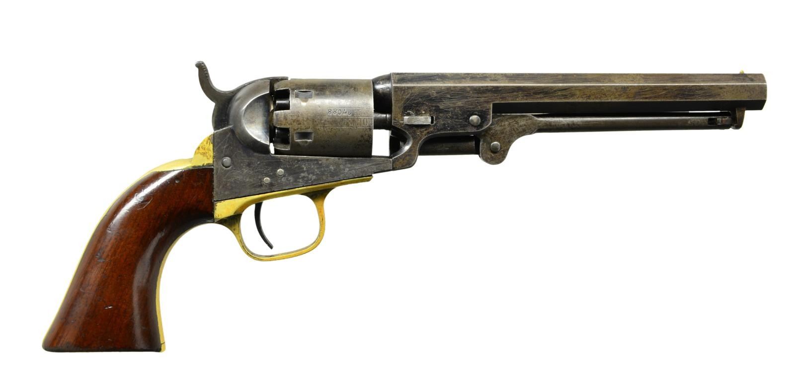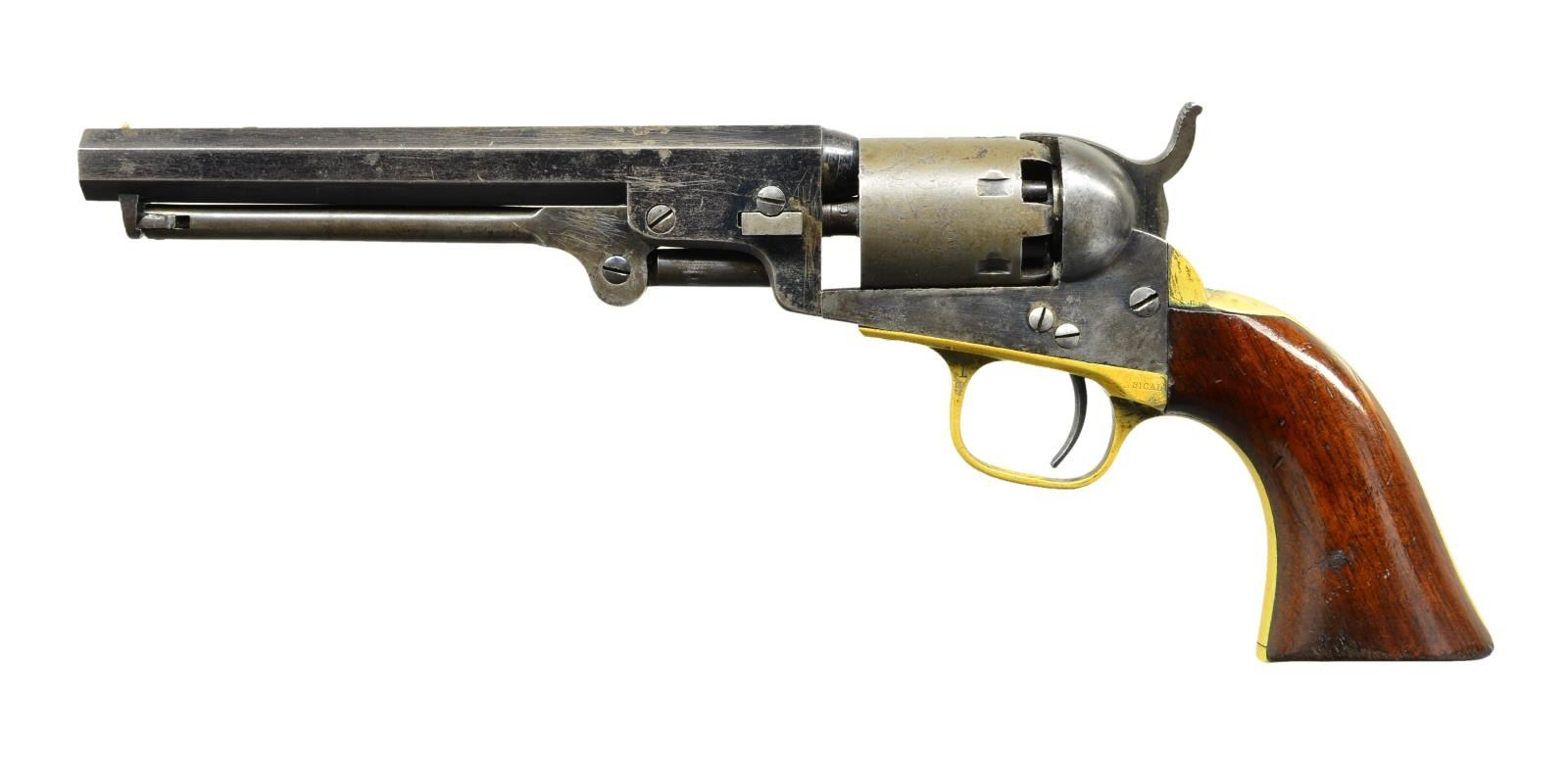 Cal. 31. S# 237068. Bbl. 6" octagon w/ New York address. Six shot round cyl. w/ stagecoach scene roll engraving. Blue finish w/ case colored frame, hammer & loading lever. Silver finished brass backstrap & large round trigger guard. 1 piece walnut grip. Bbl., frame, cyl., grip straps & wedge have matching numbers. Mfg. 1863 during the American Civil War. CONDITION: fine. Bbl. retains 50% blue w/ areas of fading & spots of corrosion. Cyl. has a gray appearance & retains largely visible scene. Action has 50% lightly faded case colors. Grip straps show traces of silver in protected areas & have acquired a pleasing white patina. Grips have worn original finish w/ small dents at bottom. Sound action. Bore retains strong rifling showing small spots of light pitting. (01-22976/DS). ANTIQUE. $1,500-2,500.