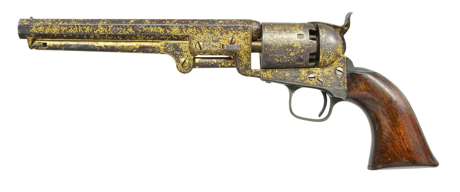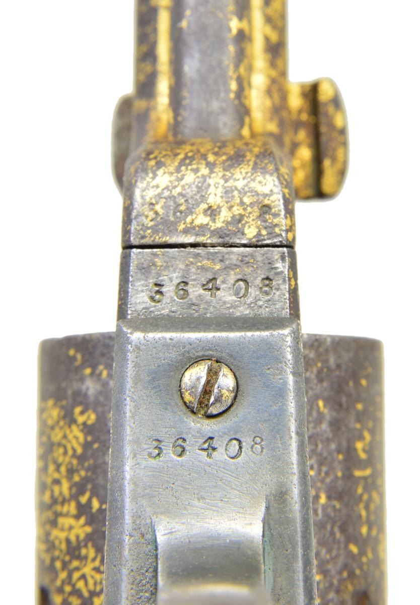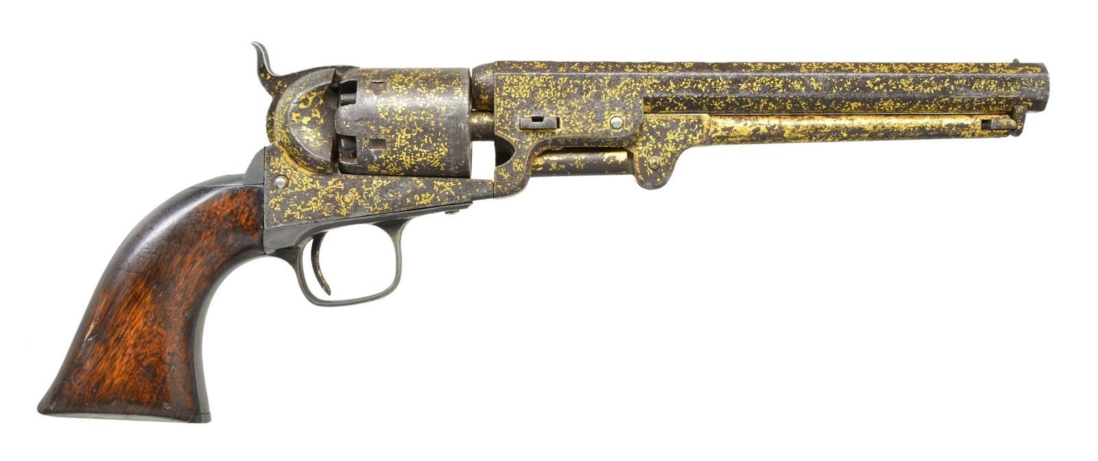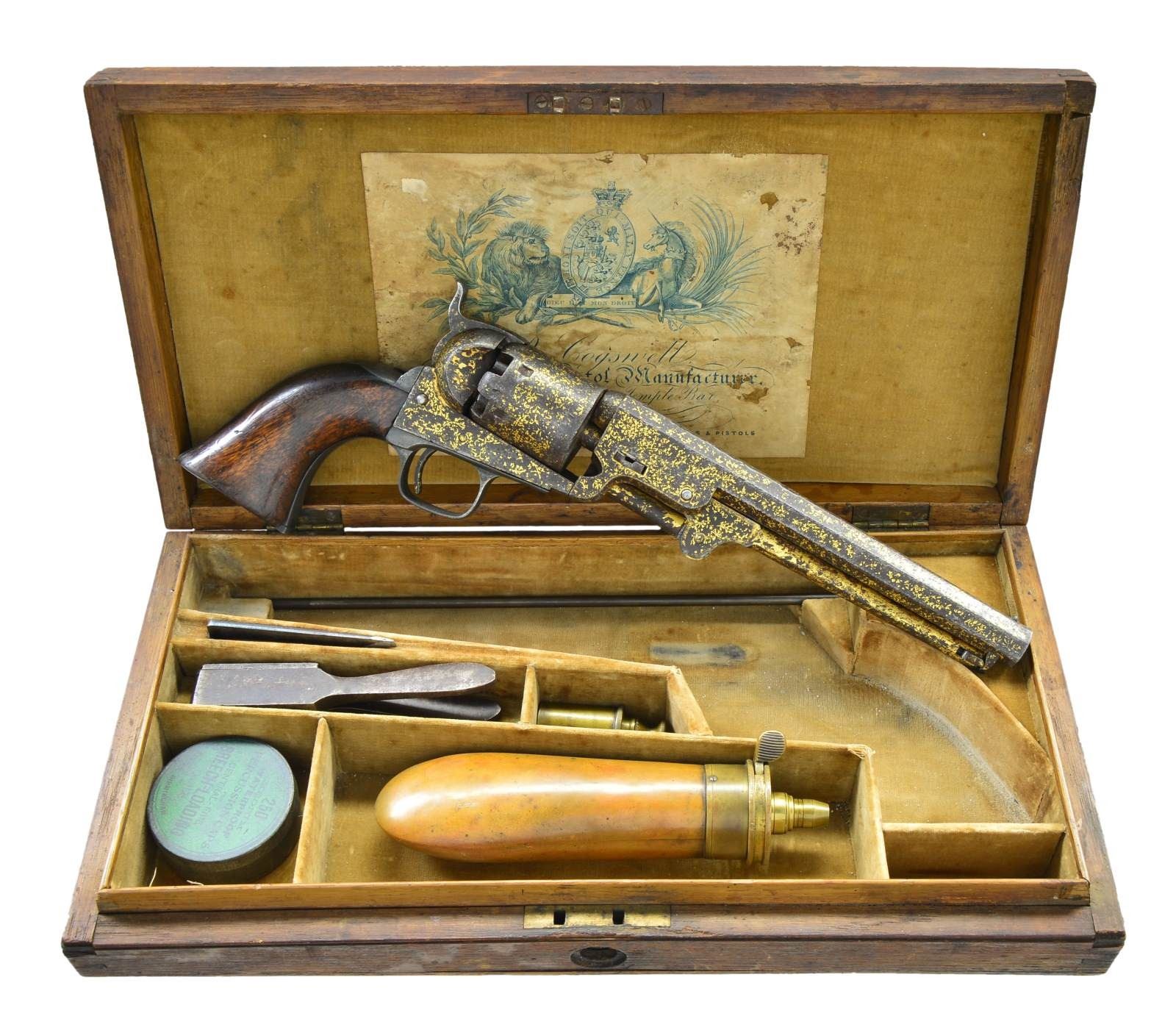 NAVY REVOLVER. Cal. 36. S# 36408. Bbl. 7 1/2" octagon w/ cone style front sight & London address. Round six shot cyl. Bbl. & cyl. have British proofs. Bbl., cyl. & frame have full coverage gold damascene engraving. 3rd model revolver w/ small round iron trigger guard. 1 piece walnut grips. UNATTACHED ACCESSORIES: Colt casing w/ faded fitted cloth interior. Inside of lid has B. Cogswell label w/ London address. Case contains powder flask, 2 cavity mold, nipple wrench, brass oil bottle, slotted tip cleaning rod & cap tin. Case is in fair condition, lid has full length crack down the middle. Case bottom shows cracks & chips. CONDITION: fair. Gun has general brown patina appearance retaining 60% gold damascene finish. Bbl. has heavy dents along top flat. Several action screws are replacements. Refinished grips show heavy wear & marks w/ chips at toe. Action is worn & will not hold at full cock. Dark pitted bore. (01-22871/JB). ANTIQUE. $4,000-6,000.
