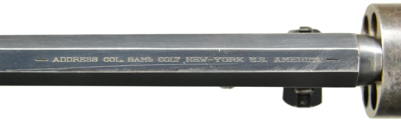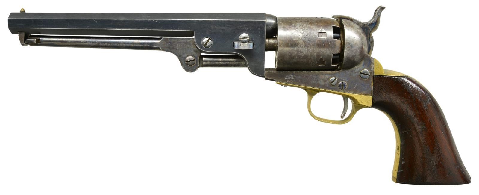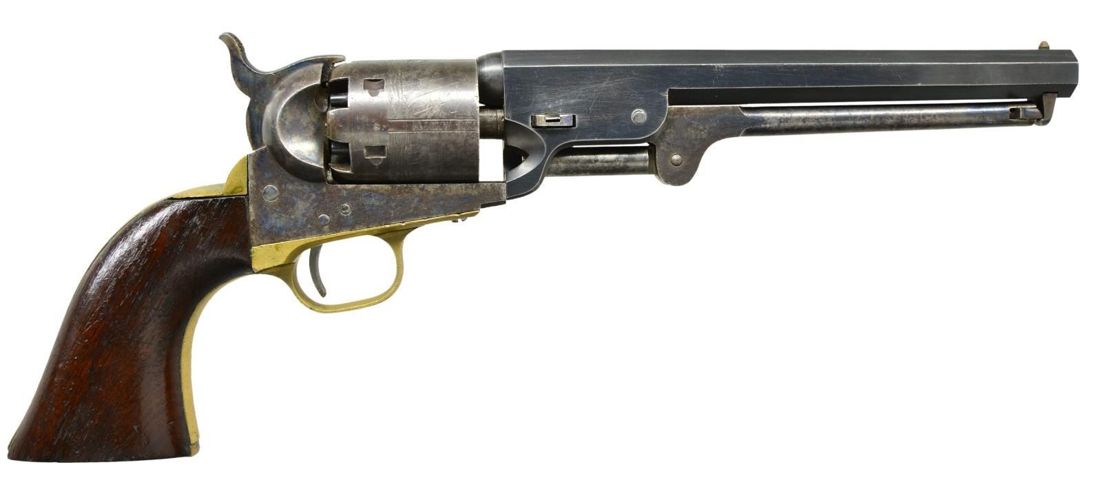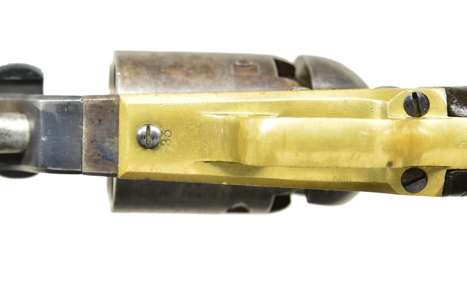 PARTS. Cal. 36. S# 35. Assembled from parts obtained from W. Stokes Kirk of Philadelphia, 1945-50. These unusual revolvers are described w/ a list of known S#s (1-120) on page 131 of “The Book of Colt Firearms” by R. L. Wilson. Photo in book is of S# “18” from the Robert Q. Sutherland Collection. Bbl. 7 1/2” octagon w/ New York address & cone style sight. Round six shot cyl. w/ naval engagement scene scroll engraving. Case colored frame is marked of left side “U.S.” beneath the Colt’s Patent marking. Backstrap & 3rd model round trigger guard have natural brass finish. Trigger guard has S# “35” w/ “K” inspection mark on the grip strap. Cyl. & trigger guard have inspection mark “H”. Loading lever is S#’ed “12”. Frame, bbl., cyl., backstrap & wedge are unnumbered. 1 piece walnut grips. CONDITION: very fine. Bbl. retains over 80% lightly faded blue showing edge wear. Cyl. has faded to gray showing spotted corrosion & retains very good scene. 60% case colored remains on the frame & fittings. Brass has acquired a mild patina. Grips have rough finish w/ spots of peeling & handling marks. Sound mechanics. Bore retains good rifling showing spots of light pitting. (01-22894/DS). ANTIQUE. $3,000-4,000.