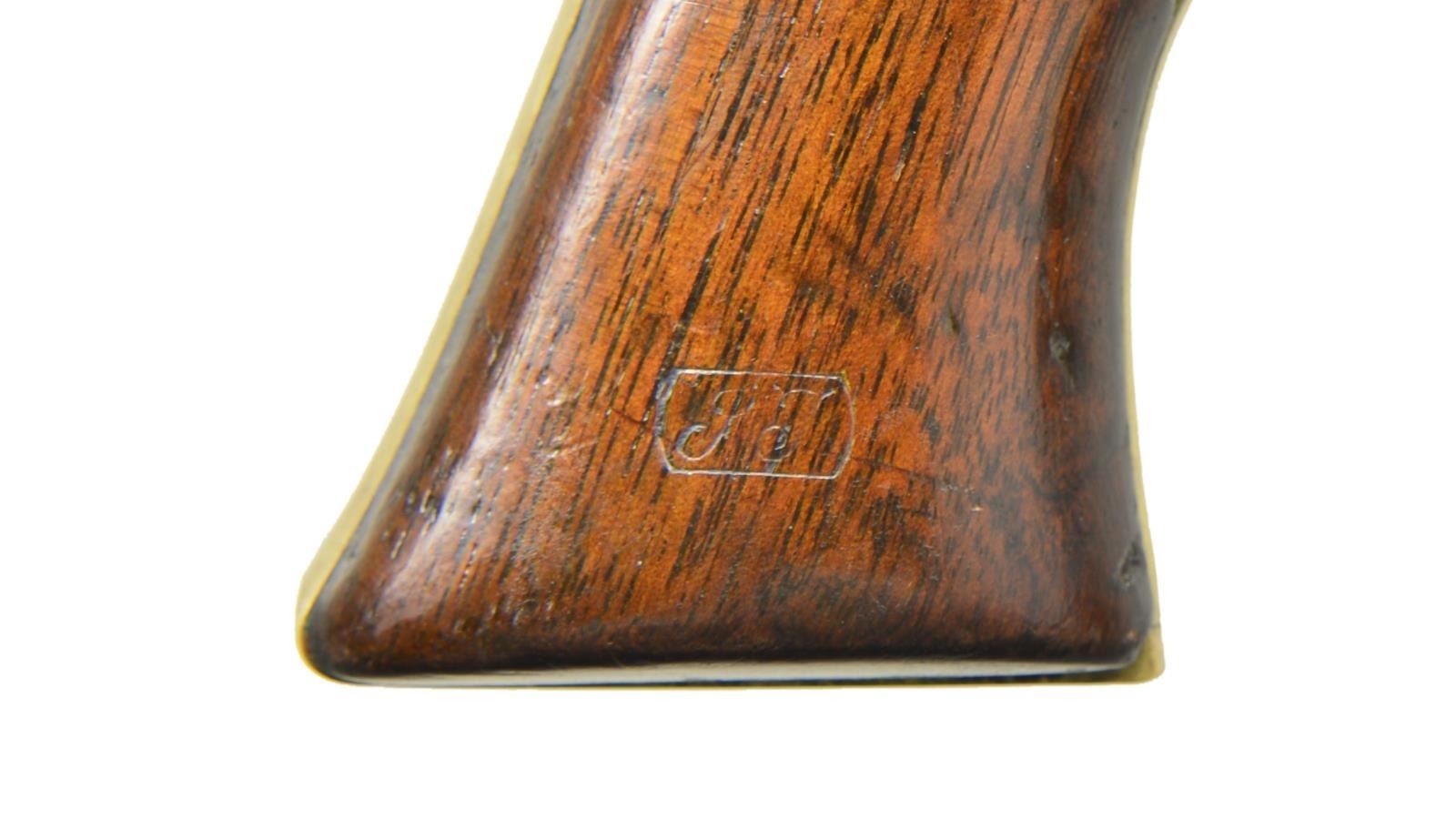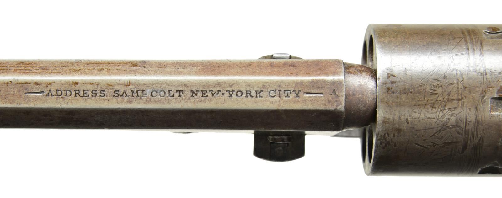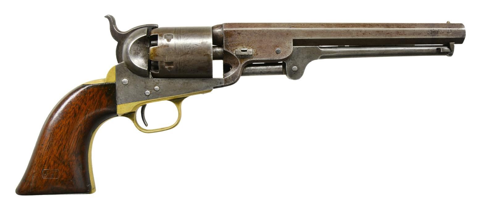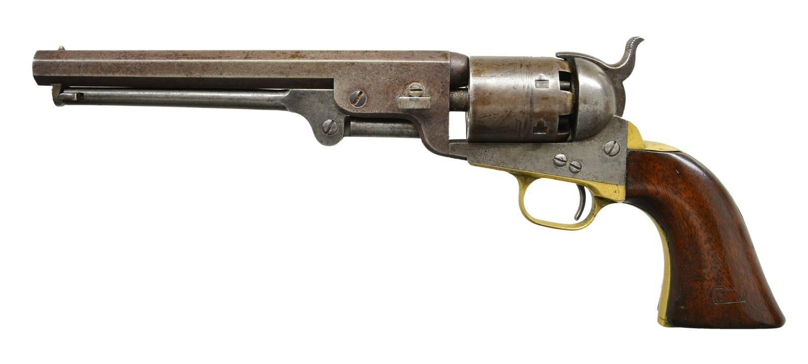 Cal. 36. S# 64040. Bbl. 7 1/2” w/ New York address & brass cone sight. Round six shot cyl. w/ naval engagement scene roll engraving. Left side of frame below patent marking is stamped “U.S.”. Inspection mark “M” is found on backstrap & small round trigger guard. Blue & case colored finish w/ silver finished brass grip straps. 1 piece walnut grip has partially visible cartouches on both panels. Mfg. 1857 Colt's 1st Navy Army Contract. CONDITION: good. Metal finish has faded to gray showing small marks. Cyl. has partially visible scene. Grip straps have faint traces of silver. Heavily sanded & refinished grips have chips & rounding at toe & heel. Bbl. exhibits some looseness on frame. Functioning action, cyl. has some side play. Bore retains largely intact rifling showing pitting near muzzle. (01-22892/JB). ANTIQUE. $2,000-3,000.
