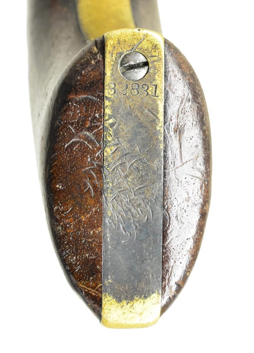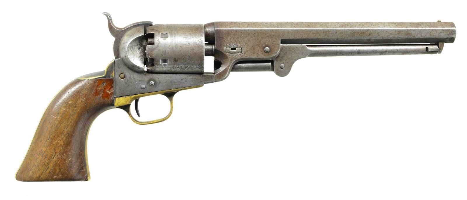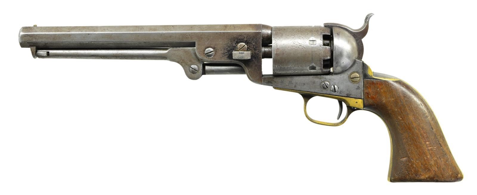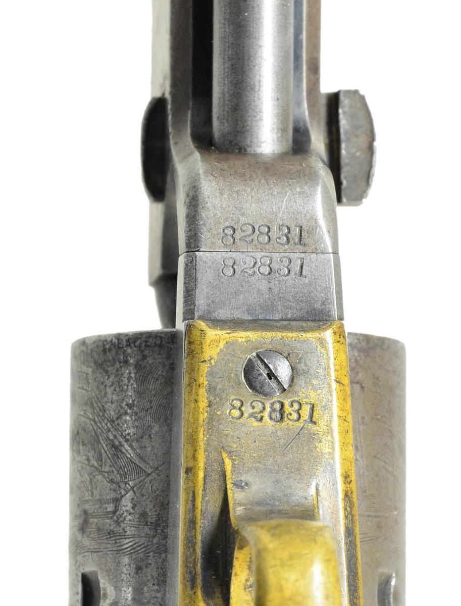 Cal. 36. S# 82831. Bbl. 7 1/2" octagon w/ Hartford address. Round six shot cyl. w/ naval engagement scene roll engraving. Blue & case colored finish w/ silver finished brass backstrap & small round trigger guard. 1 piece walnut grips. Bbl., frame, grip straps, cyl., loading lever & wedge have matching numbers. Mfg. 1857. CONDITION: bbl. retains traces of fading blue w/ dents around the wedge. Muzzle is rounded. Wedge spring is broken. Cyl. has faded to gray showing light pitting & retains 75% scene. Action has faded to gray. Grip straps have 20% silver finish w/ a dark tarnish. Grips show heavy wear & handling marks. Butt of gun has a series of dents. Action is out of time. Cyl. is not indexing properly. Lightly pitted bore retains sound rifling. (01-22973/DS). ANTIQUE. $1,000-1,500.