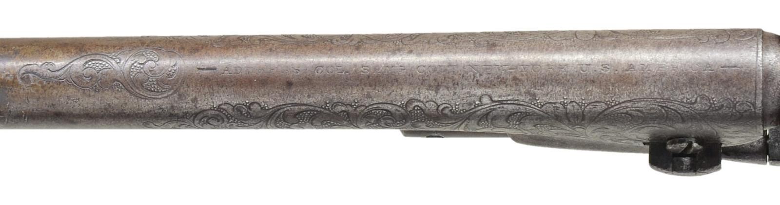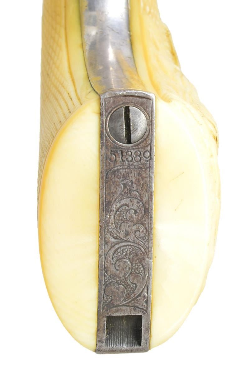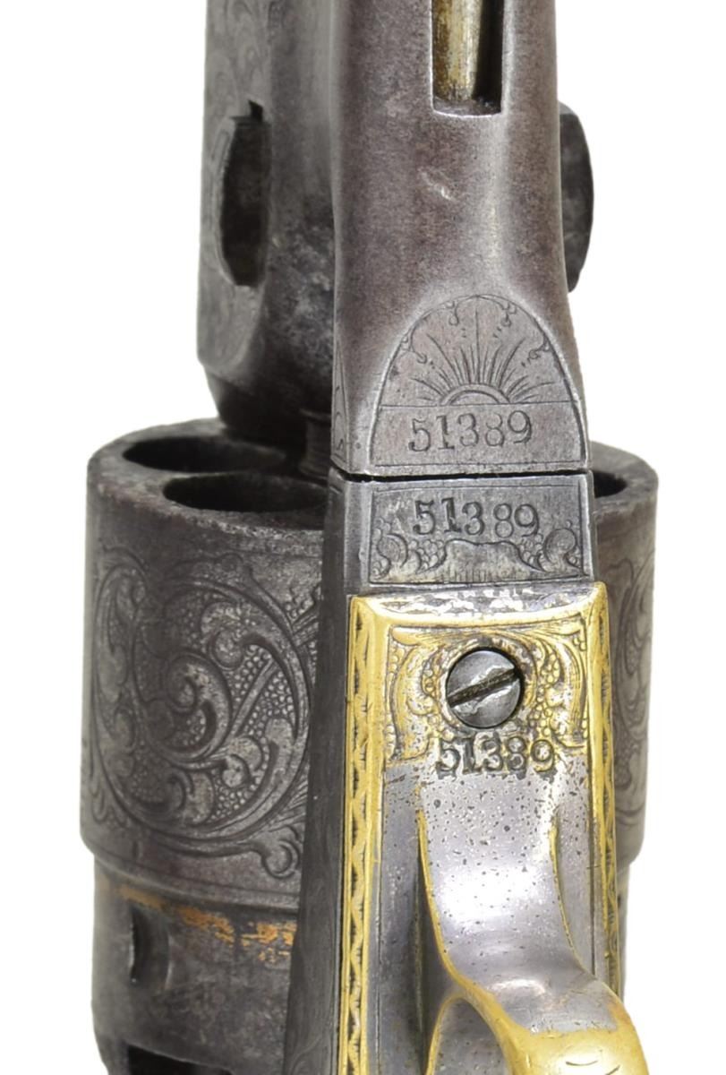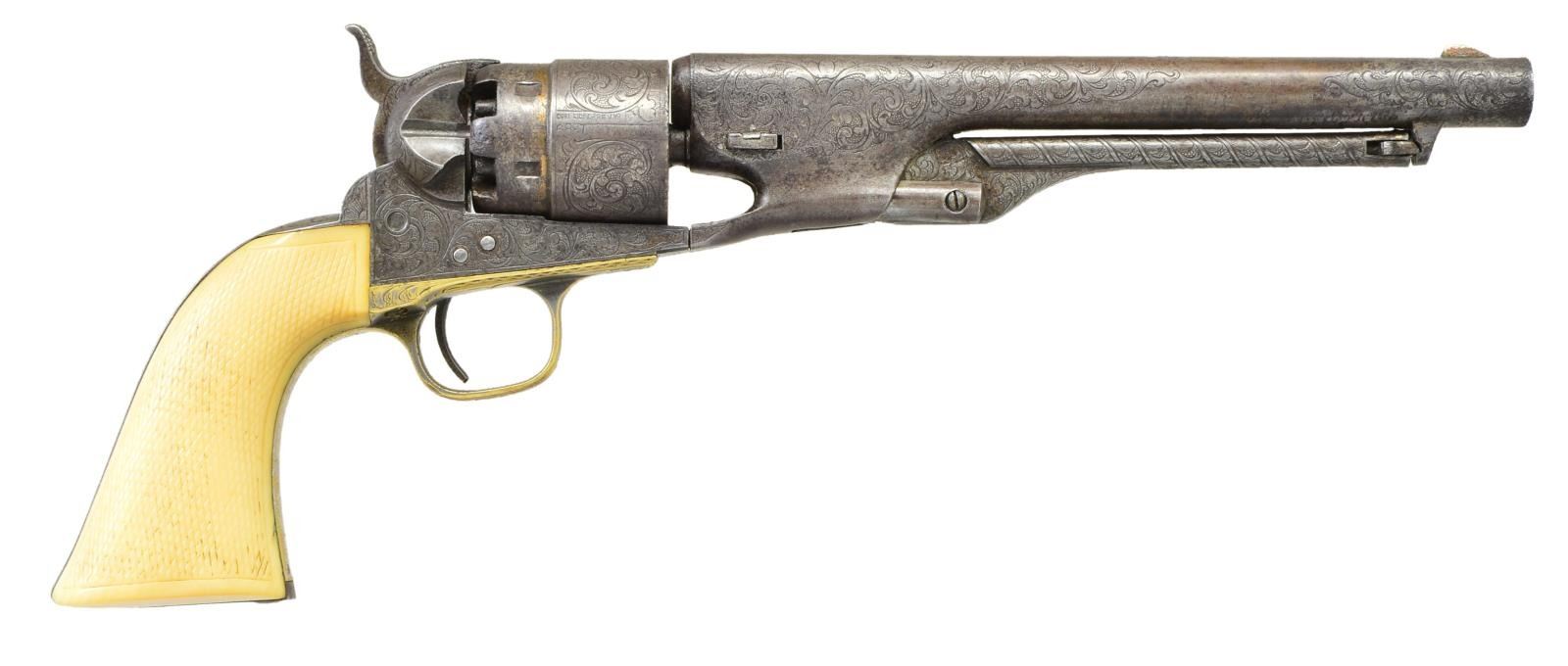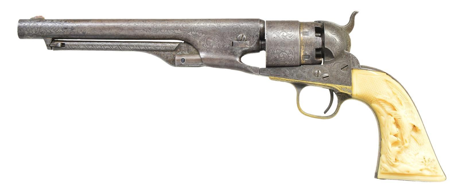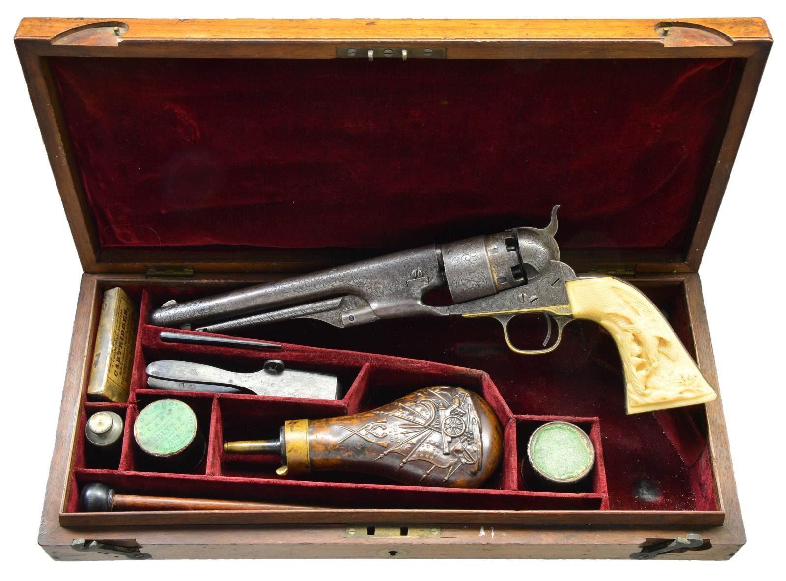 Cal. 44. S# 51389. Bbl. 8" round w/ German silver blade front sight. Gold finished six shot round rebated cyl. Iron backstrap w/ silver finished brass trigger guard. Bbl., cyl., frame, grip straps & loading lever have 75% coverage of New York style vine type foliate scroll w/ punch dot backgrounds. Bbl., frame, grip straps, cyl. & wedge have matching numbers. Frame & backstrap have provisions for shoulder stock attachment. 1 piece grip of checkered Ivory. Right panel has exquisite deep relief carving of a bald eagle & nest of 3 fledglings. Mfg. 1862, during the American Civil War. UNATTACHED ACCESSORIES: period wood casing w/ marbled walnut lid having circular medallion. Fitted burgundy interior. Case contains powder flask, 2 cavity mold, nipple wrench, German silver oil bottle, wood cleaning rod w/ ebony ball handle, cap tin & round balls. Also contains a wrapped package of six combustible envelope cartridges, cal. 44-100. CONDITION: bbl., frame, loading lever & backstrap have faded to a pleasing antique gray appearance showing some very light pitting. Cyl. retains a ring of remaining gold finish in rebated area. Trigger guard has 50% silver finish. Grips show light checkering wear w/ well preserved carving. Sound action. Bore shows scattered pitting & retains strong intact rifling. (01-22829/JB). ANTIQUE. $7,000-10,000.