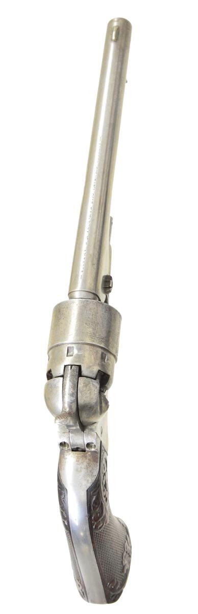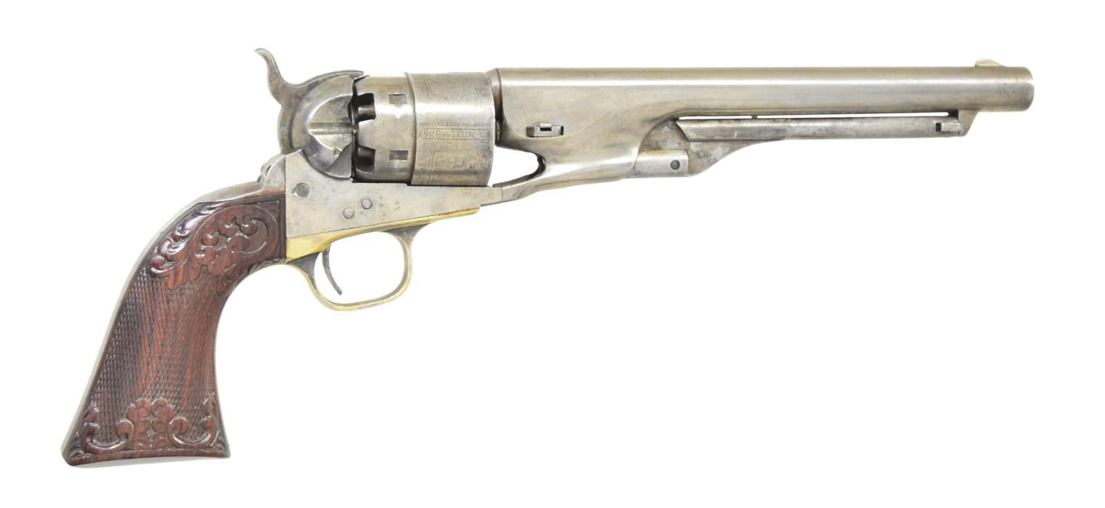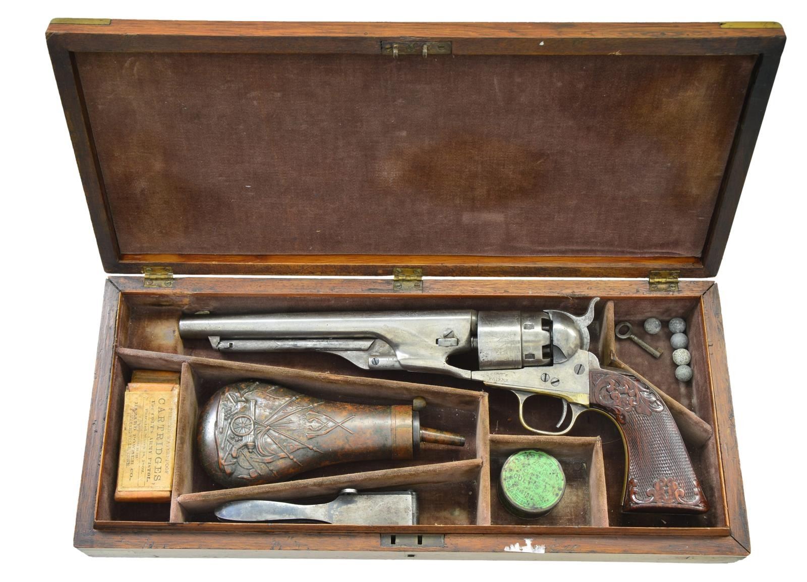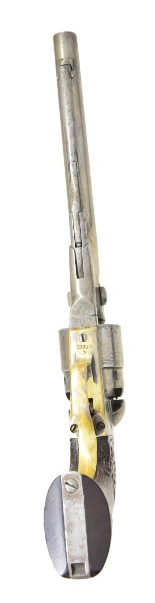 Cal. 44. S# 123357. Bbl. 8” round w/ German silver blade front sight & standard New York address. Round rebated six shot cyl. w/ naval scene roll engraving. Left side of frame has hand engraved “COLT’S/PATENT” marking. Forward portion of loading lever has hand matted finish. 1 Piece rosewood grips have relief foliate carving above & below checkering. Blue & case colored finish w/ silver finished brass trigger guard. Bbl., frame, grip straps, cyl. & wedge have matching numbers. “P” is found above or below S#s on bbl., frame & grip straps. Mfg. 1863 during the American Civil War. UNATTACHED ACCESSORIES: wood casing has oval brass nameplate & lid marked “A.J. Banker M.D.”. Case contains powder flask, 2 cavity mold, cap tins, round balls & case key. Also included are 2 six round packages of pressed waterproof cartridges. Case exterior shows lightly worn finish w/ scratches & marks. Cloth interior has faded appearance w/ wear spots. CONDITION: metal retains traces of finish w/ balance having a pleasing silver gray patina. Brass trigger guard is largely bright retaining 10% silver. Very good grips show small handling marks & chips around butt. Sound mechanics. Bore retains sound rifling showing scattered light pitting. (01-22827/DS). ANTIQUE. $5,000-7,000.