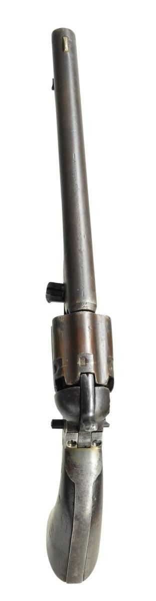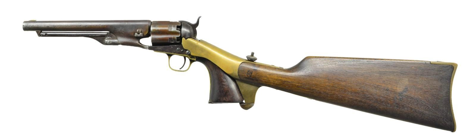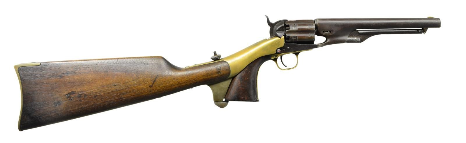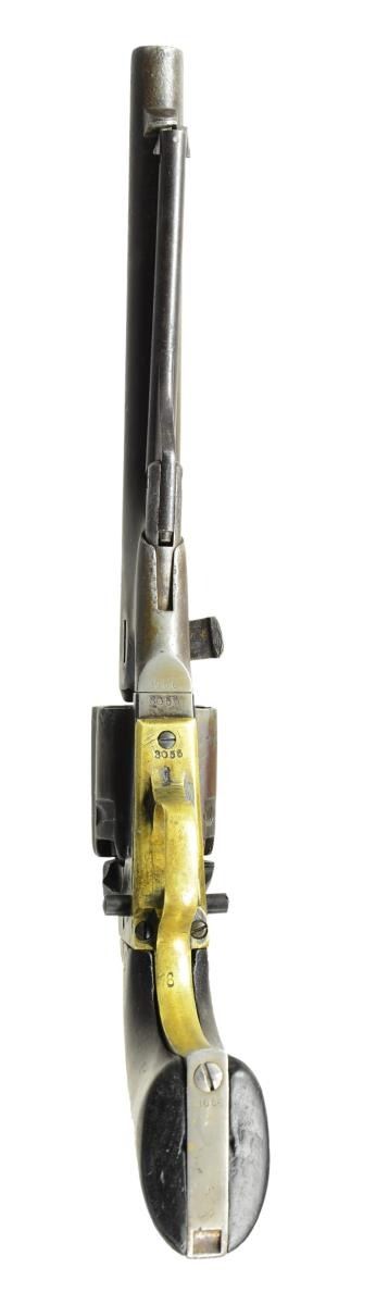 STOCK. Cal. 44. S# 3056. Bbl. 8” round w/ New York address & German silver blade front sight. Full fluted six shot cyl. Four screw action w/ recoil shield cut for stock attachment. Iron backstrap w/ brass trigger guard. Front grip strap & both sides of trigger guard are stamped w/ “6”. 1 piece walnut grip, left panel has cut marking that appears to read “PIN”. Bbl., frame, grip straps & wedge have matching numbers. Total production of the fluted cyl. army’s is estimated at 4,000. UNATTACHED ACCESSORIES: added shoulder stock with an artificially aged apperance. Buttplate peak, lower tang, inside of lower tang & stock channel are marked w/ S# “1991”. Cartouches “CG” are found on top of yoke & buttplate. Inspector’s mark “H” is found on lower tang. Comb of stock is stamped five over partially legible inspection mark. Toe line of stock behind tang is stamped “V”. Right ear of stock has a visible cartouche. Shoulder stock is housed in a period style trade casing w/ brass shield in lid have brass corners & trim. Red cloth fitted interior shows fading & wear. Other accessories include navy size American eagle powder flask w/ patriotic themed engraving, 2 cavity bullet mold, nipple wrench, cap tin, case key & round balls. Also included in an empty package for six combustible envelope cartridges. CONDITION: metal finish shows a dark brown patina w/ scattered pitting. Trigger guard shows traces of silver finish having a dark patina appearance. Grips show heavy wear & dents w/ chips at butt. Action is worn, cyl. does not index properly. Bore retains sound rifling showing scattered pitting. (01-22838/JB). ANTIQUE. $3,000-5,000.
