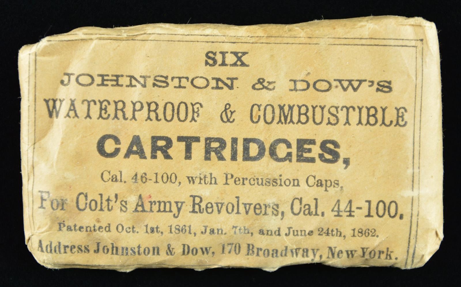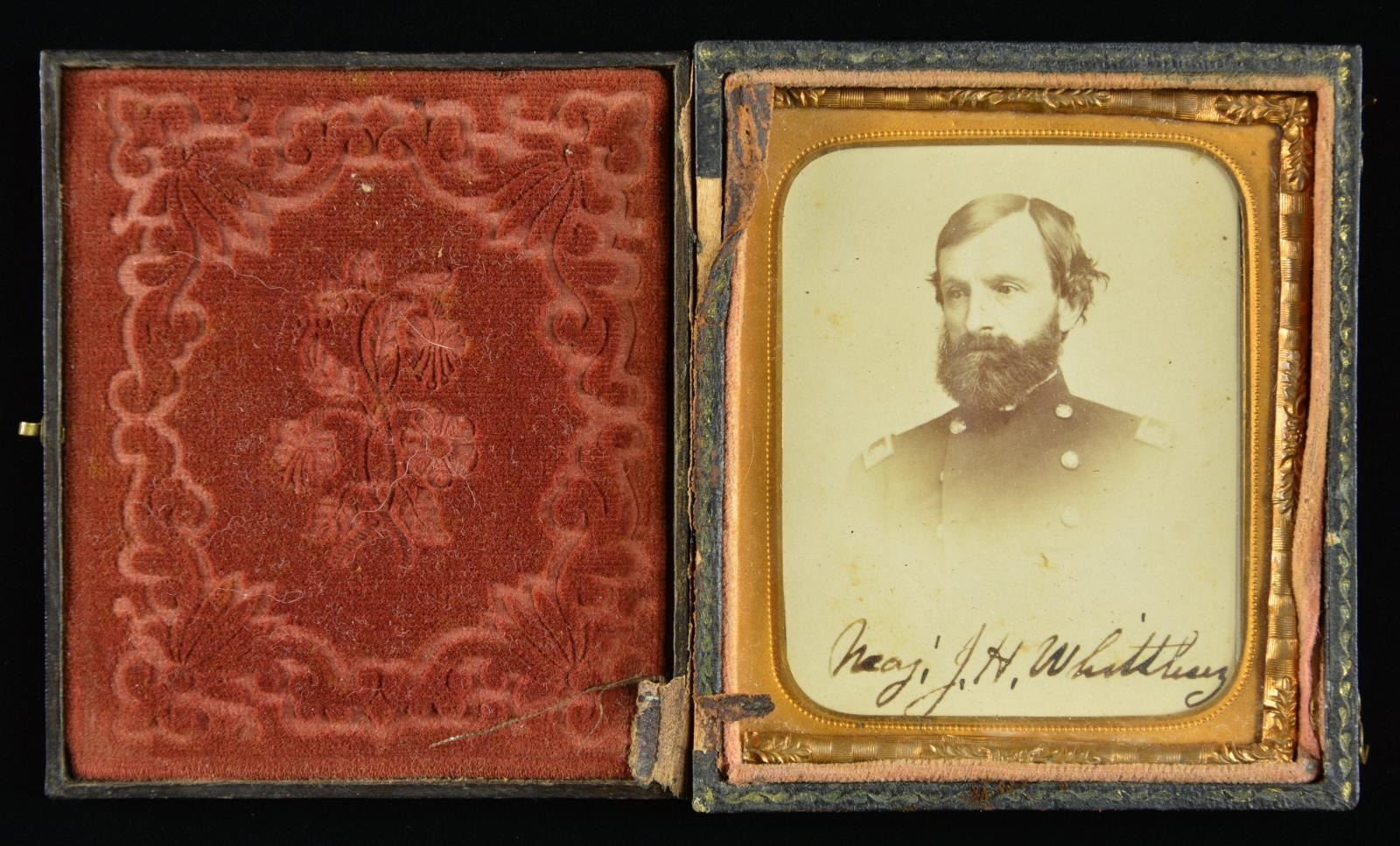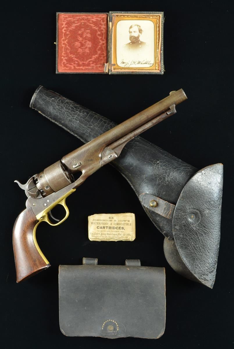 BOX, CARTRIDGES & SIGNED CDV, MAJOR JOSEPH HOTCHKISS WHITTLESEY, 5TH US CAVALRY. Cal. 44. S# 44029. Standard configuration Colt model 1860 Army revolver made in 1862 for US Amry, along with holster and pistol cartridge box with early paper pack of pistol cartridges. Consignor stated all this came together along with signed CDV cut down to fit sixth plate tintype case. Revolver and accoutrements are all in very nice original condition. Joseph Hotchkiss Whittlesey (1821-1886) Born in NY, USMA graduate 1844, Mexican War 2nd US Dragoons, captain in 5th US Cavalry when war began, promoted to major November 11, 1861, captured at Gaines Mill and exchanged September 21, 1862, retired from field service November 30, 1863 due to exposure in prison and long field service. CONDITION: revolver is very good overall, complete & matching throughout, traces of finish in protected areas, sharp edges and markings, grips well fit with fair cartouches. Mechanically fine, good rifled bore. Pistol cartridge box is very good. Pack of 6 .44 cartridges very good, scuffed edges. Holster is sound and solid with repaired tab, craquelure, broken seam. Photo case has broken hinge, image is very good with good signature. (01-23027/JS). $3,000-5,000.