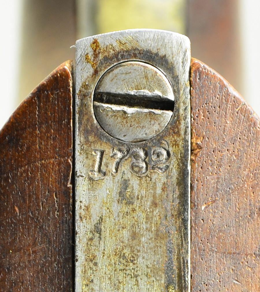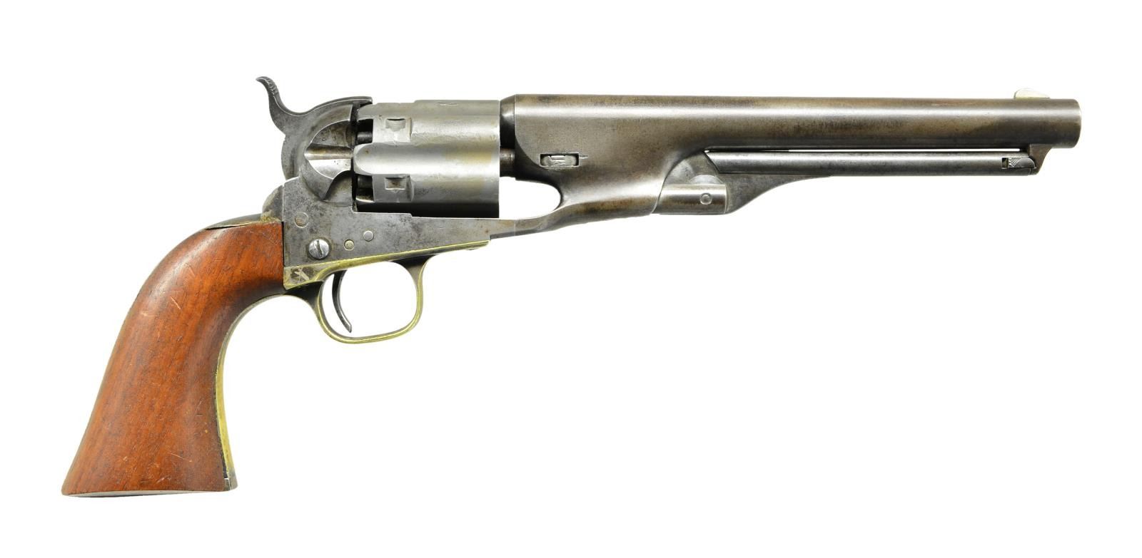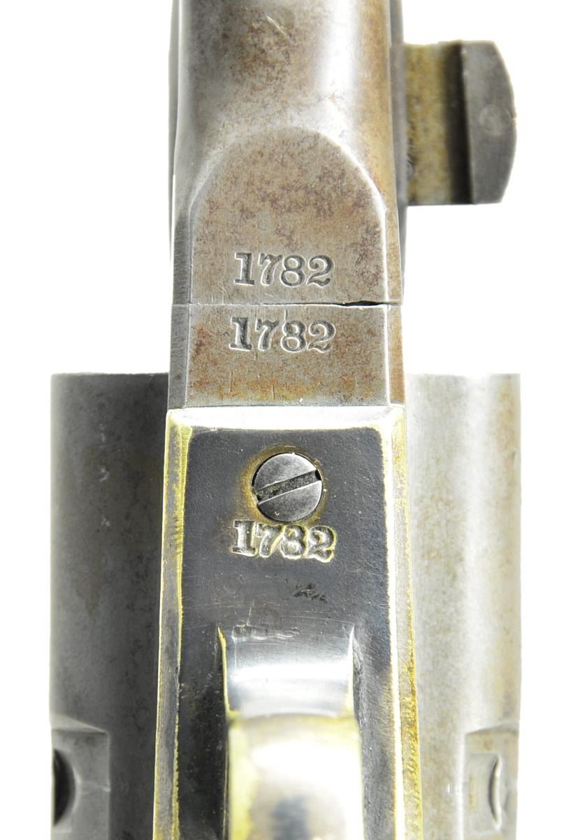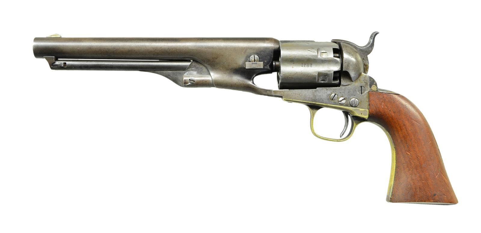 Cal. .44 S# 1782. Standard configuration of the newly introduced Colt 1860 army revolver, 4-screw frame made for shoulder stock, fluted cylinder with patent markings on one flute and S# opposite flute, small "COLT’S / PATENT" left side of frame. One line Hartford address. Many guns in this serial range were shipped South. CONDITION: good to very good overall, appears original and complete. All matching except wedge which is "5296". Metal cleaned, traces bright blue in protected area of barrel lug, overall gray pin pick pitted patina, crisp S#s, discernible address and patents. Grips probably replaced as they appear better than rest of gun, unmarked and never varnished. Triggerguard & backstrap retain some replated silver. Mechanically fine, bright shiny bore. (01-23280/JS). ANTIQUE. $3,000-5,000.