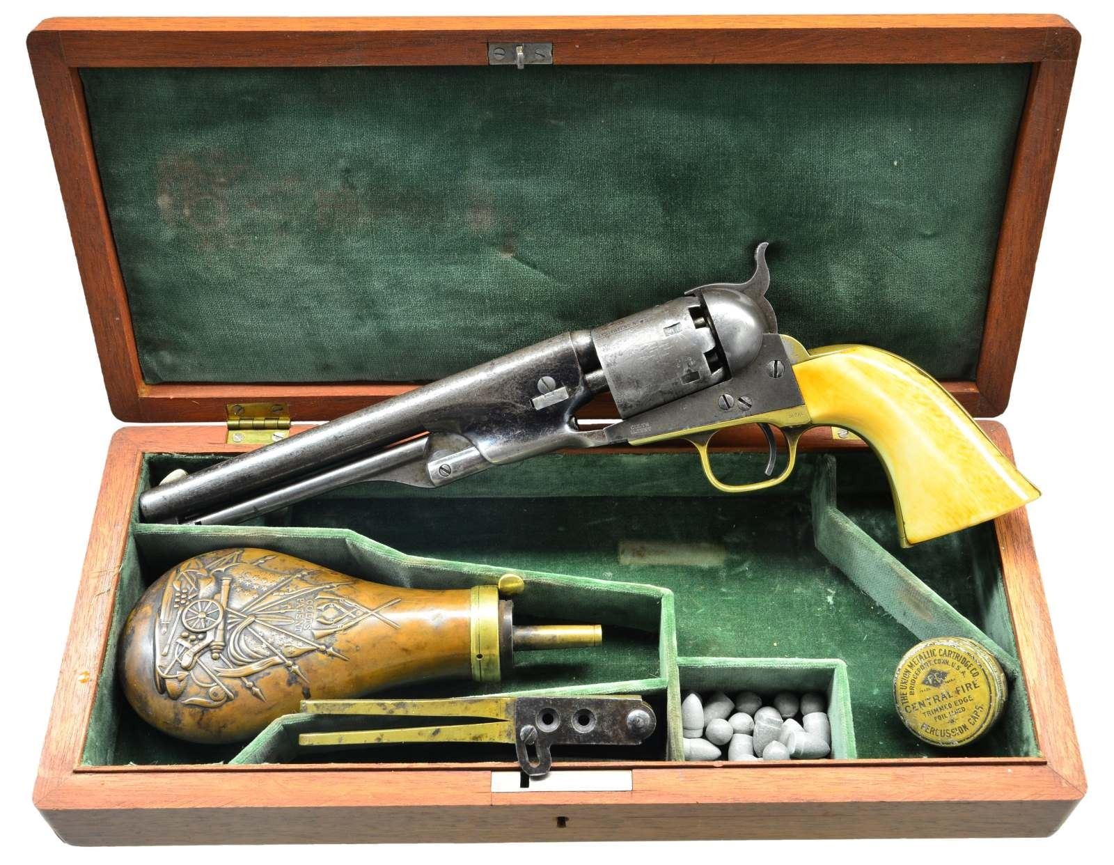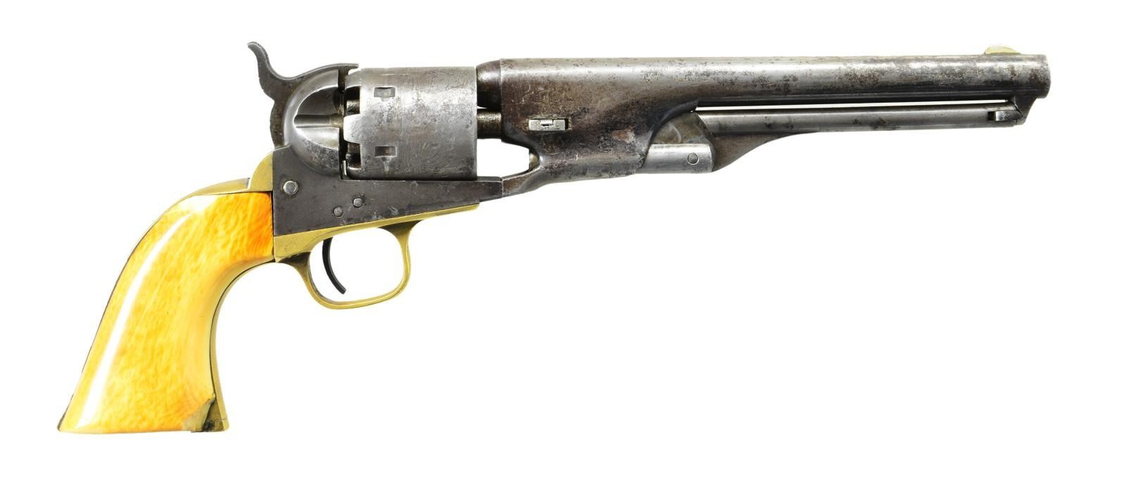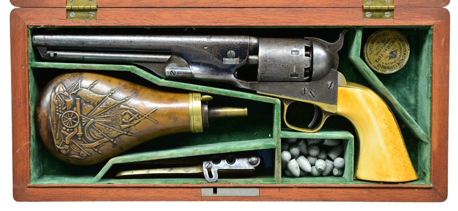 Cal. 36. S# 27053. Bbl. 7 1/2" round with New York address. German silver blade front sight. Round 6 shot cyl. has naval engagement roll engraving. Blue & case colored finish. Silver finished trigger guard & backstrap. 1 Piece ivory grips. Barrel, frame, grip straps, cyl & wedge have matching numbers. Mfg. 1865. UNATTACHED ACCESSORIES: added contemporary hardwood casing with brass rectangular nameplate on lid. Segmented interior with green cloth lining that shows wear. Case contains "Colt's Patent" marked Naval sized flask with Patriotic themed ornamentation. Flask has acquired a dark patina & shows light dents. Also included is a 2 cavity brass mold, turnscrew, bullets, round balls, cap tin, replacement screws & case key. Chip from toe of right grip panel is safely stored in the case. CONDITION: very good. Bbl. retains 40% lightly faded blue in protected areas fading to gray showing scattered corrosion with small dents in wedge area. Cyl. has faded to gray showing spots of light corrosion & 90% Naval scene. Frames & sides of hammer show faint traces of case colors. Grip straps show small amounts of silver in protected areas acquiring dark tarnish around trigger guard bow. Grips are slightly undersized with pronounced age related yellowing having grain checking at butt. Right panel is chipped at toe. Sound action. Lightly pitted bore retains strong rifling. (01-22270/DS). ANTIQUE. $3,000-5,000